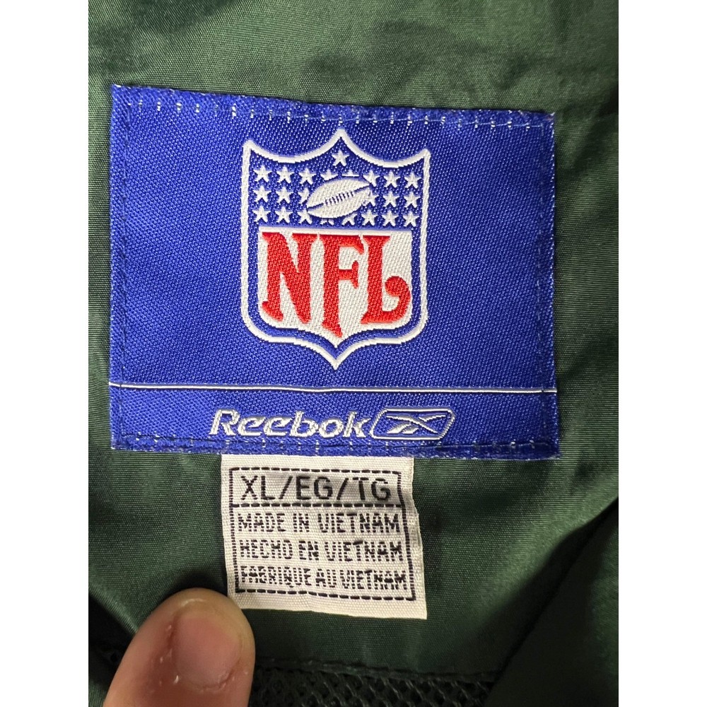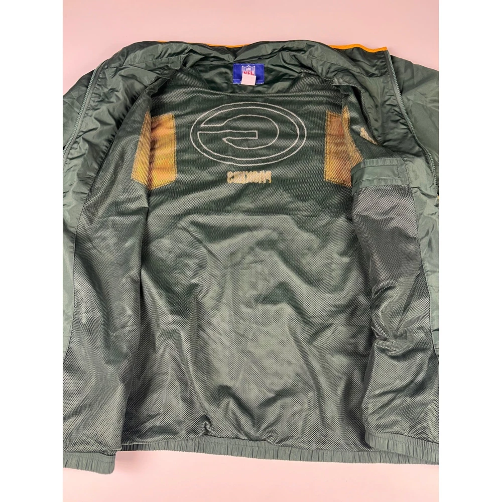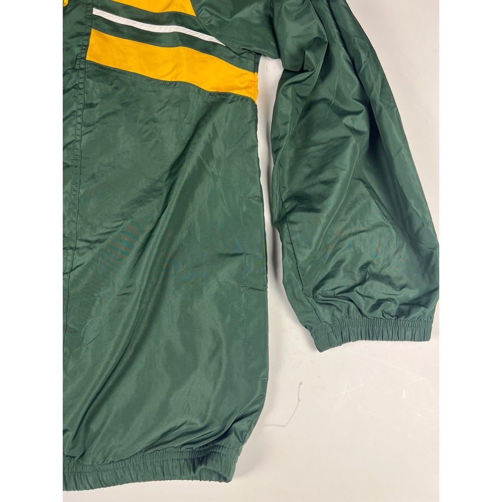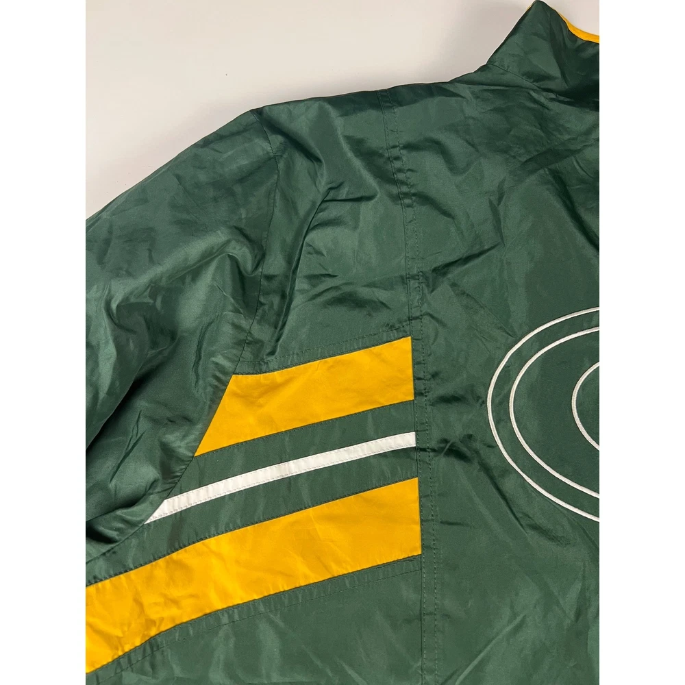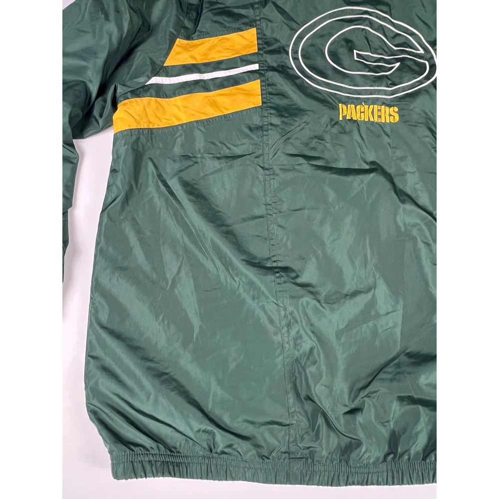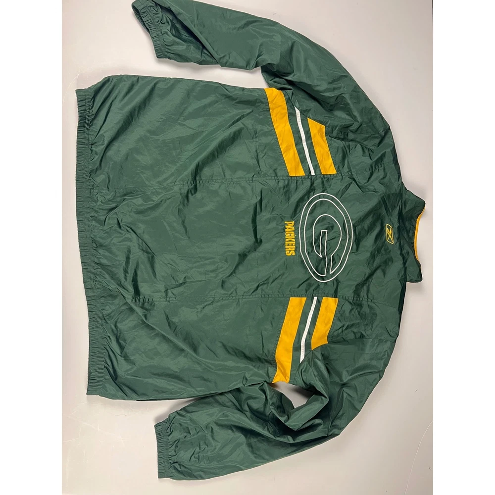 Elevate your game day look with this vintage Green Bay Packers windbreaker. This classic piece features the iconic Packers colors and logo, making a bold statement of team pride. From the spirited chest embroidery to the sporty shoulder stripes, every detail embodies the energy and excitement of Lambeau Field. Perfect for layering on cool autumn evenings or showcasing your team spirit at tailgates, this windbreaker will be your go-to for showing your love of the Green and Gold. Its lightweight construction makes it ideal for active outdoor pursuits like hiking or casual strolls around town. Embrace the spirit of the game with this timeless piece. Type: Jacket Style: Windbreaker Outer Shell Material: Polyester Department: Men Color: Green Lining Material: Nylon Insulation Material: Polyester Features: Wind-Resistant, Collared, Lined, Lightweight, Packable Accents: Logo, Embroidered, Zipper Pattern: Striped Model: Reebok NFL Windbreaker Keywords: Reebok, NFL, Green Bay Packers, Windbreaker, Jacket, Vintage, Retro, 90s, Sports, Football, Team Apparel, Green, Yellow, XL, Mens
