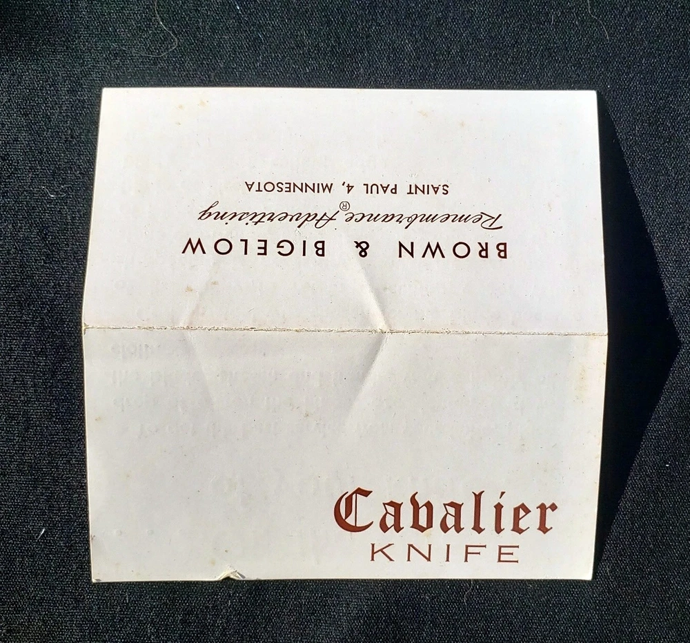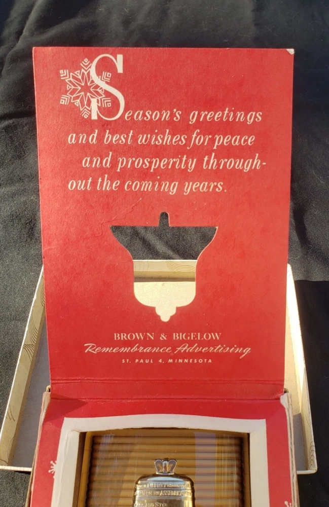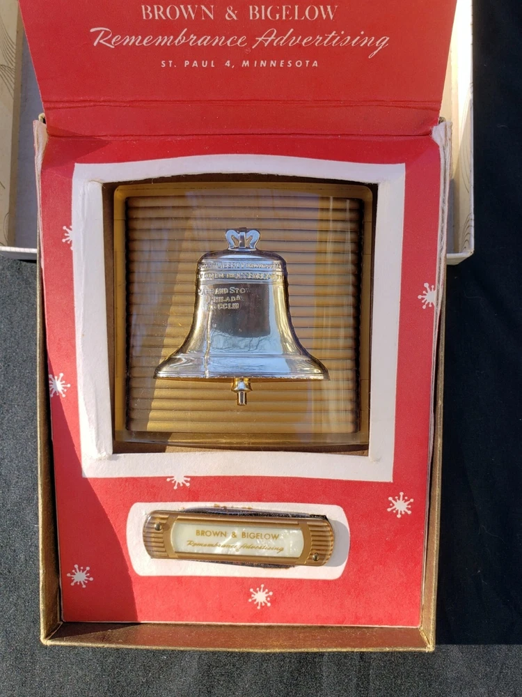 Vintage Paperweight and Pocket Knife in Original Box. Box has wear and a stain,insert has wear marks also, believe that these items were never used. The Paperweight is Brown on the bottom, Gold on the top with Clear over the Gold. It has the Liberty Bell on the front and the back has dates when the Liberty Bell rang. It is marked Remembrance B&B (Brown & Bieglow) St. Paul, MINN. U.S.A. It is approximately 3 1/4" x 3 1/8". The Paperweight is in Very Good Vintage Condition. Pocket Knife has not been removed from the box.