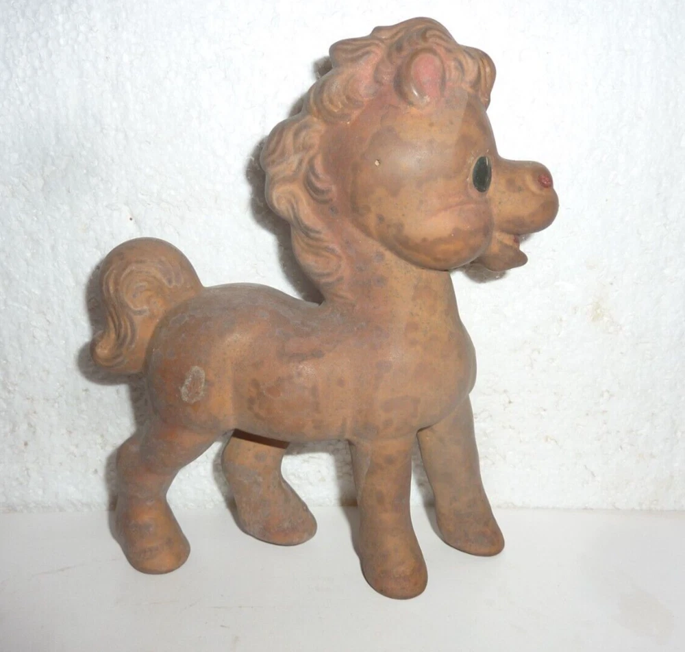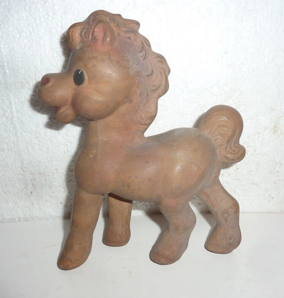 Vtg Rempel Sunnyslope Stock Farm Frisky The Horse Rubber Toy in Cardboard Barn In fair condition does not squeak, dirty I didn't try to clean, cardboard barn box has wear from storage and age, horse is 7" tall.