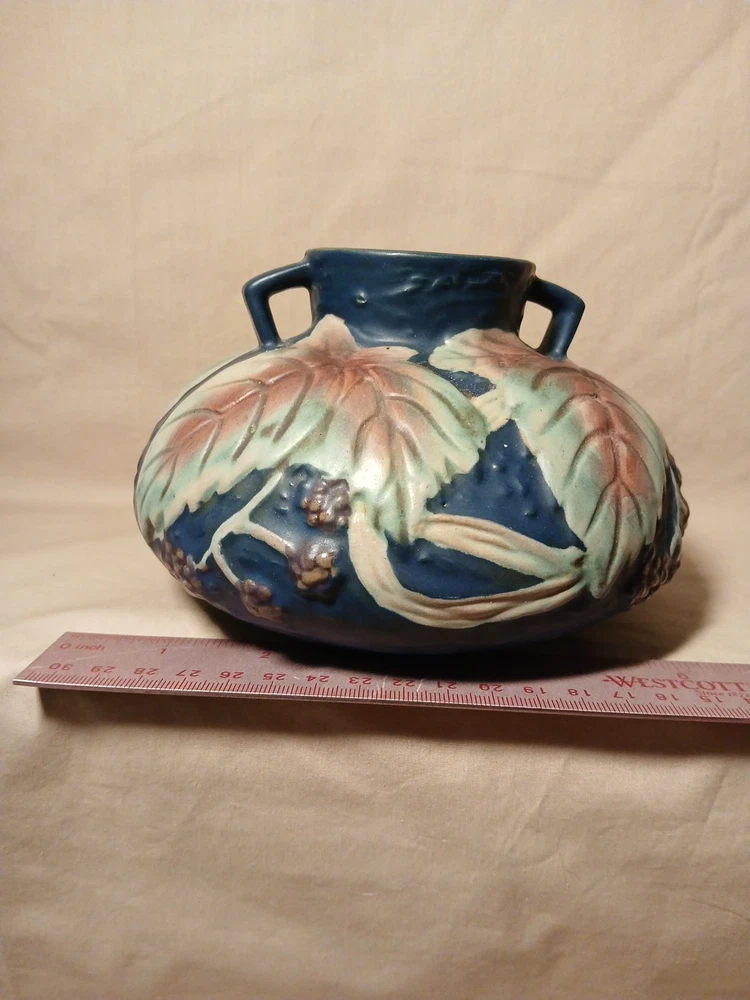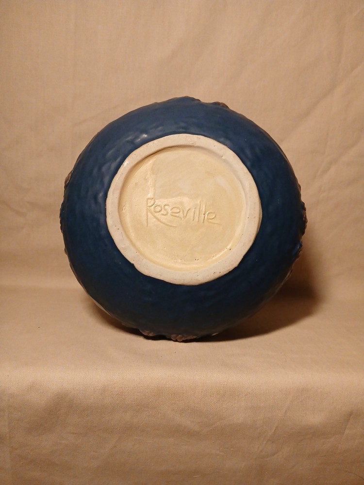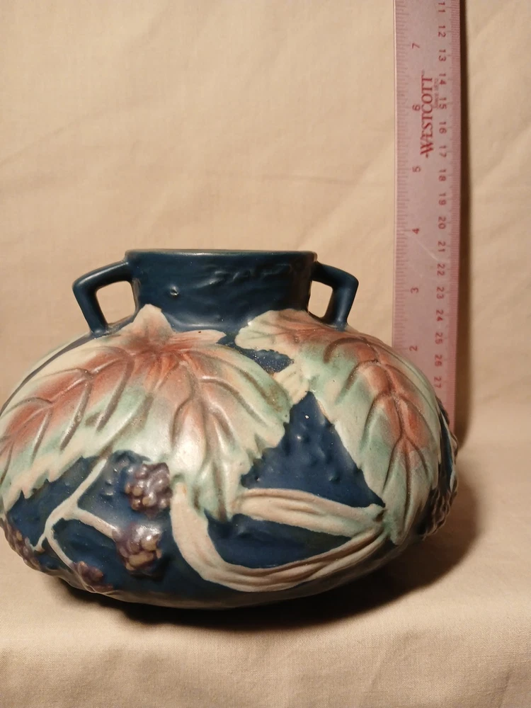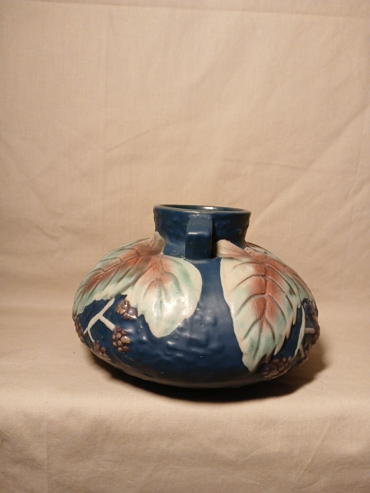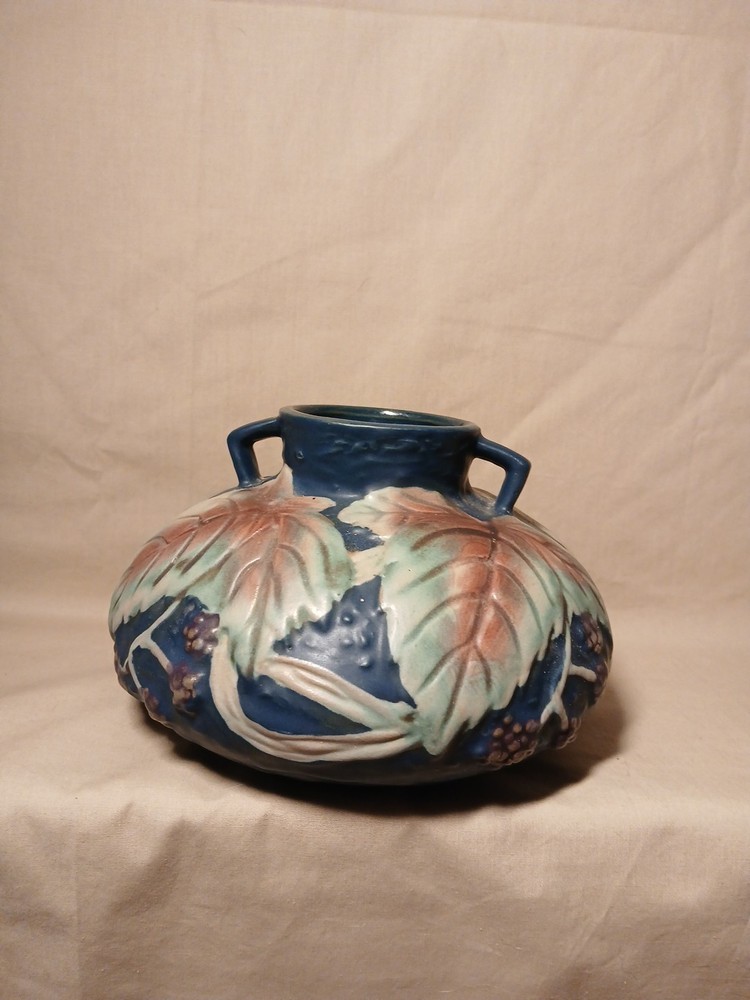 The Reproduction Roseville Blackberry Squat Vase is a vintage piece from 1932, featuring a floral pattern hand-painted on clay in a multicolor matte finish. Signed by Roseville, this art pottery vase reflects the Arts & Crafts/Mission Style of the early 20th century. Handmade in the United States using pottery techniques, this reproduction piece captures the essence of the era with its unique design and craftsmanship. This decorative vase would make a charming addition to any floral and garden-themed collection.