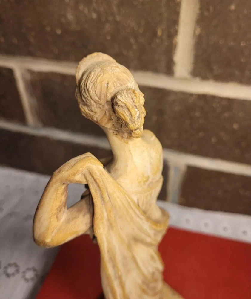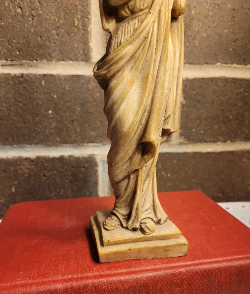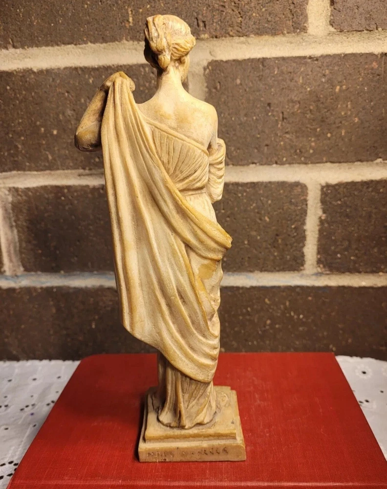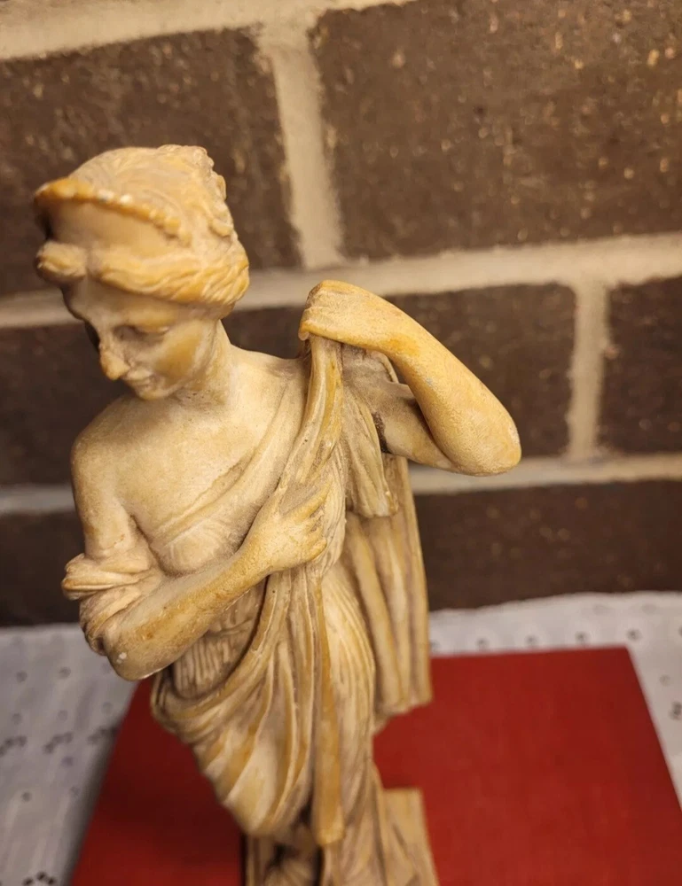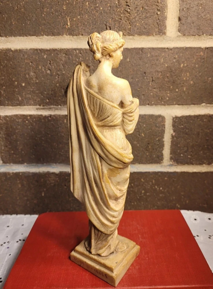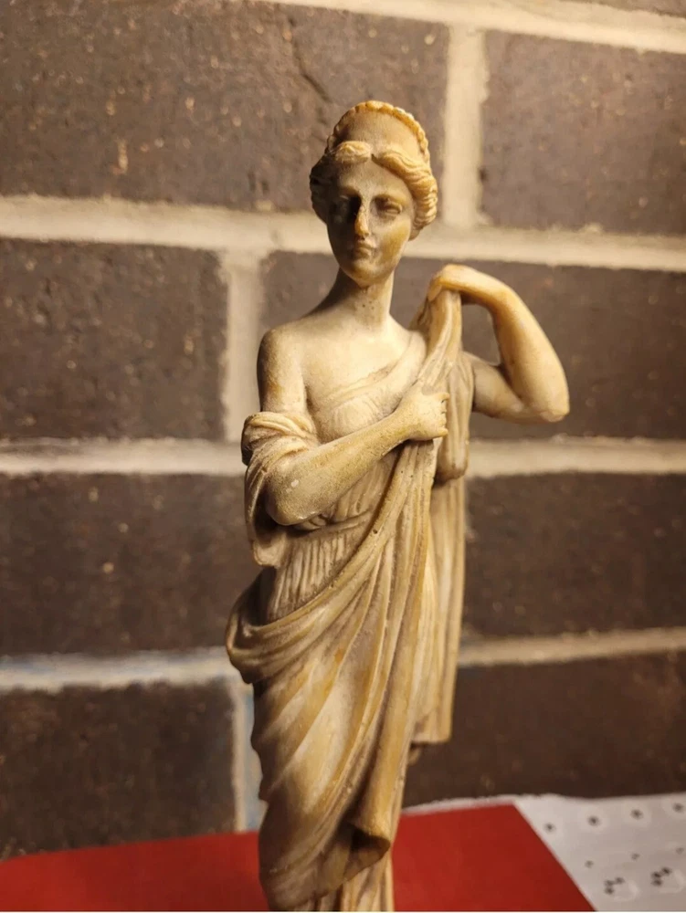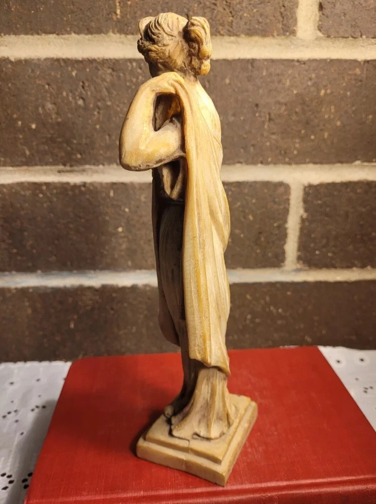 The product is a Vintage Resin Greek Goddess Sculpture, measuring 9.5 inches. It is a sculpture made of resin material, depicting a Greek goddess.