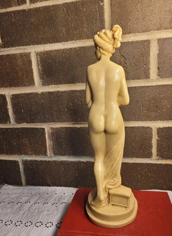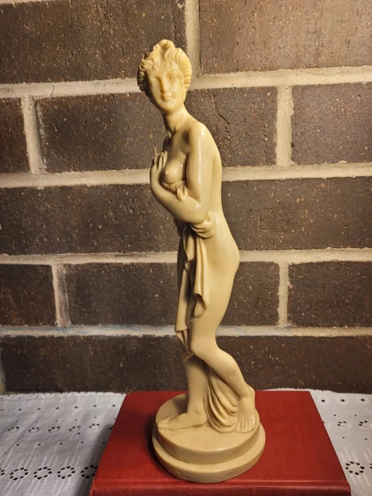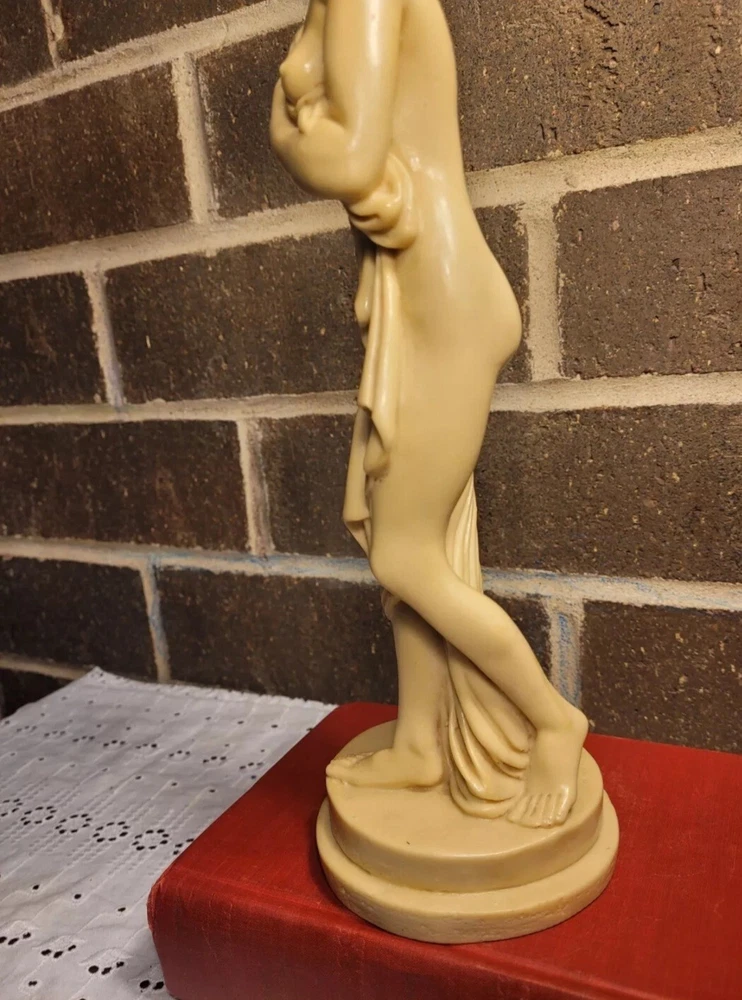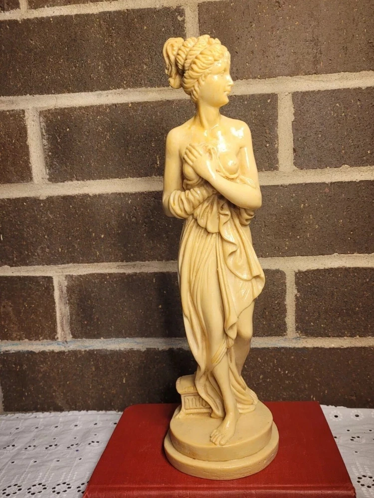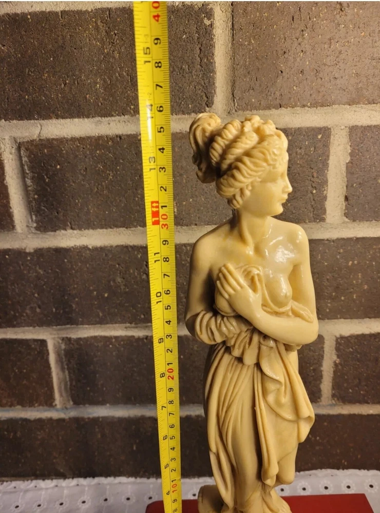 The product is a vintage resin sculpture of a bathing Venus, standing 14 inches tall. The sculpture depicts a woman and is an original piece, not a reproduction. It is categorized as an art sculpture and falls under the art category.