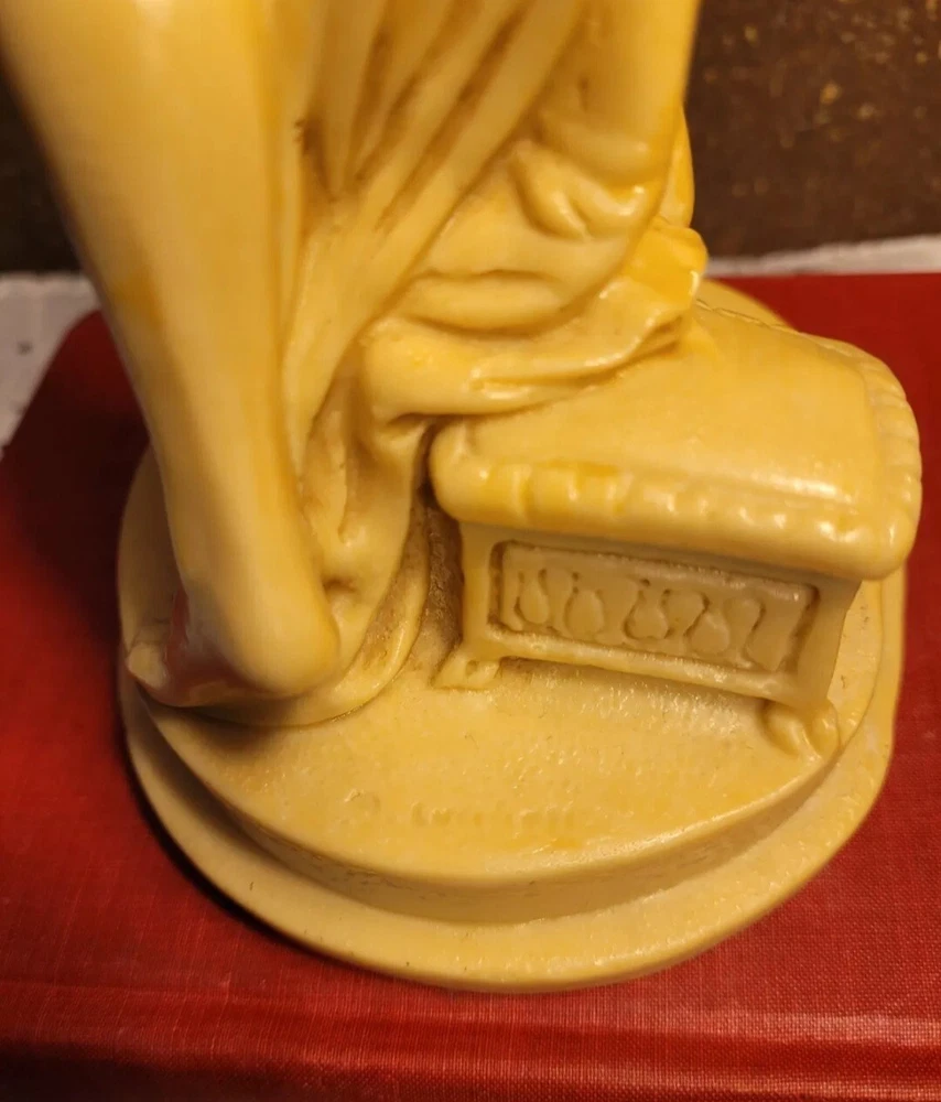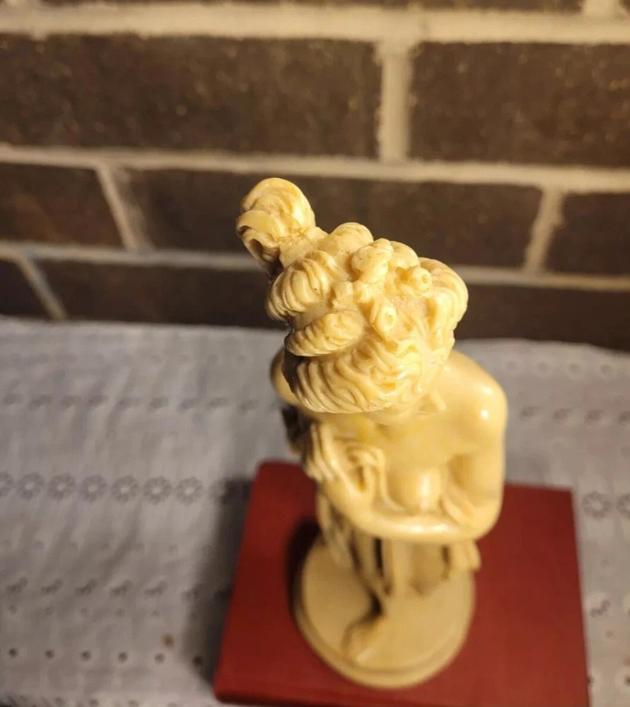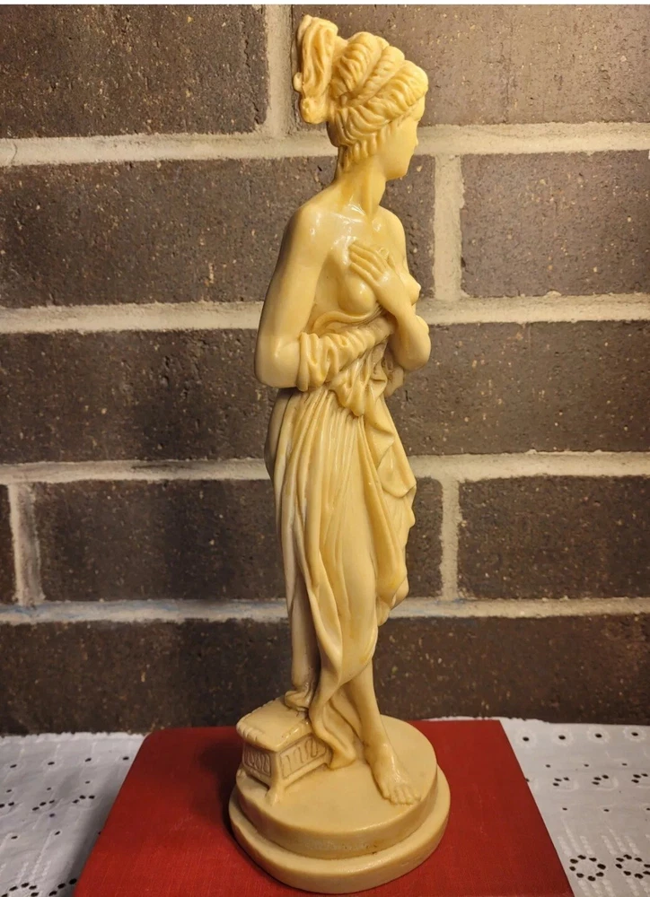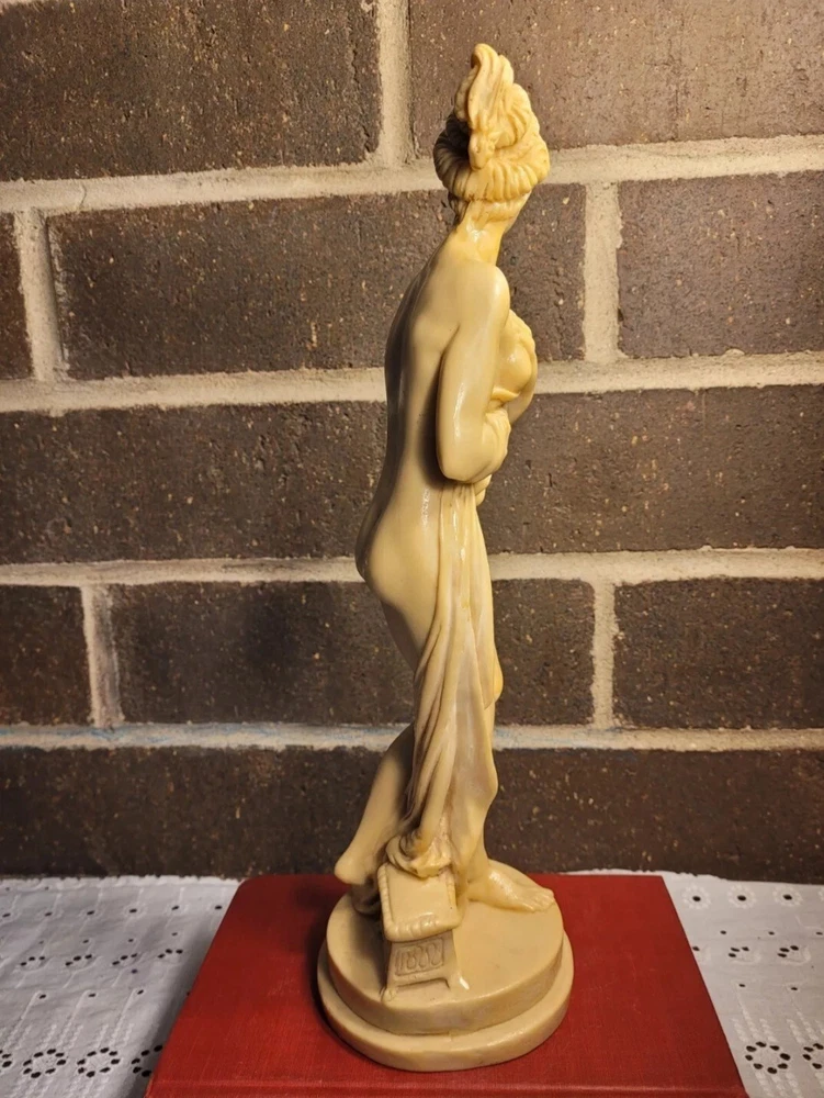 The product is a vintage resin sculpture of a bathing Venus, standing 14 inches tall. The sculpture depicts a woman and is an original piece, not a reproduction. It is categorized as an art sculpture and falls under the art category.