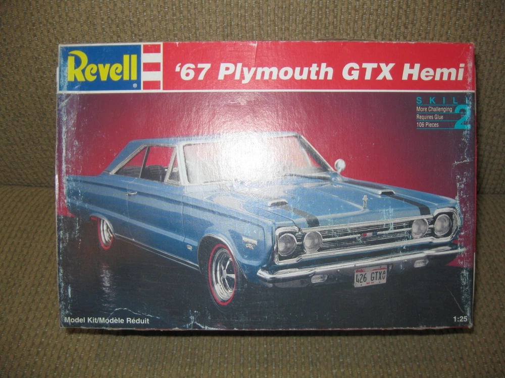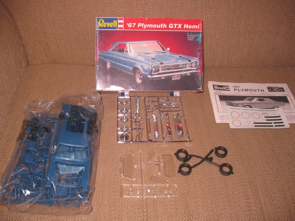Vintage Revell 1/25 Scale 1967 Plymouth GTX Hemi Kit: c1994: MINT IN BOX! This 31 year-old kit is is in mint-in-box, unstarted condition; parts still in original poly bags Parts molded in metallic blue, chrome, with vinyl tires and clear glass Box is a bit scuffed but in good condition; instructions and decals are in excellent shape Kit sold as-is, as-shown LOW starting price, NO reserve Good luck and Good bidding!