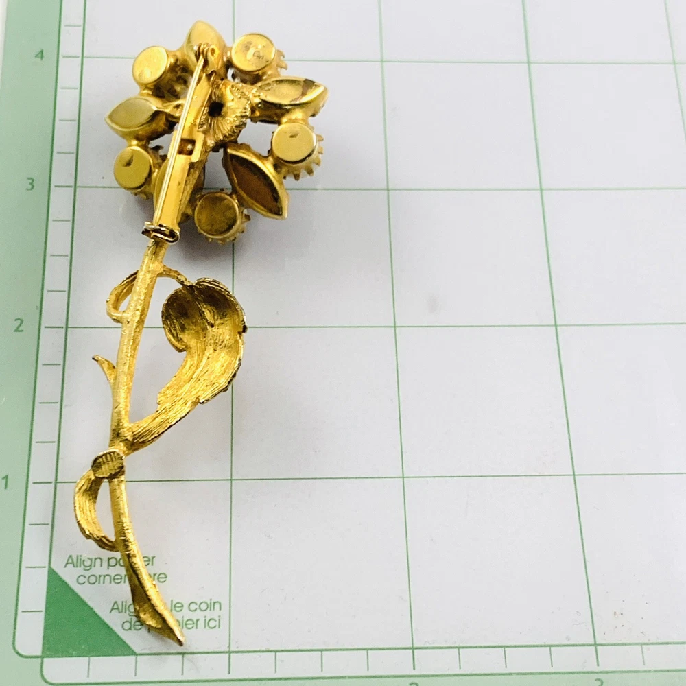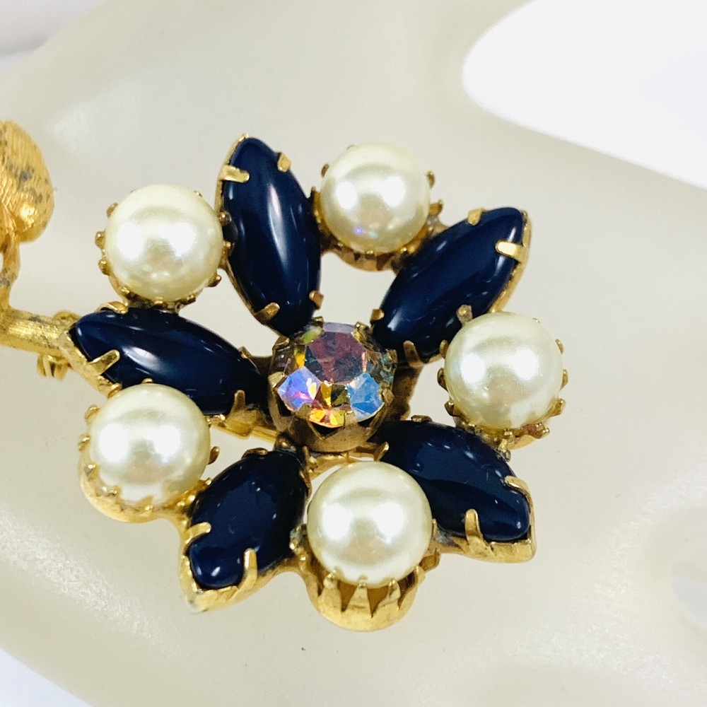 Gorgeous Vintage Long Stem Faux Pearl Navy Blue Glass Cabochons with a Aurora Borealis Rhinestone Center Gold Tone Flower Brooch. Pre-Owned Estate Jewelry in Very Good Condition. Ready to wear, give as gift or add to a collection. Our Vintage items are mostly from estate sales and vary in age from 100+ years old to more modern pieces. Please use your judgement. Items are photographed on a measuring matte with one-inch squares to give you an idea of size. Any photography props / holders you see are not included.