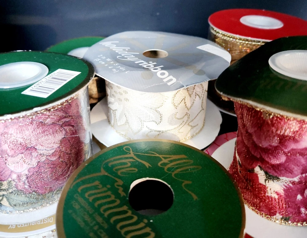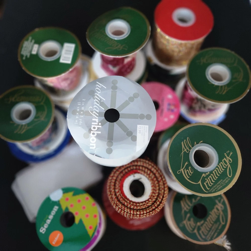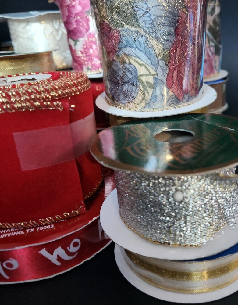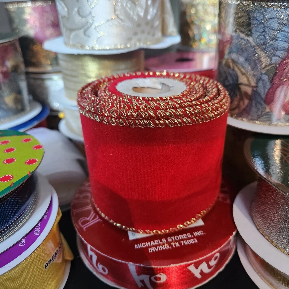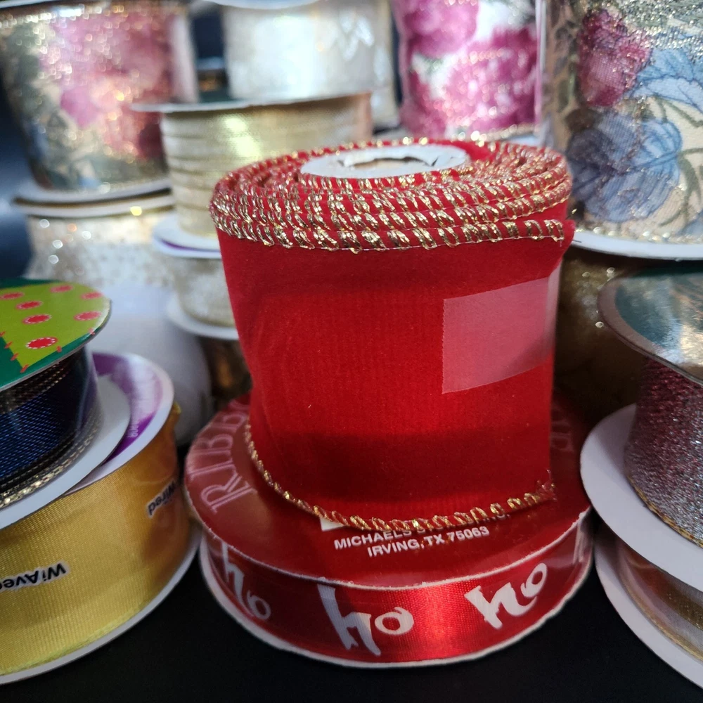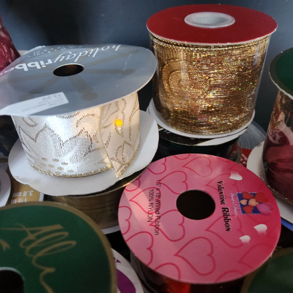 Huge lot of vintage ribbon. Dated from 1998-2005. Wide red velvet ribbon, Christmas ribbon, heart printed ribbon, floral prints and much more. Most are unopened. Excellent condition. No smell.