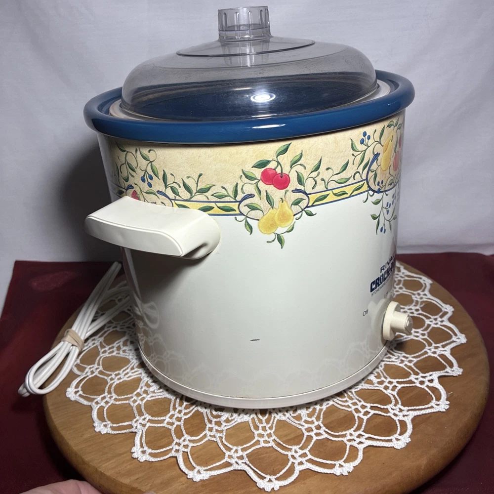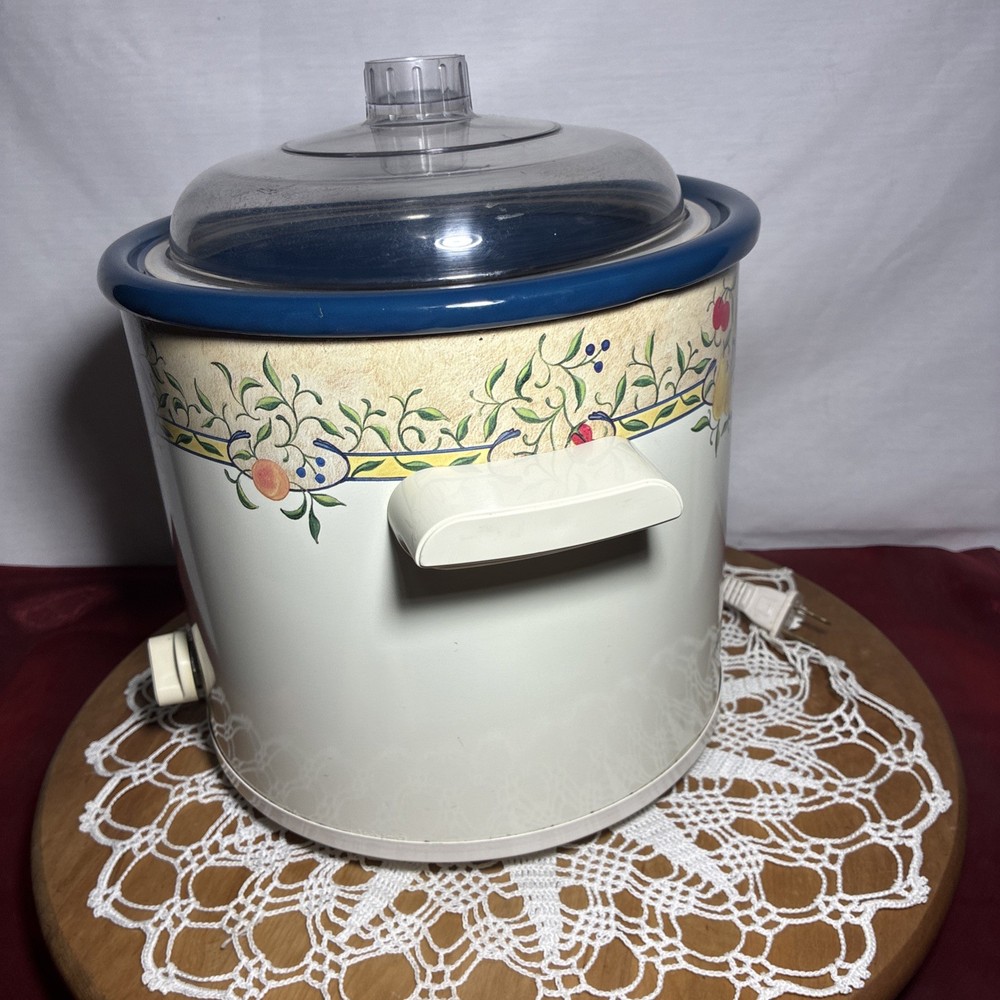 The Vintage Rival Crock Pot 3.5 Quart Model 3100 in blue with a fruit design is a charming and functional slow cooker. This electric appliance features a 3.5 quart stoneware pot with a stainless steel finish, stay-cool handles, and a portable design for ease of use. With a power range of 215-325 watts and three settings/programs, this Rival crock pot is a reliable and stylish addition to any kitchen, perfect for preparing delicious meals with ease.