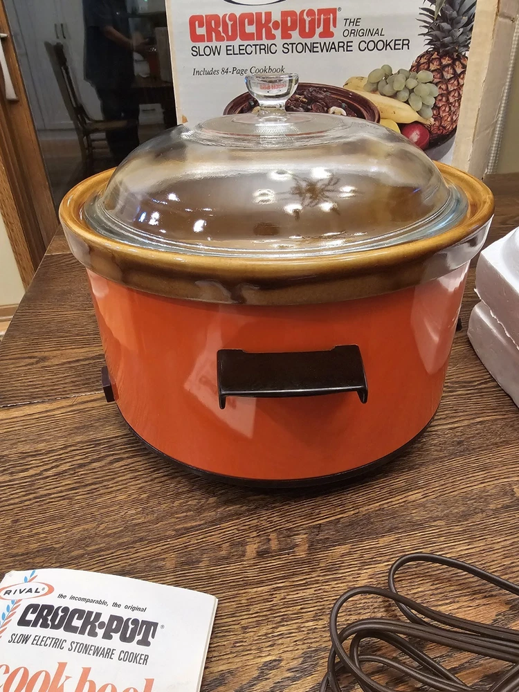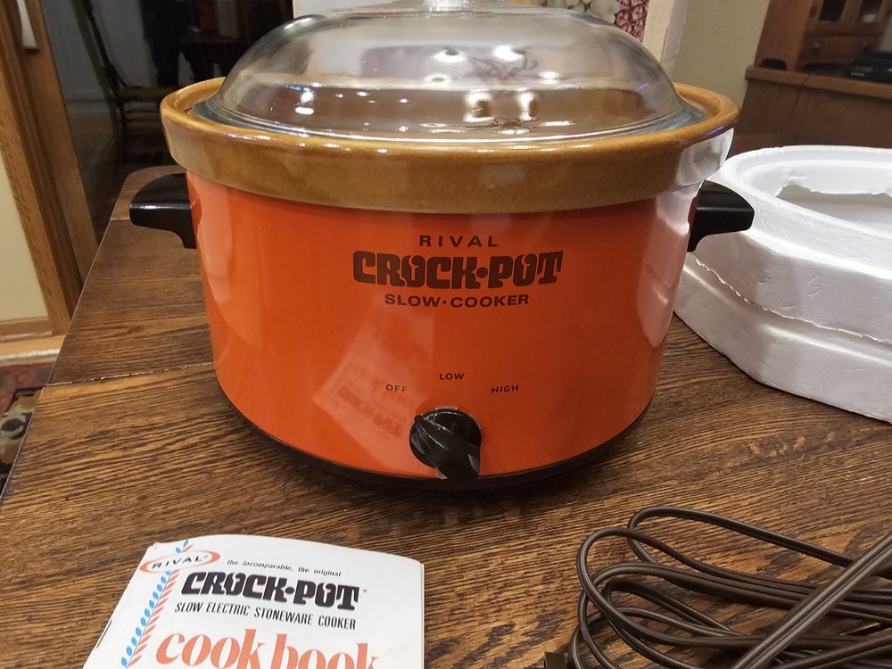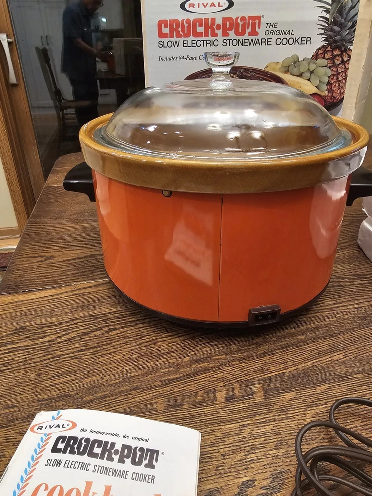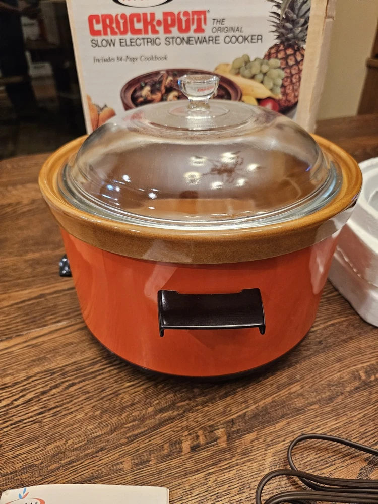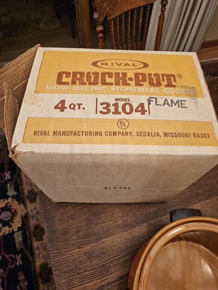 A great unused Rival 3104 FLAME 4 QUART CROCK-POT. ORIGINAL BOX AND THE RECIPE BOOKLET. A GREAT ORANGE COLOR. TESTED AND WORKS GREAT. Shipping to the lower 48 states and no P.O. boxes.