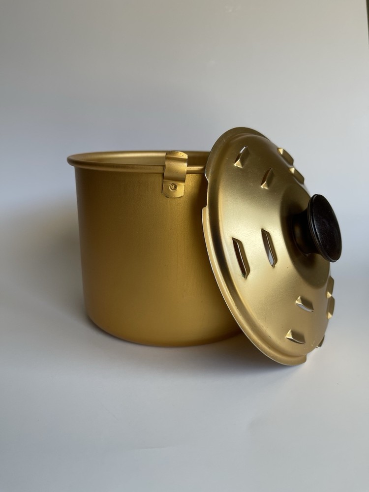 The product is a Rival slow cooker in gold with a Bread 'n Cake Bake pan attachment. It is a small vintage model made of aluminum. This versatile appliance can be used for baking bread and cakes. It is sold exactly as pictured (missing one of the clamps on top which doesn’t effect use) and doesn’t come with a rack.