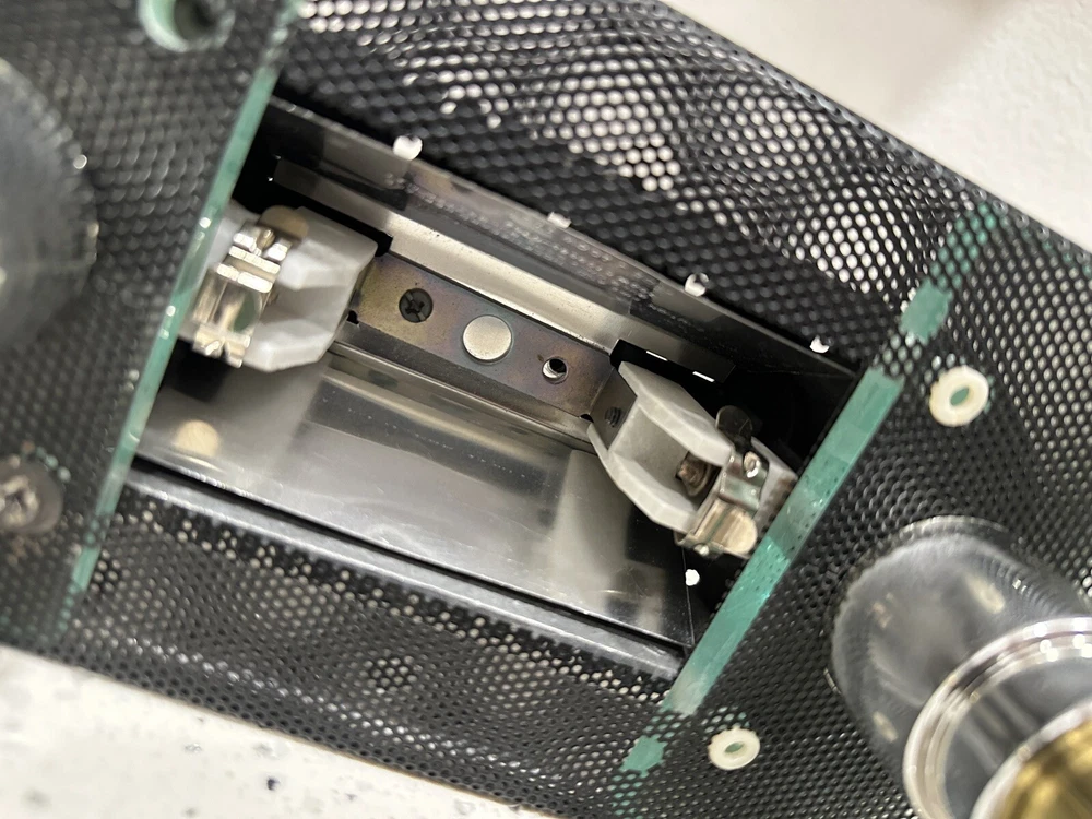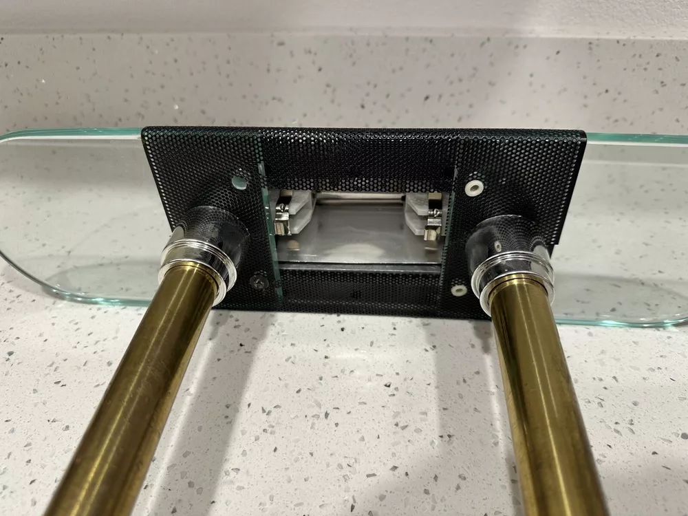 This vintage Robert Sonneman desk lamp is a unique addition to any collection. With a funky, shaded design and a glossy finish, it's sure to catch the eye of anyone who sees it. The lamp is made of brass, glass, and metal, and features a black cord and a knob control. Lamp is sold for parts only, no bulb. Please see all pictures and angles before purchase. Sold as is