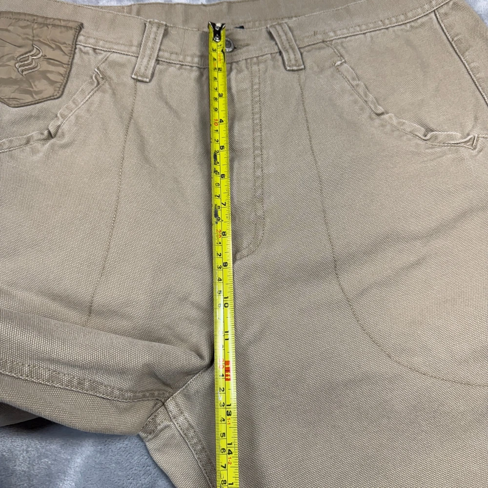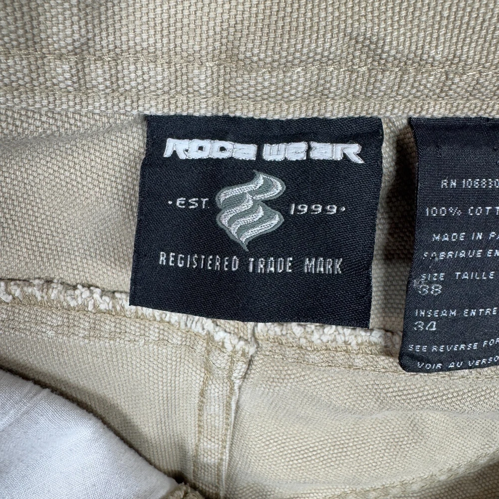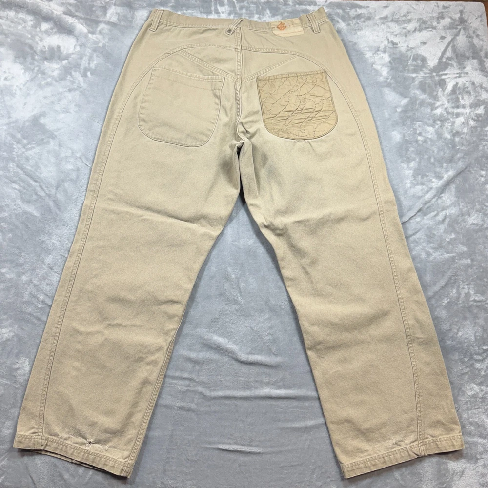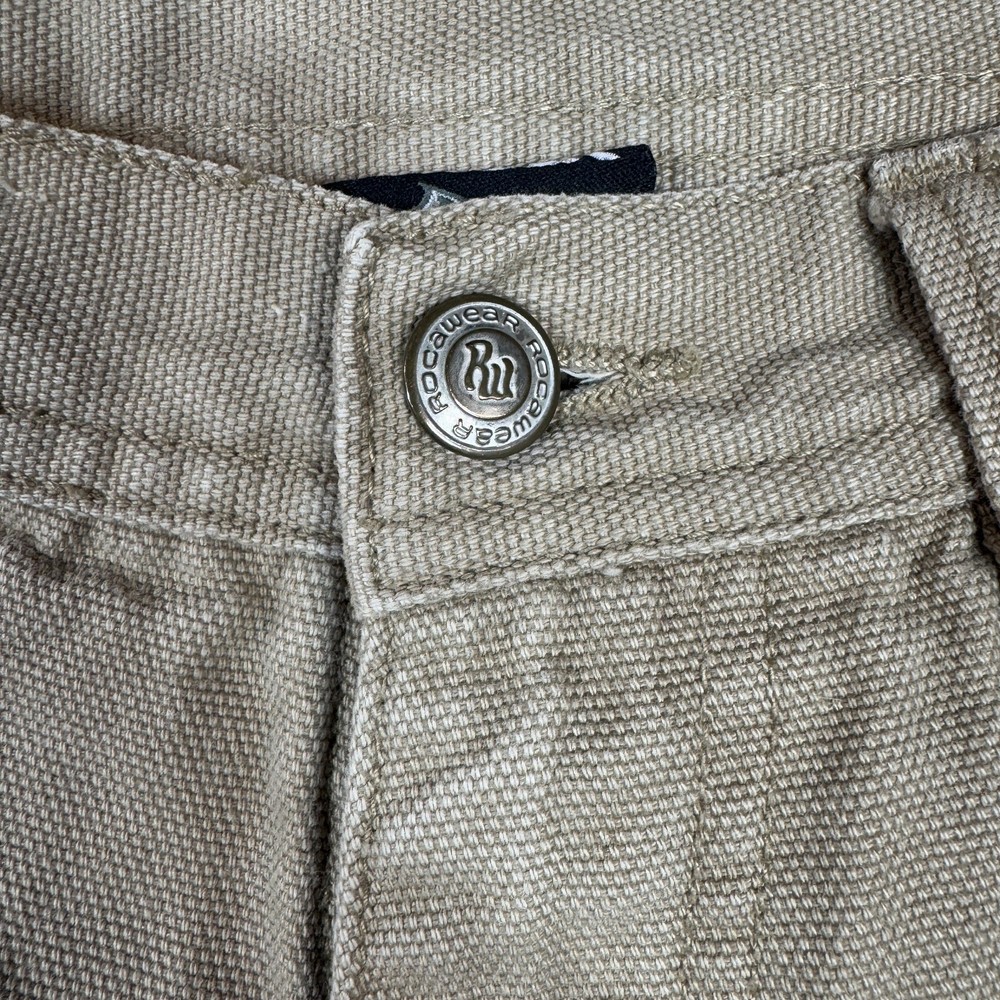 These Vintage Rocawear Jeans are designed for men in a size 38 waist and 34 inseam. The khaki denim fabric is solid in color with a dark wash, featuring a high rise waist and a baggy, loose fit for a hip-hop style from the Y2K era. The jeans have a 5-pocket design with button and zipper accents, made of comfortable cotton material. This classic designer piece is perfect for a casual, urban look in all seasons.