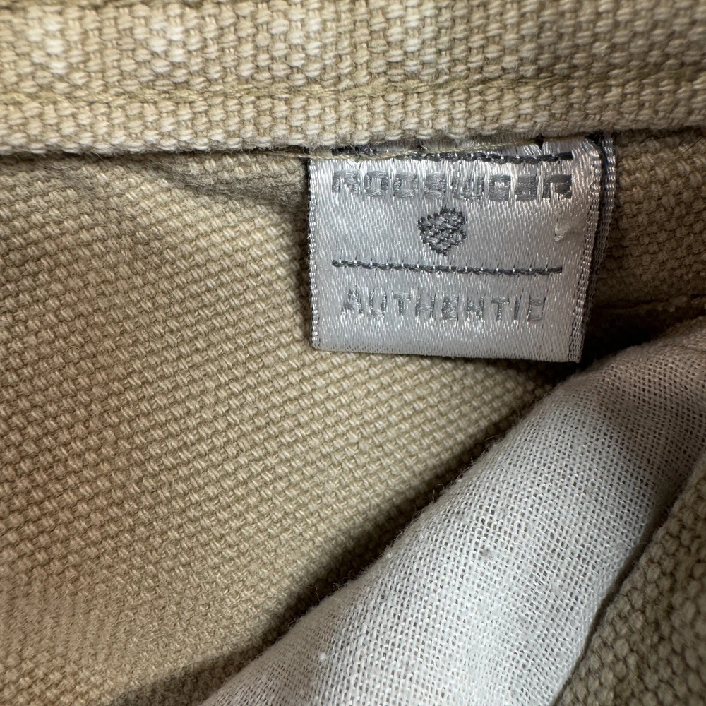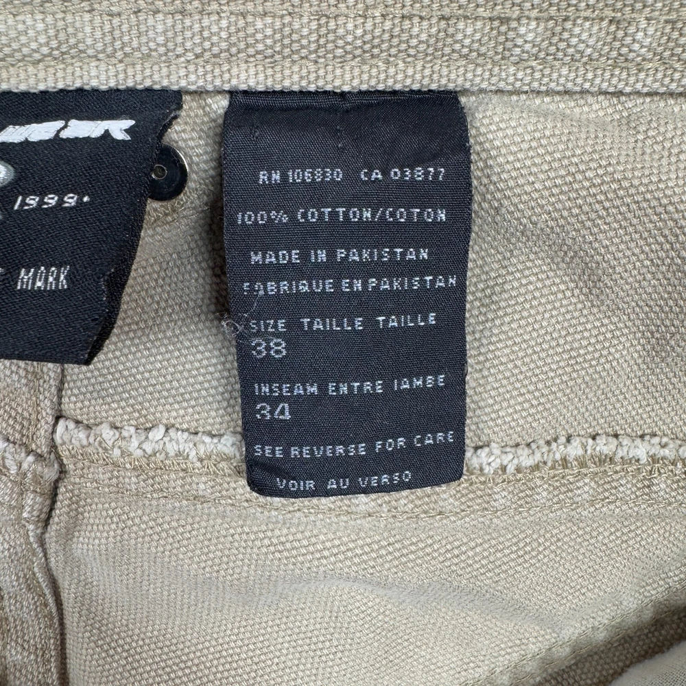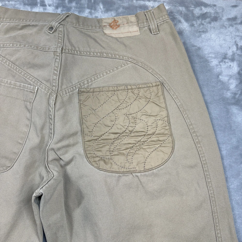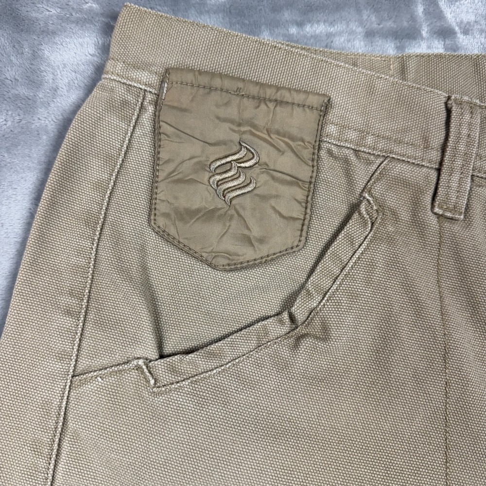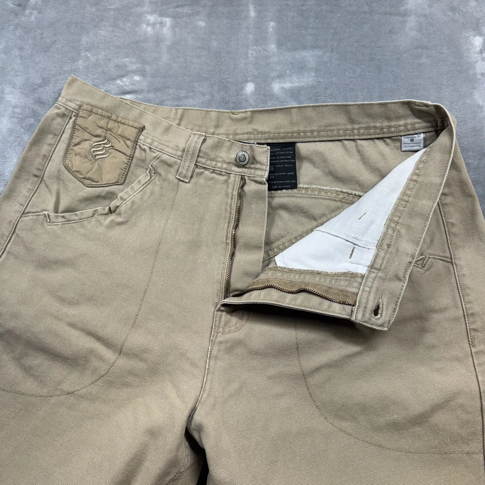 These Vintage Rocawear Jeans are designed for men in a size 38 waist and 34 inseam. The khaki denim fabric is solid in color with a dark wash, featuring a high rise waist and a baggy, loose fit for a hip-hop style from the Y2K era. The jeans have a 5-pocket design with button and zipper accents, made of comfortable cotton material. This classic designer piece is perfect for a casual, urban look in all seasons.