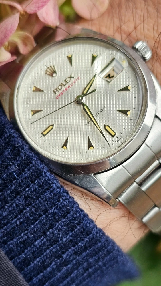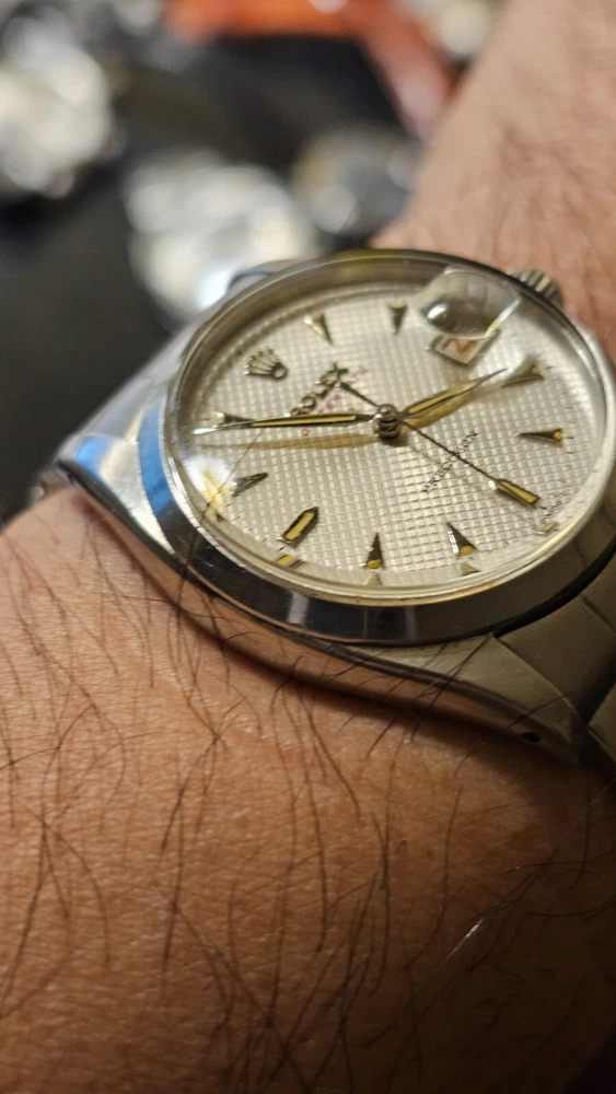 This vintage Rolex Oysterdate men's wristwatch features a classic round shape with a silver stainless steel case and smooth silver bezel. The dial pattern is a stylish honeycomb design with arrow markers and a date indicator. The watch has a mechanical (manual) movement with 17 jewels. The watch is from the 1950s and has a screwback caseback. It comes with a Rolex Oyster band/strap with a lug width of 19 mm and a maximum wrist size of 7.26-7.5 inches. This Swiss-made timepiece is a true vintage gem and would make a great addition to any watch collection. I am so proud of being able to offer you a gorgeous vintage Rolex Oysterdate Precision Ref.6494 men's hand-winding watch. With Honeycomb silver dial which has been refurbished / repainted professionally and looks so handsome and smart. Refurbished on original Rolex dial The stainless steel Oyster case, screw down caseback, smooth stainless steel bezel and crystal are all in good condition for its age. The dial is fitted with silver hands and a date window at 3 o'clock position which is a great asset to this vintage. The robust 34mm stainless steel Oyster case with a screw down Rolex crown and Rolex Oyster bracelet have remained in good condition with general wear but no significant damage. In fully working order- runs strong and tells good time, powered by a reliable Rolex manual movement with 17 jewels. Reference and serial numbers are both present and visible. The original Rolex bracelet will fit up to 7.5 inches wrist. You will get exactly what you see. The pictures say it all. Please check all my pictures for more details as they are the best description of the watch much better than I could. I will ship the watch to your door using FedEx International Priority. Expected to arrive in 3~5 days of shipping. No box or papers are included. I do accept PayPal, Sir..... Please note, the buyers are responsible for import and duty fees. I am so grateful you have visited my E-house. Thanks for your attention !!