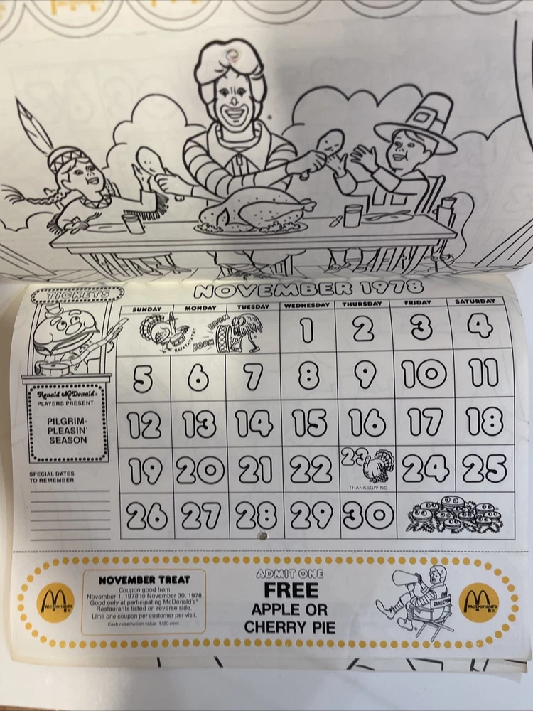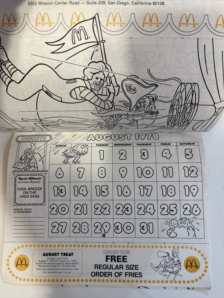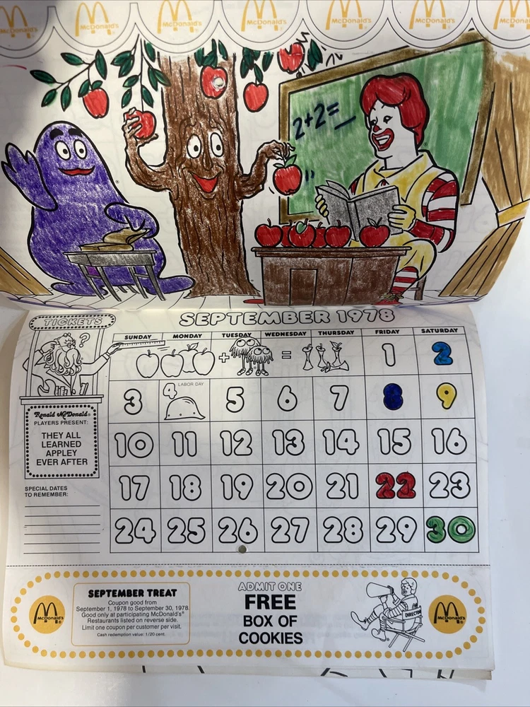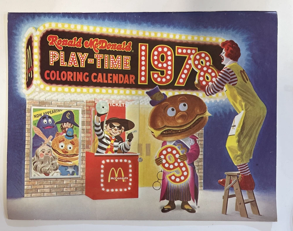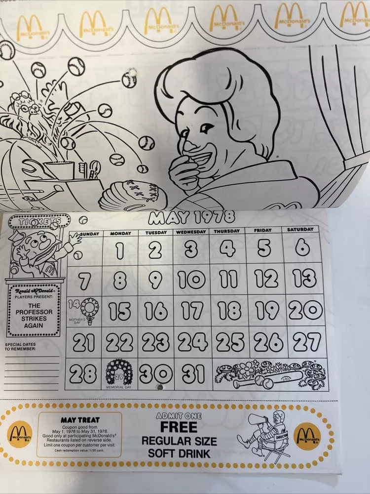 One page used please see pictures This vintage Ronald McDonald coloring calendar from 1978 is a must-have for any McDonald's or fast food advertising collector. The calendar features a colorful and fun design that is perfect for kids and adults alike. The calendar was made in the United States and is an original piece, not a reproduction. The calendar is in great shape and has only one page that has been used. The branding is clear and the theme is restaurants and fast food. This item would make a great addition to any collection or could be framed and hung in a fun room or office. Don't miss out on the opportunity to own this unique and original piece of advertising history.