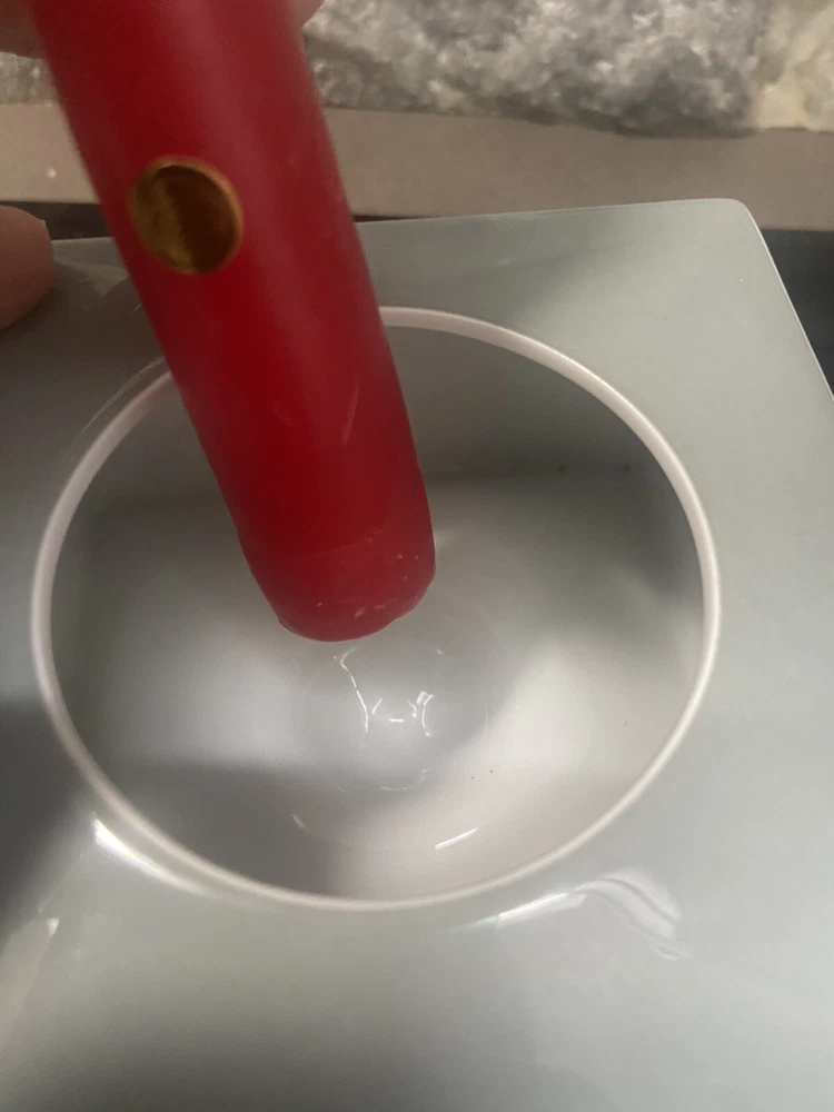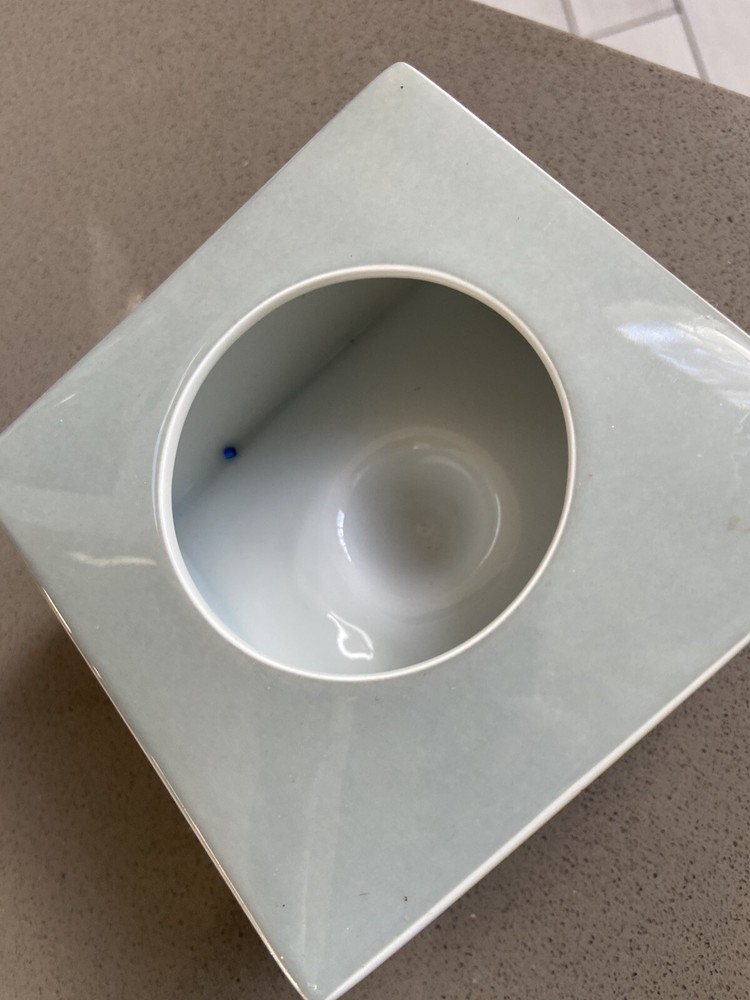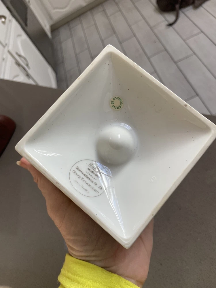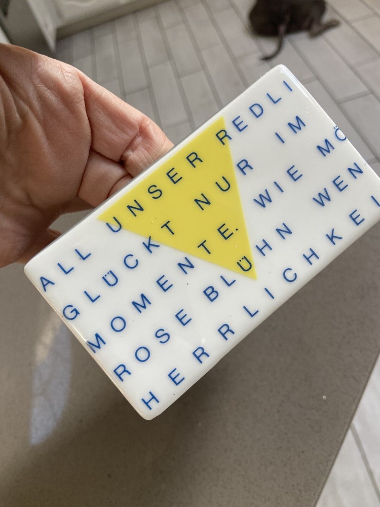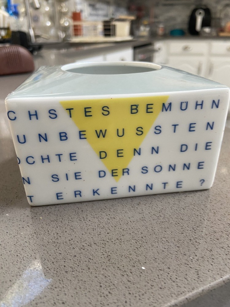 Really cool candle holder see photos for the best description. It has some writing on the side. I’m not too sure what it says. It’s in German, but it seems to be inspirational saying according to my Google translate lol it measures 4” x 4” in diameter and it is about 3 inches tall
