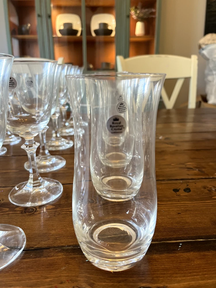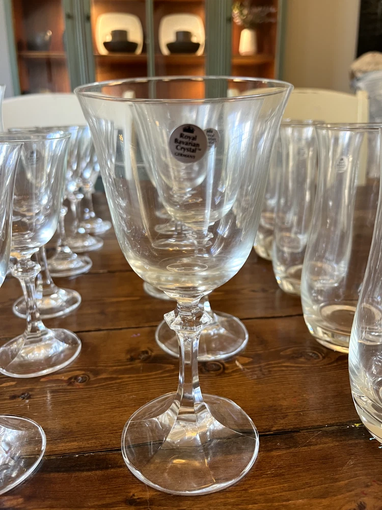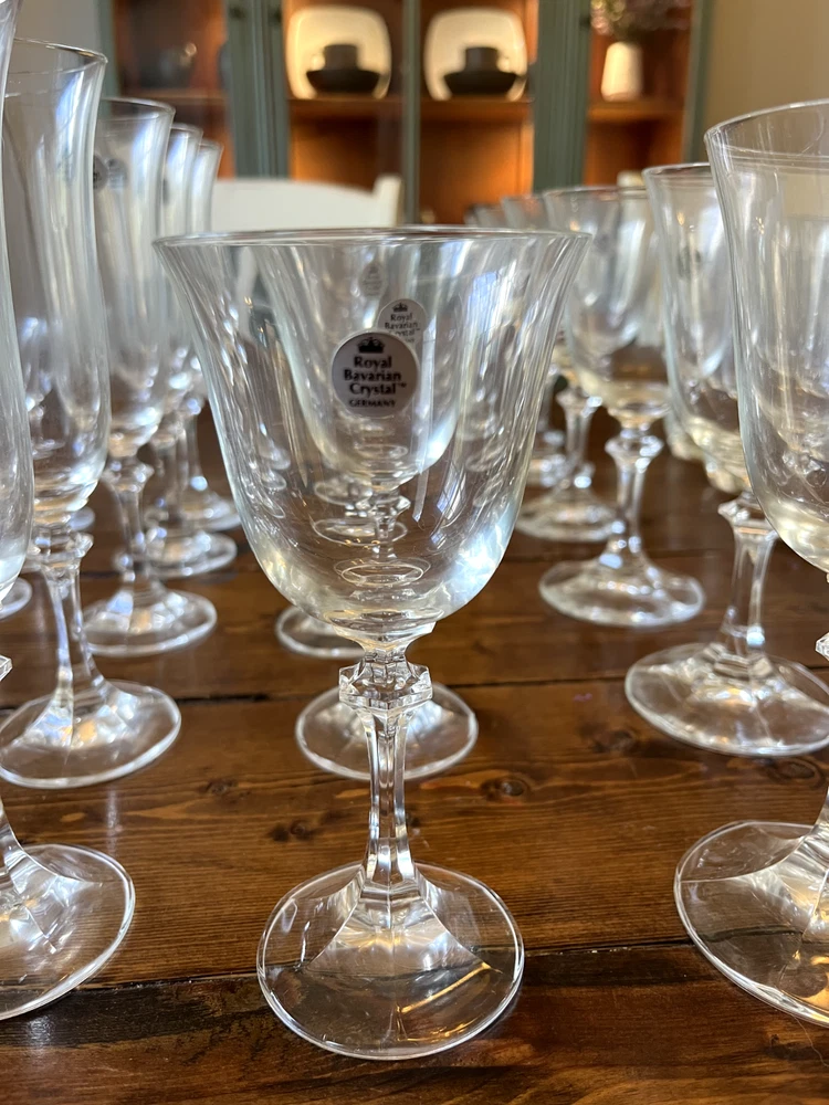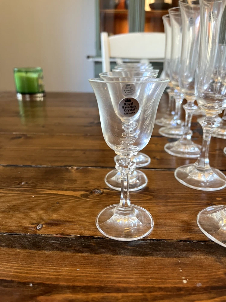 Royal Bavarian Crystal Germany drinkware set. Never used. Most items still have original "Royal Bavarian Crystal Germany" sticker on them. Set includes: 6 121/2 oz Beverage Tumblers 6 Water Goblets 6 Wine Glasses 5 Champagne Flutes 6 The Cordial liquor glasses