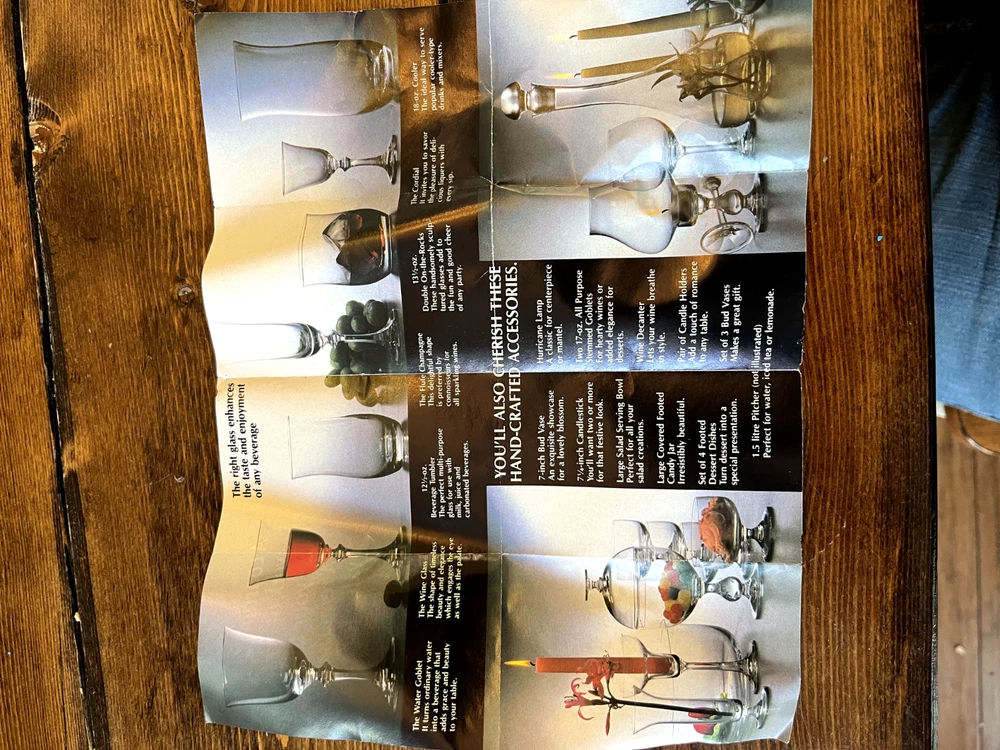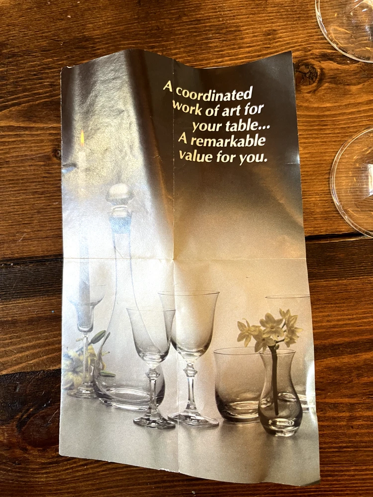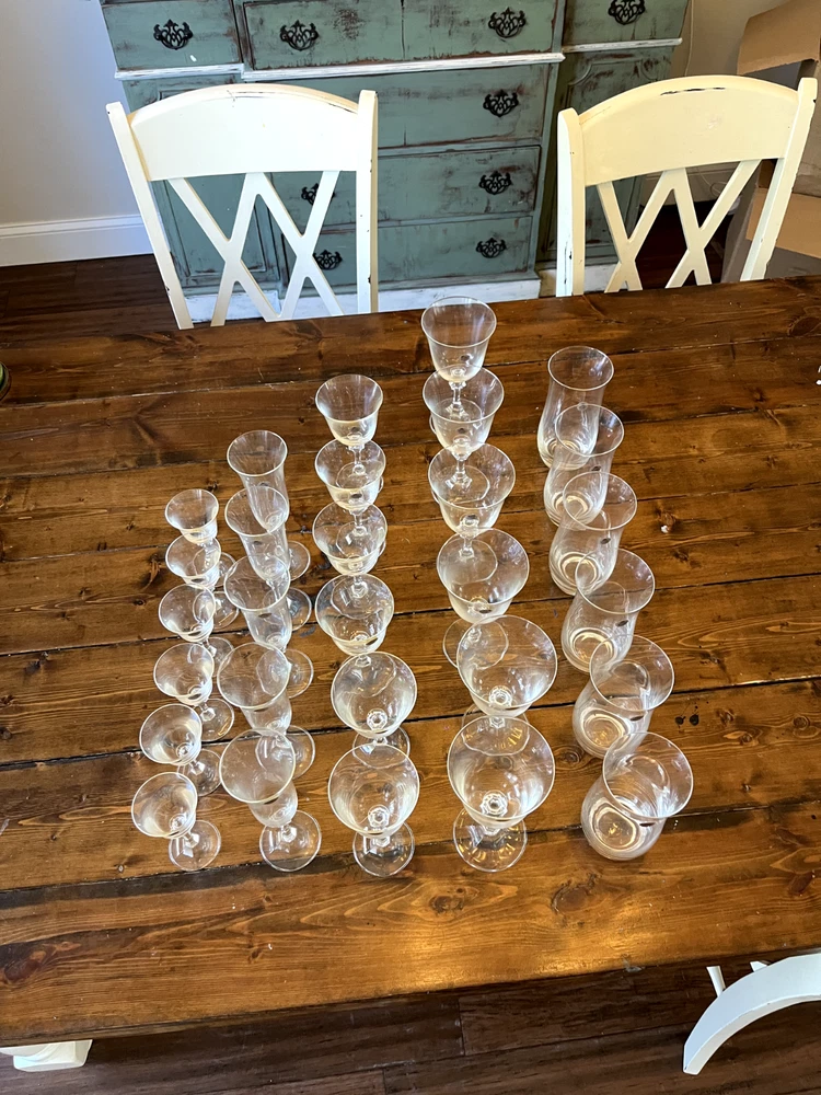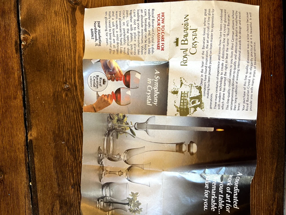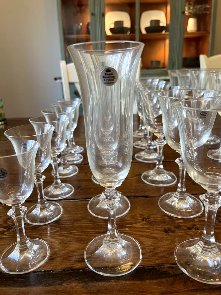 Royal Bavarian Crystal Germany drinkware set. Never used. Most items still have original "Royal Bavarian Crystal Germany" sticker on them. Set includes: 6 121/2 oz Beverage Tumblers 6 Water Goblets 6 Wine Glasses 5 Champagne Flutes 6 The Cordial liquor glasses