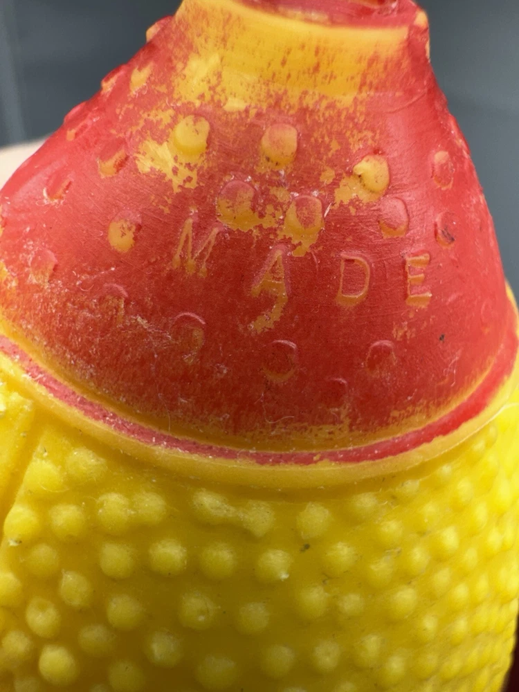 This vintage rubber squeaky toy is in the shape of a mini football and is designed to make a squeaking sound when squeezed. It is a collectible item that appeals to those interested in vintage and antique toys. The toy is marked as "works," indicating that the squeaking mechanism is functional, adding to its charm for collectors of nostalgic items. Perfect for adding a touch of vintage charm to any toy collection.