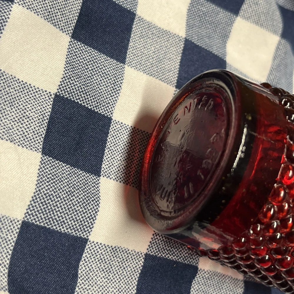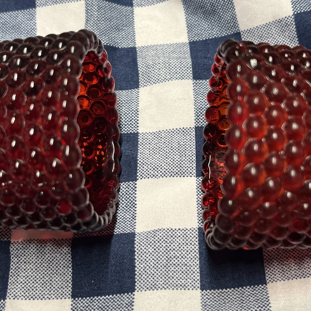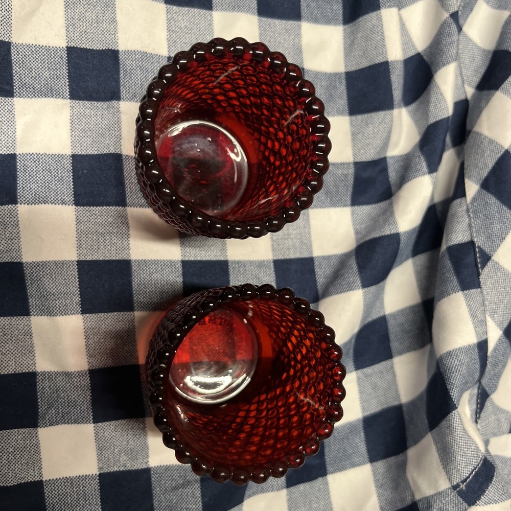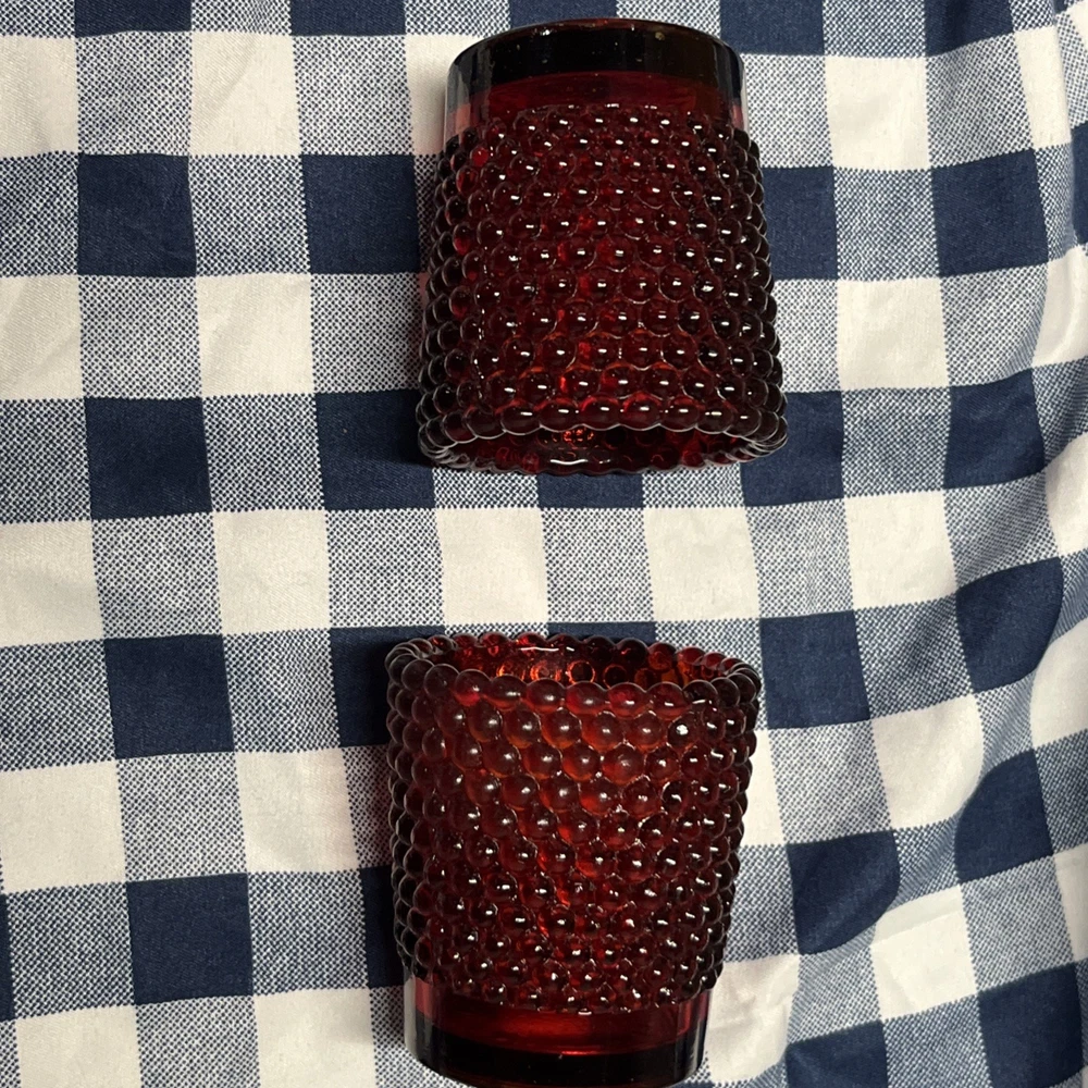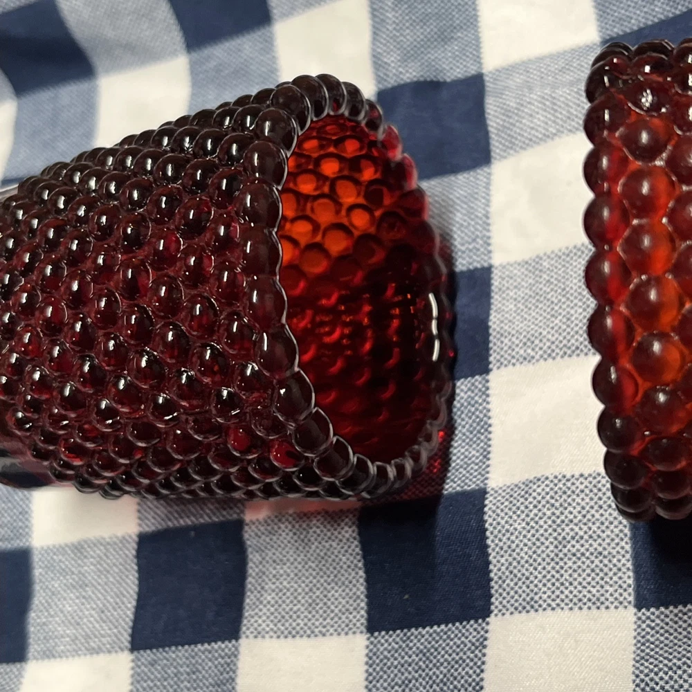 This vintage ruby red hobnail glass votive candle holder is a small, round Art Deco style piece patented on July 11, 1939. It features a glossy finish and textured design, making it suitable for all occasions and any room in the home. Made of glass and measuring 2 1/2 inches in height, this original collectible comes in a set of 2 and weighs 2 lbs. Perfect for adding a touch of elegance to any space, this unique candle holder is a timeless piece from the early 19th century. You’re buying the set. One price