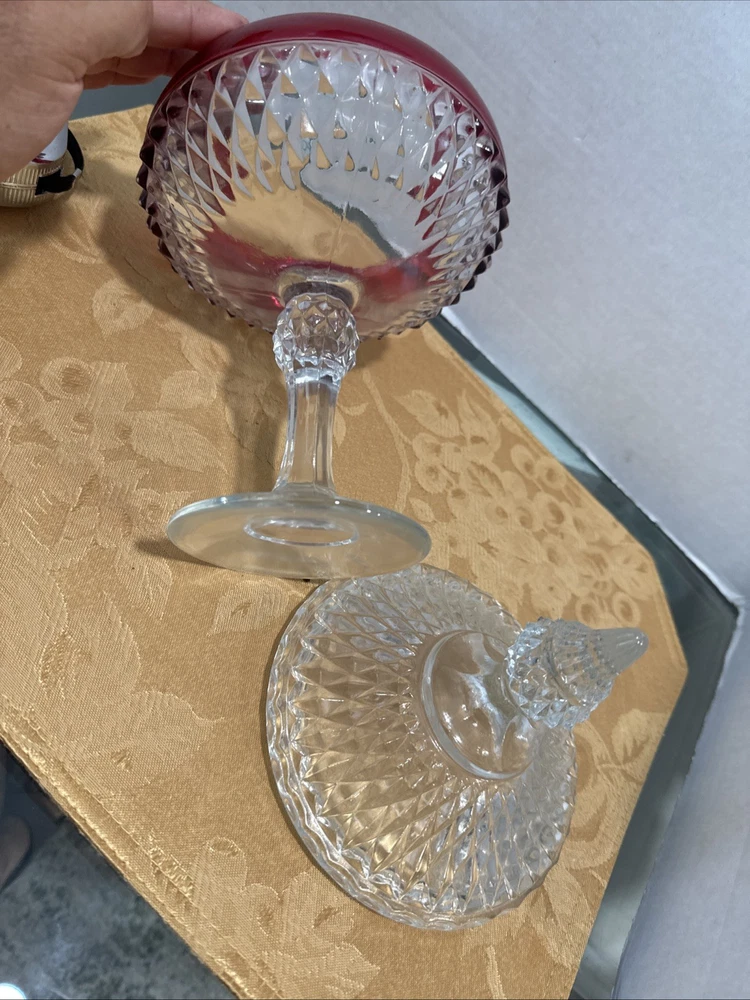 The Vintage Indiana Glass Ruby Red Flashed Diamond Point Compote with Lid is a beautiful piece of decorative collectible made of glass. This round bowl set features a clear and red color with a diamond pattern, showcasing the craftsmanship of the Indiana Glass Co. The set includes a compote or candy dish with a lid, measuring 12 inches in height and 3 inches in depth, with a bowl diameter of 6.5 inches. This original piece from the United States adds a touch of elegance to any collection or display. Look at the pictures before making your purchase