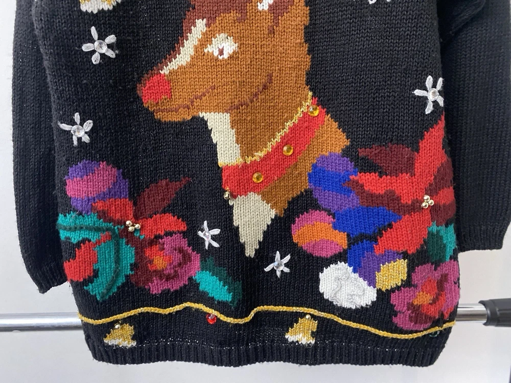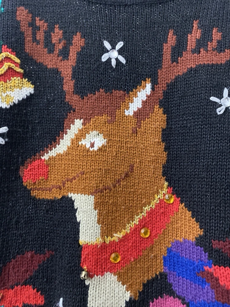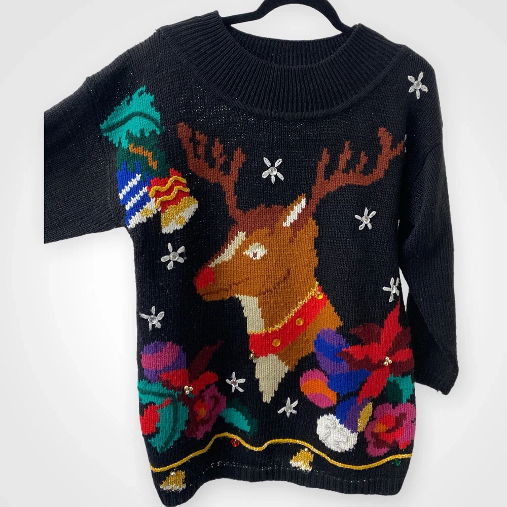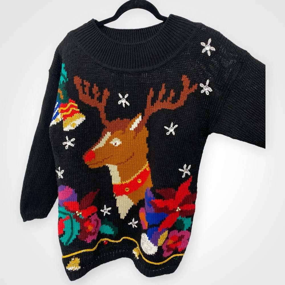 Vintage Rudolph Christmas Sweater - Black Holiday Knit Sweater- Medium This Vintage Rudolph Christmas Sweater by Spice of Life (possibly 80s or 90s) is a holiday must-have! This festive sweater features Rudolph the Red-Nosed Reindeer with a real bell around his neck. The design is adorned with poinsettias, bells, snowflakes, and gem accents for extra sparkle. Key Features: Brand: Spice of Life Material: 44% Ramie, 34% Acrylic, 22% Cotton Size: Medium (Fits true to size; can also work as a dress for petite frames) Color: Black with multicolor festive design Design Details: Real bell, intricate knit pattern, gem accents, poinsettias, snowflakes Condition: Pre-owned, good vintage condition Measurements: Bust: Approx. 19" Length: Approx. 25" Sleeve Length: Approx. 23" Perfect For: Holiday parties, festive gatherings, or even as a statement holiday dress paired with boots! — Vintage Rudolph Sweater, 80s Holiday Knitwear, Christmas Sweater Medium, Festive Reindeer Sweater, Poinsettia Snowflake Gem Sweater, Ugly Christmas Sweater Chic