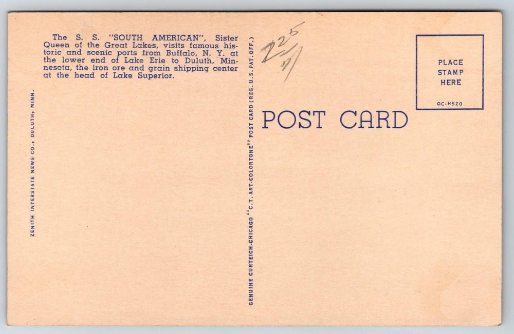 Vintage SS South American Cruise Ship Postcard of Great Lakes Ports Z13