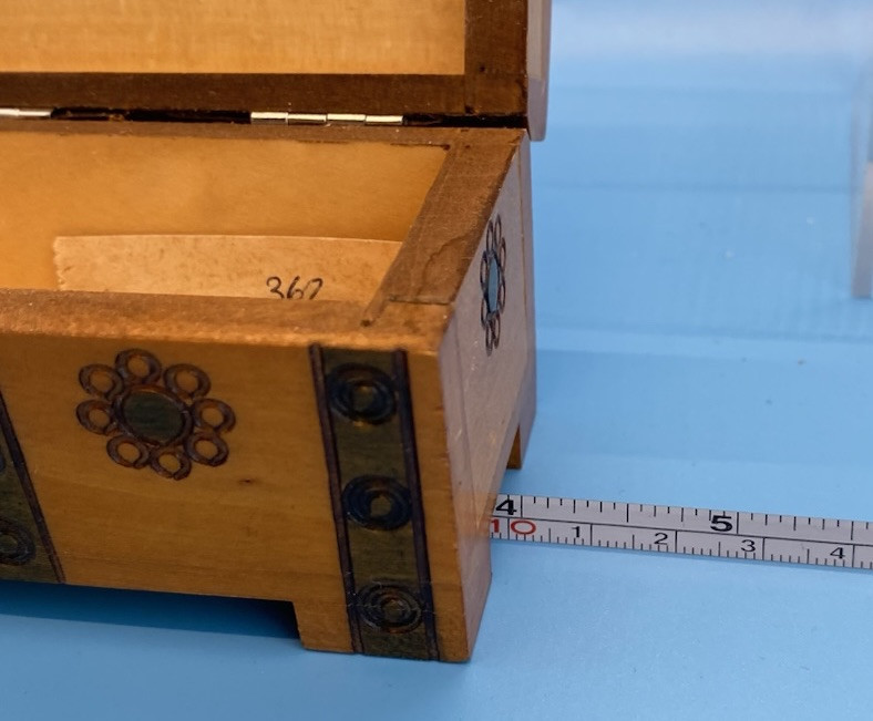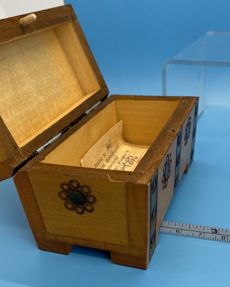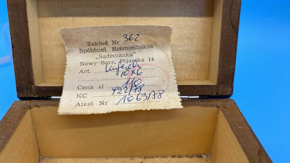 Polish wooden box, mid-20th century. The label describes it as made by Zakład Nr 362, a cooperative called "Sądeczanka" in Nowy Sącz, Poland, located on Pijarska street 14. The item is described as "Kufedly" (small chest or box), with a price, control number (KC), and attestation number 1063/78. Box is handmade from Linden wood in the Tatra Mountain region of Poland, using traditional techniques. Not used, from collection.