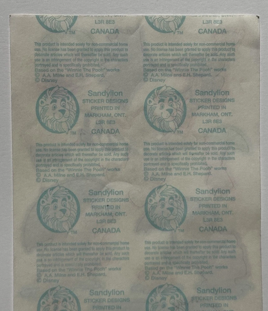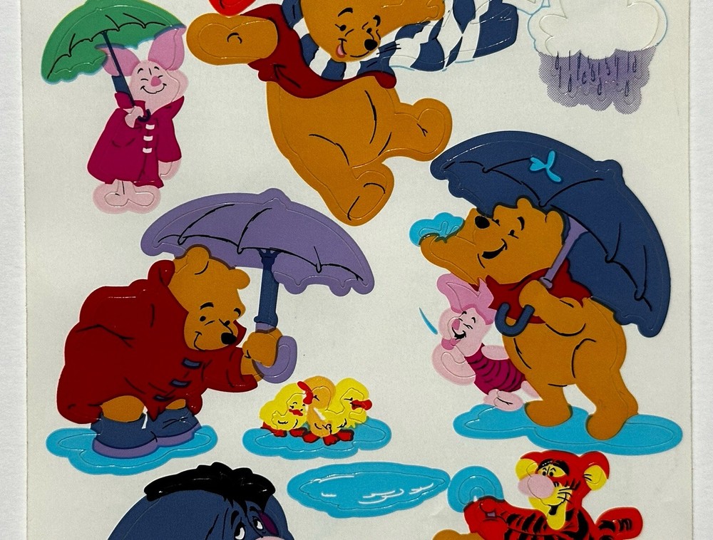This sticker sheet from the vintage Disney and Sandylion collaboration features Winnie the Pooh and friends having fun in the rain. These adorable and vibrant stickers will make a great addition to any vintage sticker collection, Winnie the Pooh fan, and/or crafter! The sticker sheet is in great, vintage condition with normal signs of wear from handle and time. Please review all of the pictures and ask any questions as this is sold as is. Thank you for your time! :)