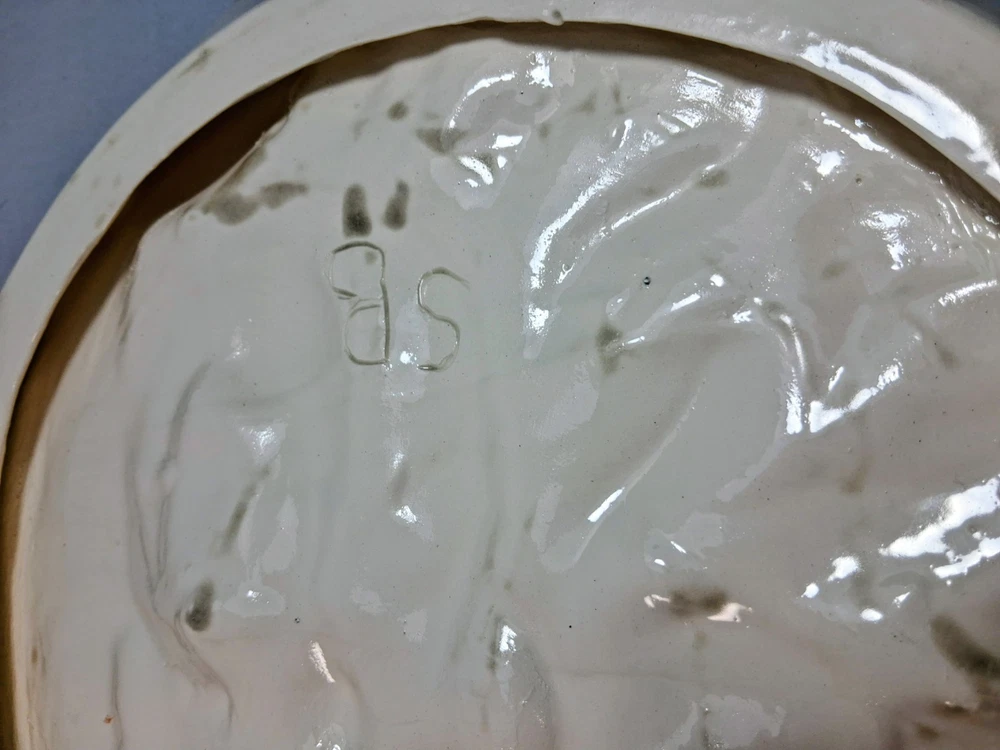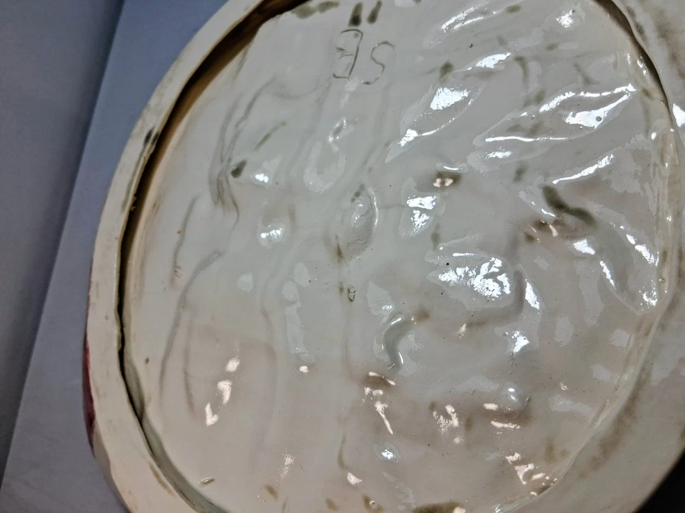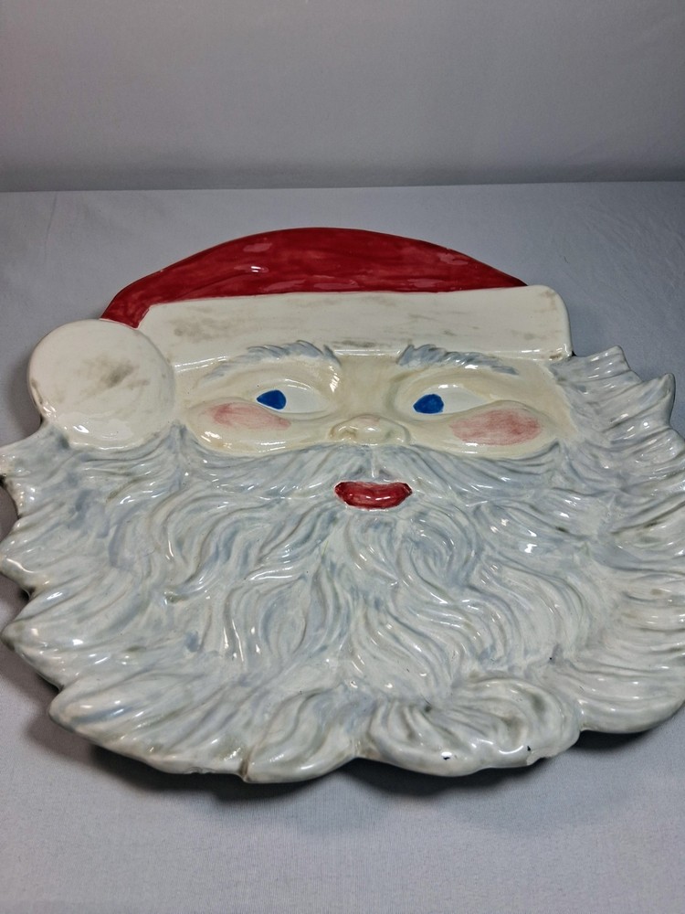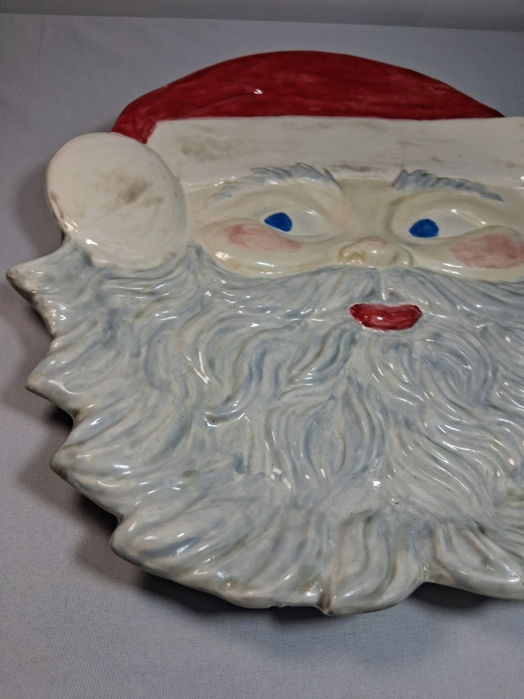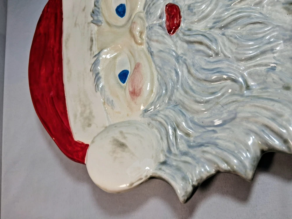 This vintage Santa Claus ceramic cookie plate serving tray mold is a retro collectible perfect for Christmas. Handmade in the United States in the 1970s, it features a classic red and white color scheme with a festive Santa Claus face design. Small chips shown in picture. This unique piece adds a touch of nostalgia to holiday baking and serving, making it a charming addition to any Christmas decor collection.