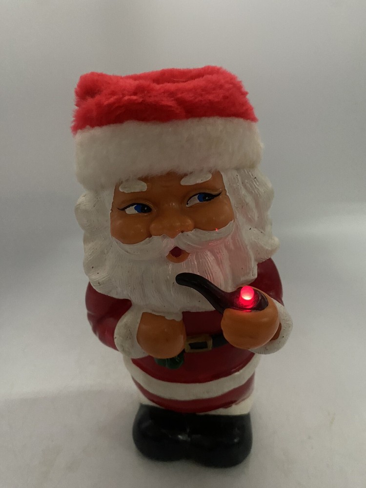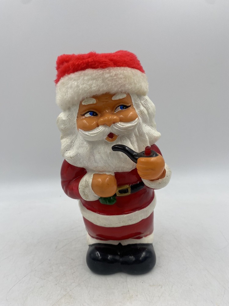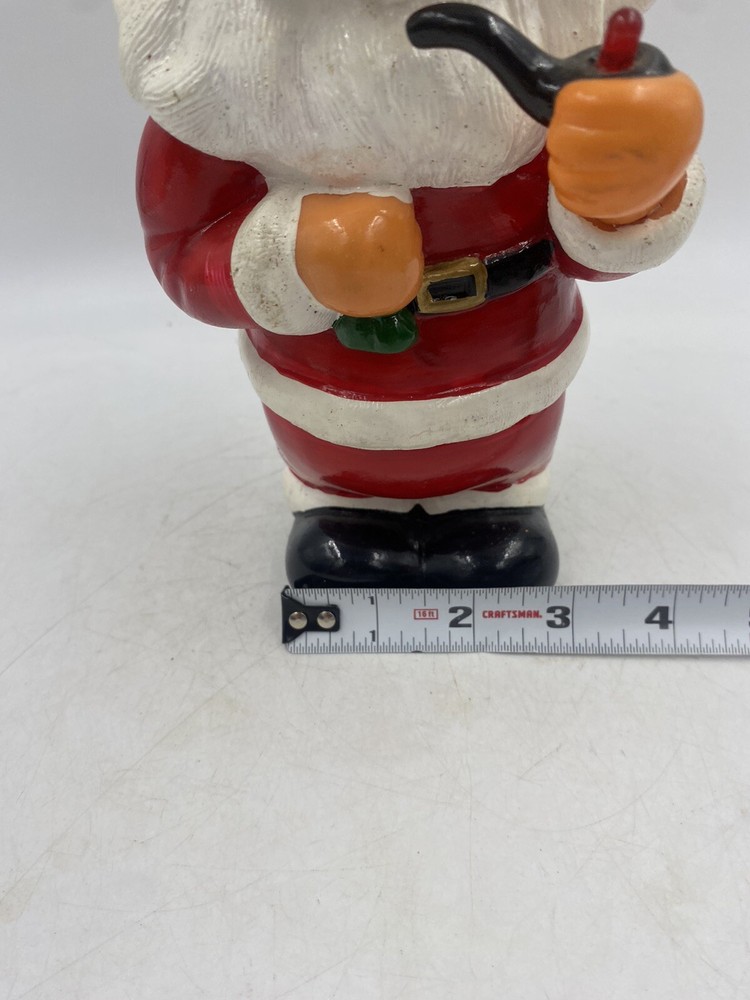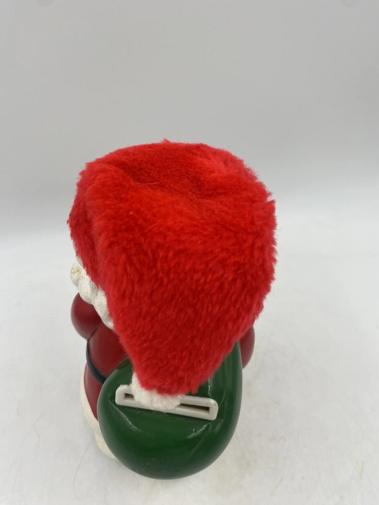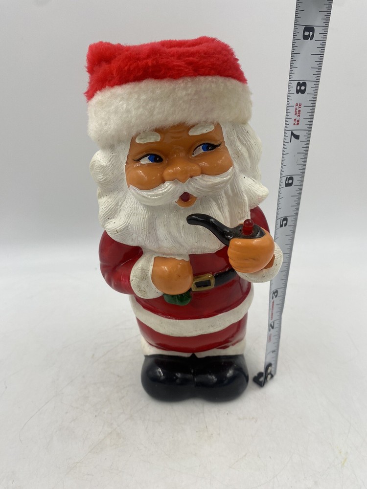 This vintage hard plastic battery powered light up Santa smoking a pipe coin bank DOES NOT PLAY MUSIC. It does require 2 AA batteries that are not included. The light on the pipe lights up as it should when you insert a coin. He does have scuffs and scratches normal signs of age and use. You get the actual item pictured so please look at all photos and ask any questions before purchase.