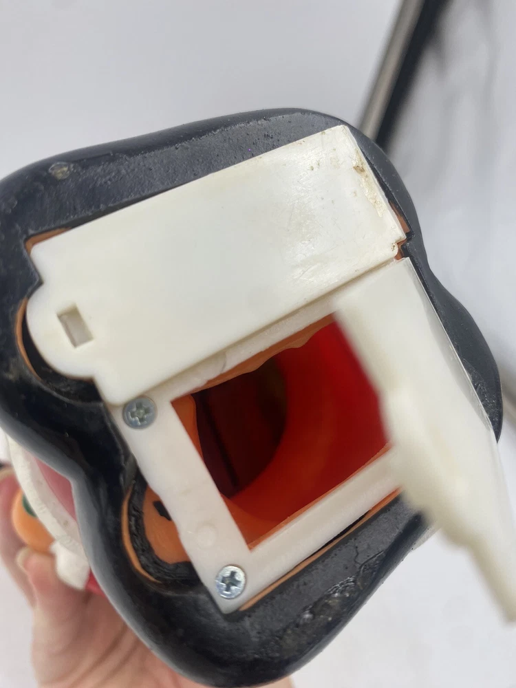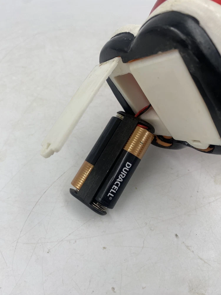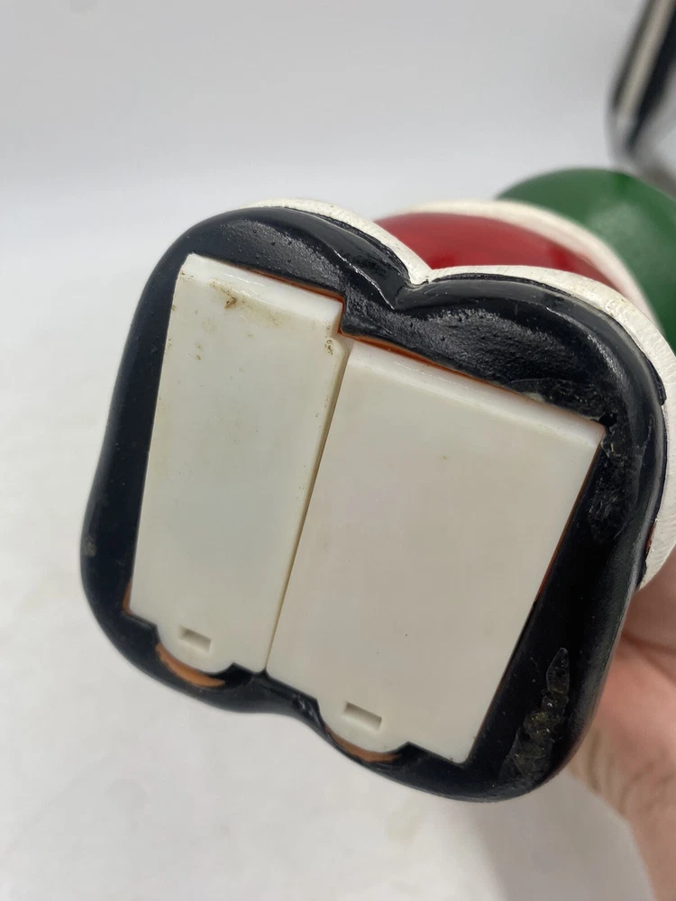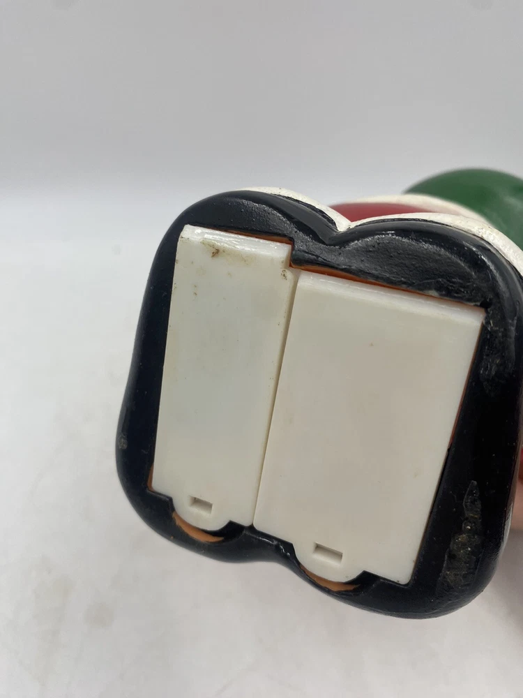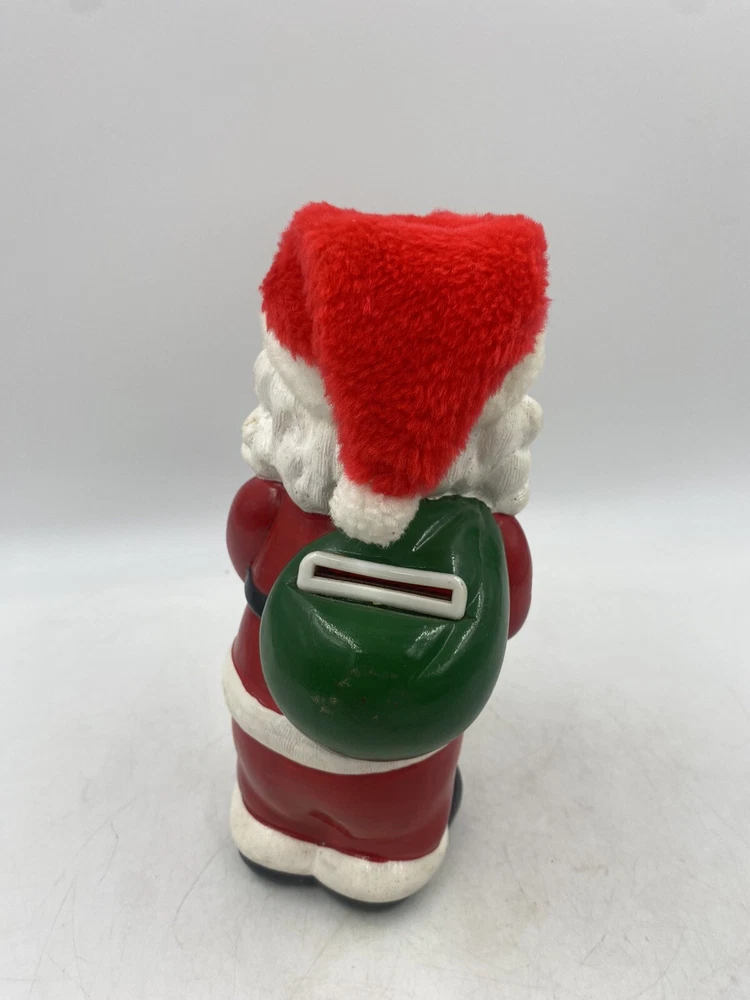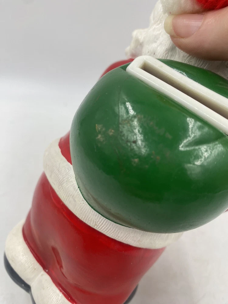 This vintage hard plastic battery powered light up Santa smoking a pipe coin bank DOES NOT PLAY MUSIC. It does require 2 AA batteries that are not included. The light on the pipe lights up as it should when you insert a coin. He does have scuffs and scratches normal signs of age and use. You get the actual item pictured so please look at all photos and ask any questions before purchase.