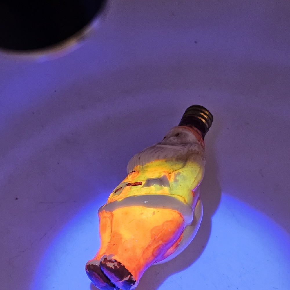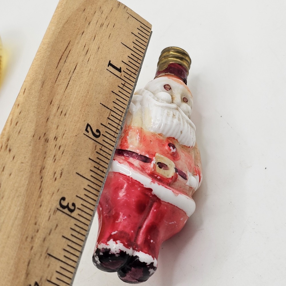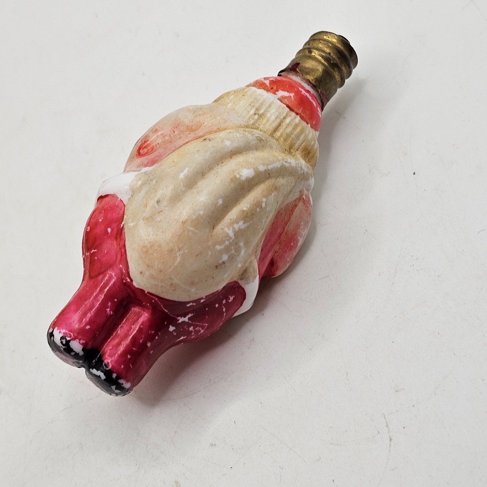 This is a vintage figural Christmas light bulb made of glass and electric power source. The design is a novelty Santa Claus character, perfect for the Christmas occasion. The bulb is an original piece from Japan and has one light sensor. It is a decorative item that glows and has not been tested. I have not tested so selling for parts. There is paint wear. See photos for wear sold as is