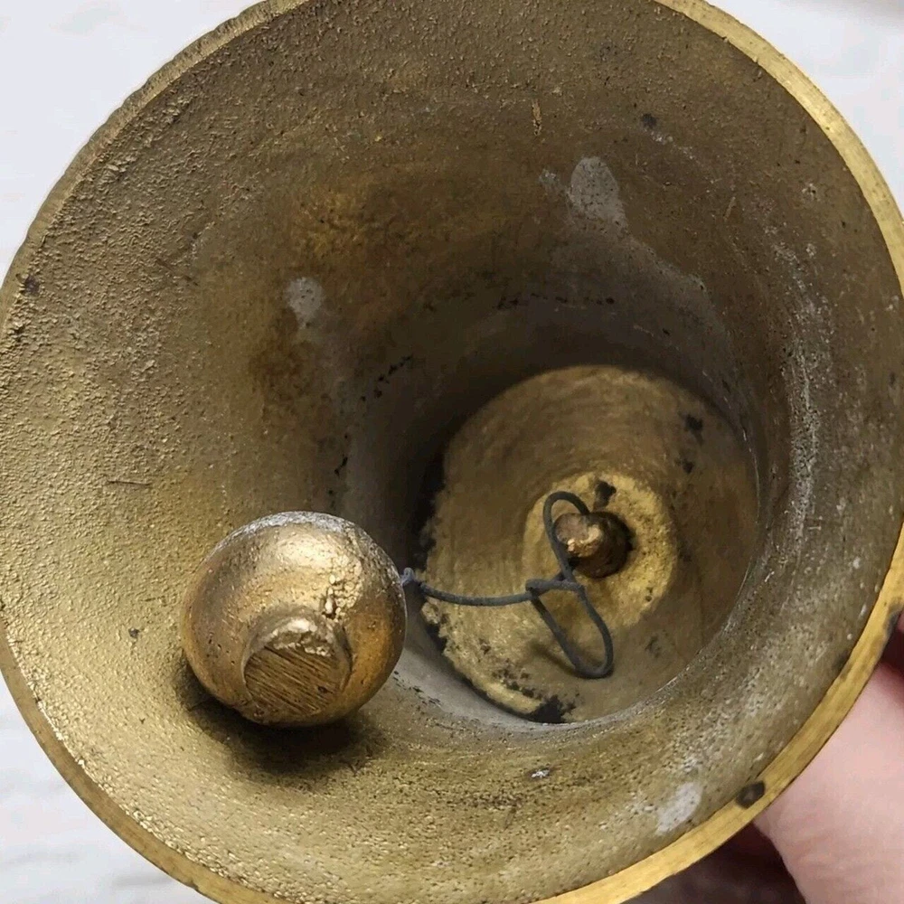 This vintage brass bell features a charming Santa handle and an etched brass tone metal design. Perfect for the Christmas season, this small bell has a metallic finish. The flower etched bell the bell is made of brass and metal. It is a great addition to any Christmas decor and a perfect gift for collectors. The bell is made in Taiwan and comes in a set of 2.