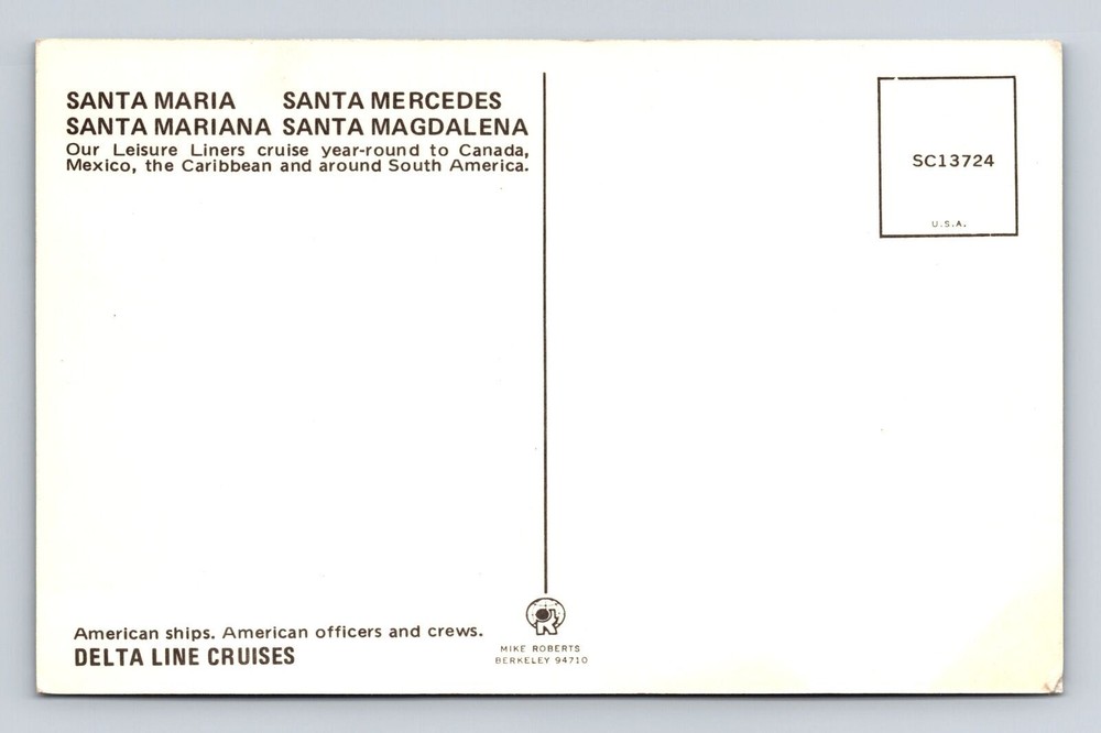 This vintage postcard from The Vintage Postcard Company is a charming piece of history! The Santa Maria, Santa Mercedes, and Delta Line Cruises design is beautifully preserved, and the standard 3.5x5.5 size makes it perfect for collectors. I love that it arrives in a protective sleeve and sturdy mailer—great care is taken to prevent damage. Free US shipping is a nice bonus, and international rates are reasonable. The details are crisp, just as shown in the photos. A fantastic addition to any postcard collection!