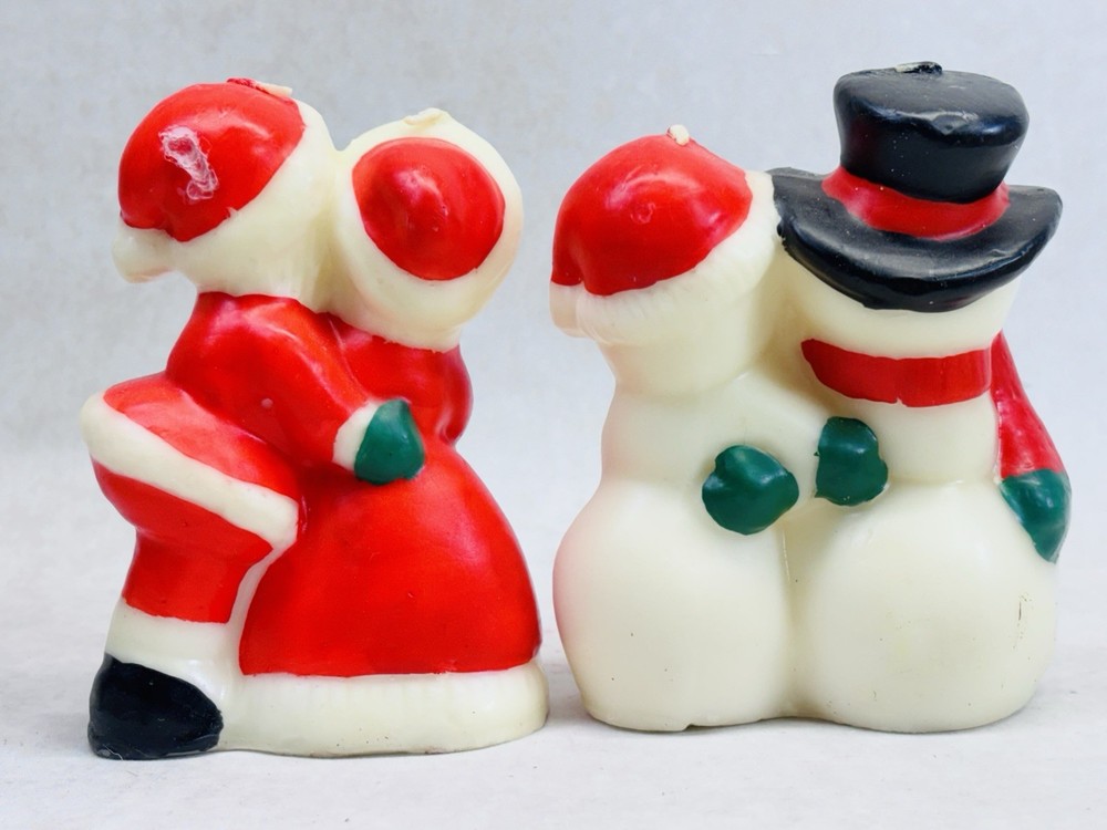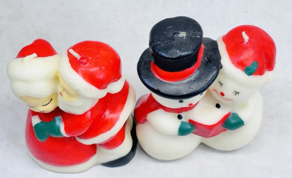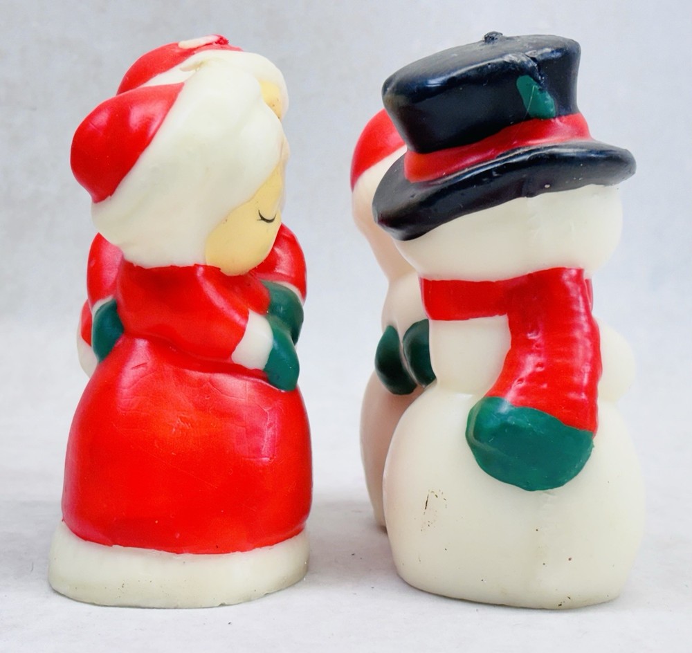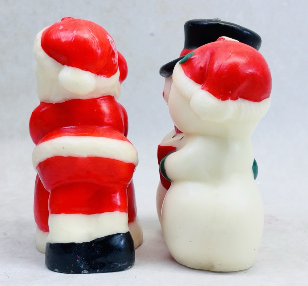 Vintage Santa Mrs Claus Snowman Mrs Snowman Candle Pair Unlit Holiday Decor Vintage molded wax candle pair featuring Santa with Mrs. Claus and Snowman with Mrs. Snowman. Each candle measures approximately 5 inches tall. These are classic holiday figures with hand painted details and a traditional Christmas look. •Vintage candles with exact age unknown •Unlit with original wicks intact •Good overall condition with light surface wear from age and storage •No cracks or breaks observed •Sold as decorative collectibles Please review all photos carefully for condition details, as vintage wax candles may show minor imperfections from age and handling.