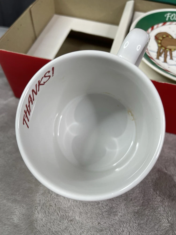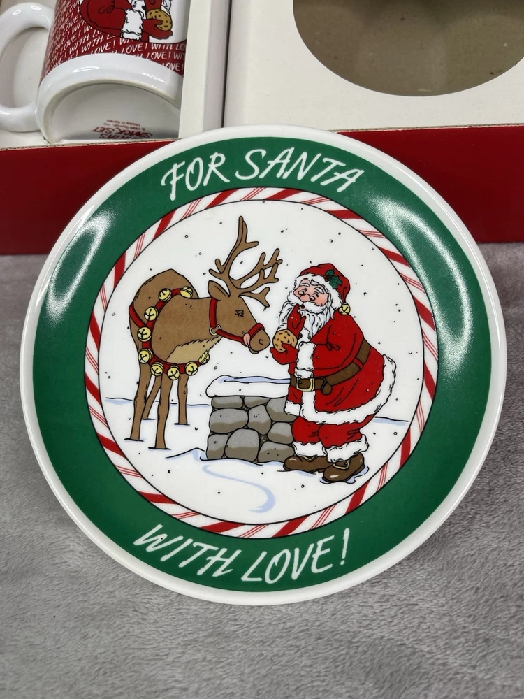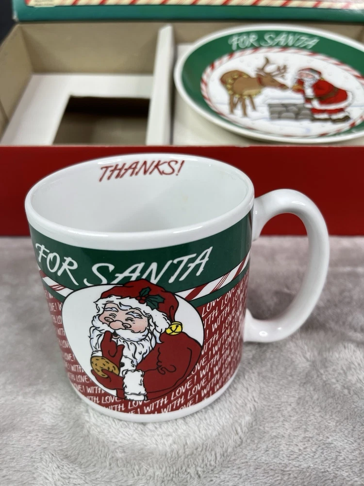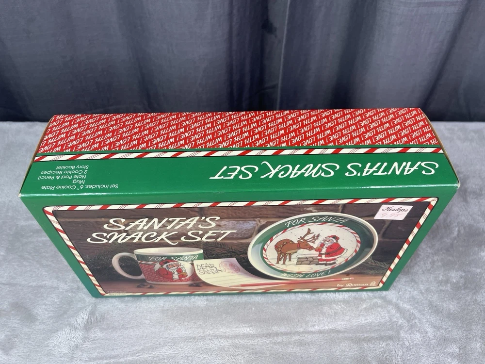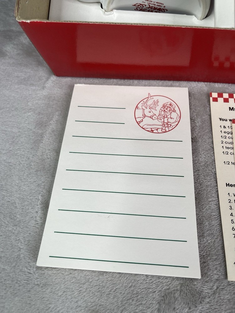Missing storybook and pencil. Great condition!Comes with plate, mug, recipes, and Santa letterheads. Small stain inside cup. Has some cracking on plate.
