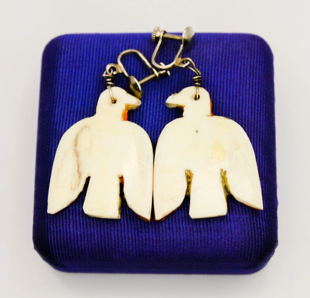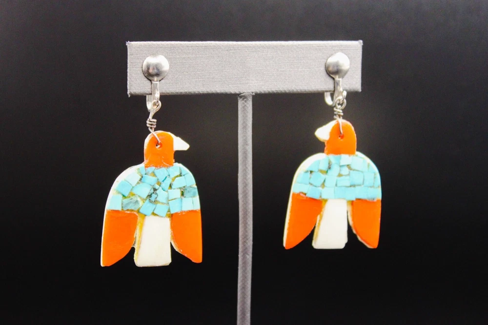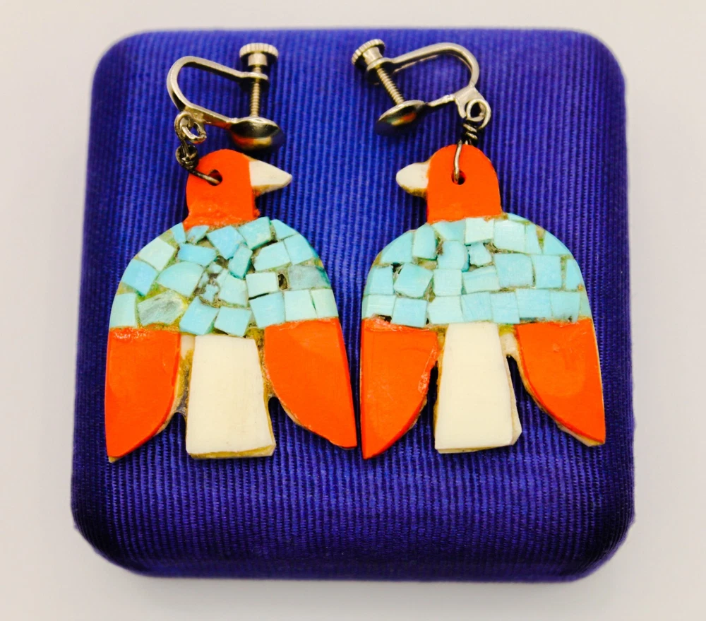 Hello and Welcome! Incredible pair of vintage Santo Domingo Pueblo thunderbird screw back earrings in beautiful, bright orange, turquoise blue, and a creamy white. Add a splash of color to your wardrobe! The buyer could swap out the screw backs for post earrings if they wished. This is an early to mid 20th century pair of Santo Domingo Depression Era Thunderbird earrings. Typical of this time period, the earrings are made with turquoise, various plastic materials, likely taken from things like battery casings, comb teeth, plastic utensils, or toothbrush handles, inlaid on a solid creamy white backing. The screw backs are in silver tone metal. The estimated time period that these were made was most likely during the Depression Era, c. 1930s. Size: 2-1/4 inches Long x a little over 1 inches Wide. The drop length is almost 1-1/2 inches. Condition: Very good vintage condition. Please see photos for details. Please review the item description and photos carefully, prior to purchasing as most of our items are vintage or gently pre-owned. Please note that colors may appear differently on each computer screen. We do utilize the zoom feature in our photography in order for the buyer to see the item in all aspects as clearly as possible. Therefore items may appear larger. We always note item sizes in the listing. We test all precious metals and gemstones. If you are unsure about anything or have questions, please ask them prior to purchasing. We ship quickly and carefully. Satisfaction is guaranteed. Thank you for visiting!