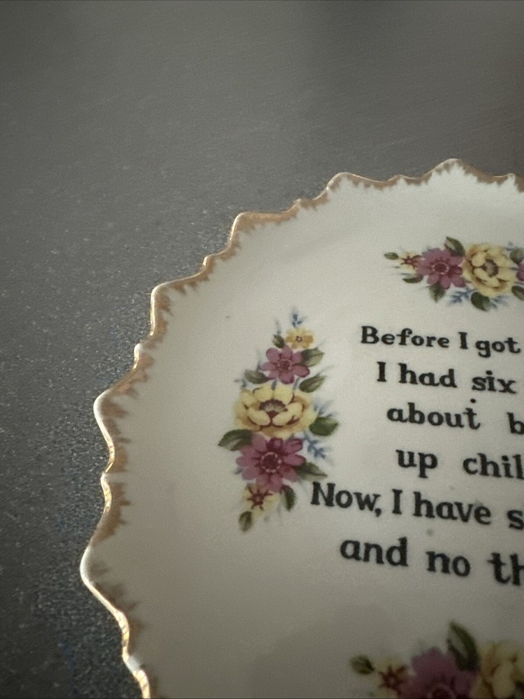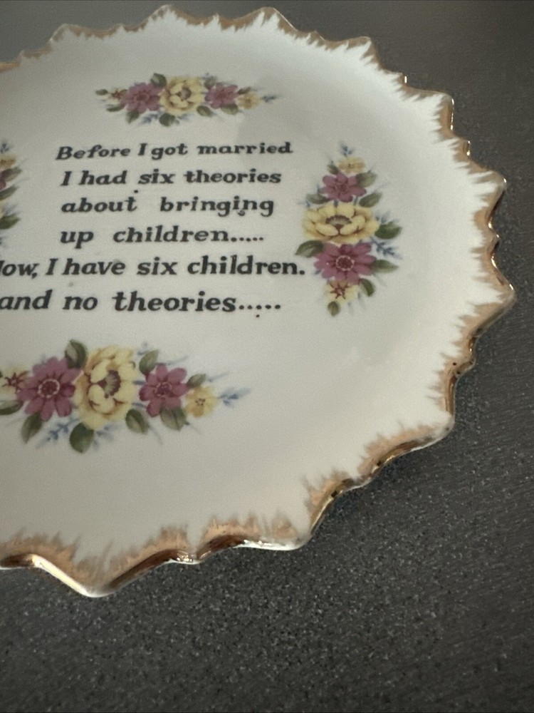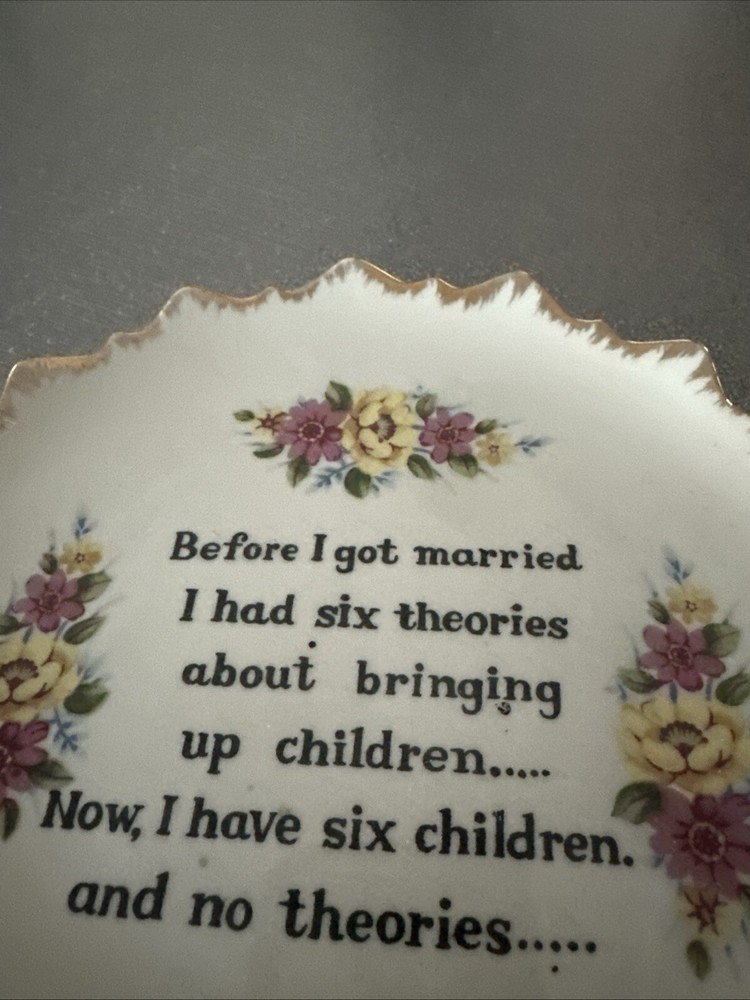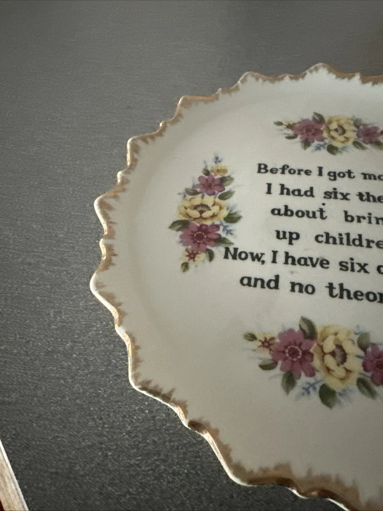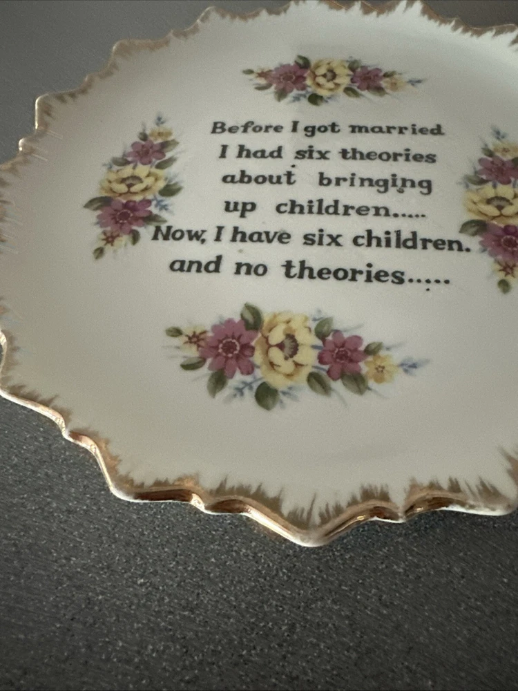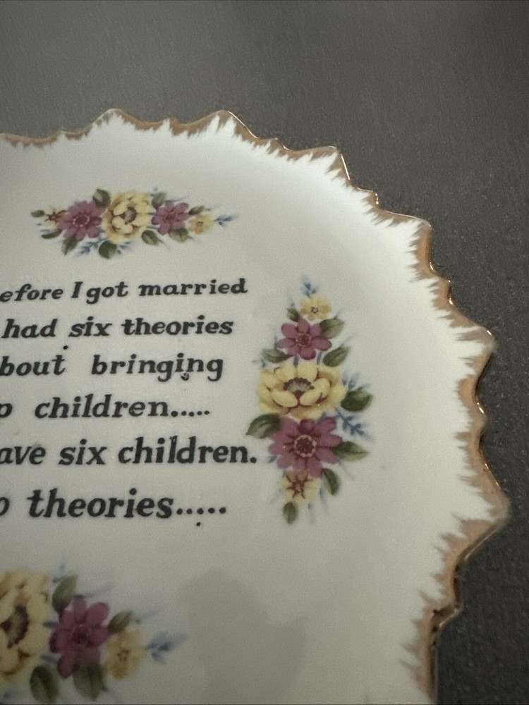 This vintage collector plate features a funny and sassy design with a theme of family and home. Made of ceramic in Japan, it showcases quirky theories about married life and children. The plate is white in color and includes a string for easy hanging. It is a unique piece for collectors looking for a touch of humor and kitsch in their decor.