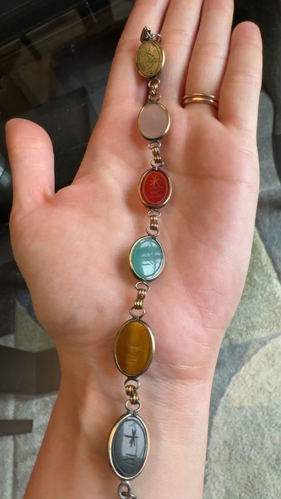 Vintage Scarab Link Bracelet Natural Various Stones Carved Size 7.25. Looks like it may have been gold plated but nearly all has worn off. Clasp is stamped sterling. Metal under the gold plating unknown but it is not magnetic and is silver in tone- could be sterling silver but not tested. Feel free to reach out with any questions.