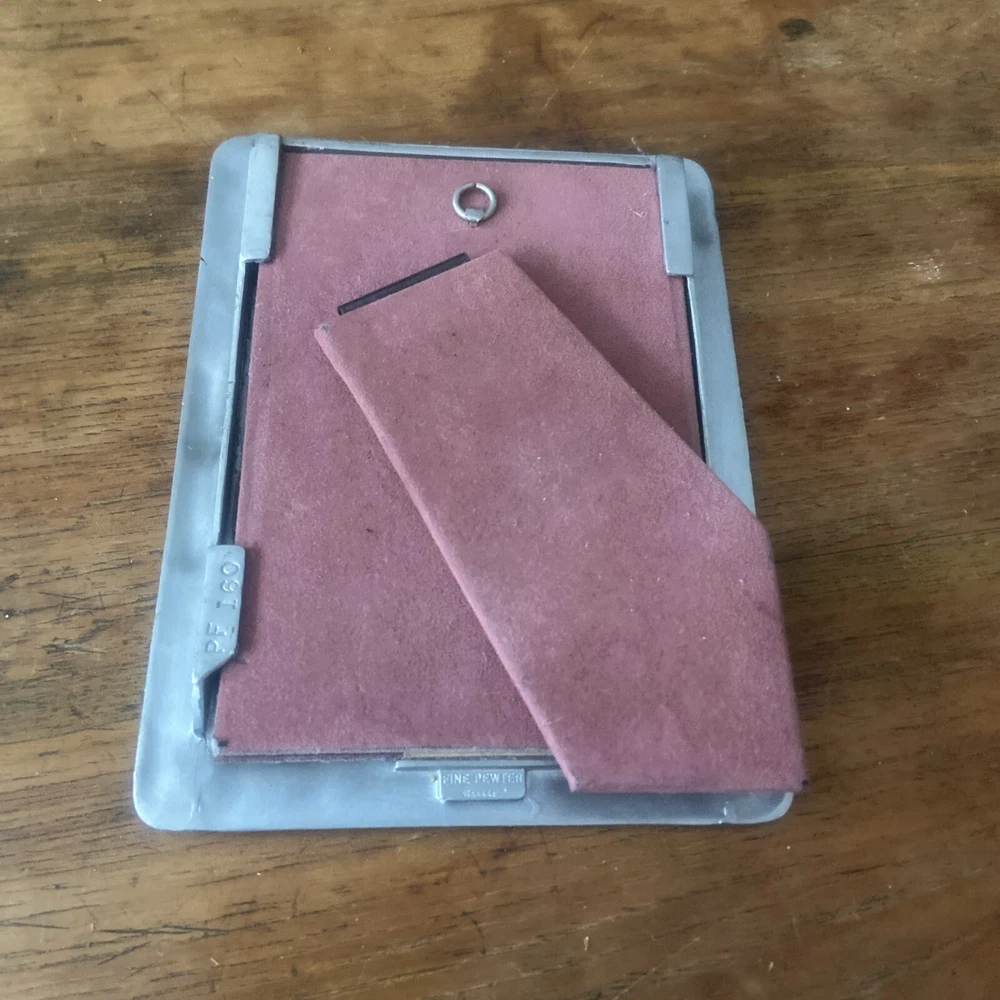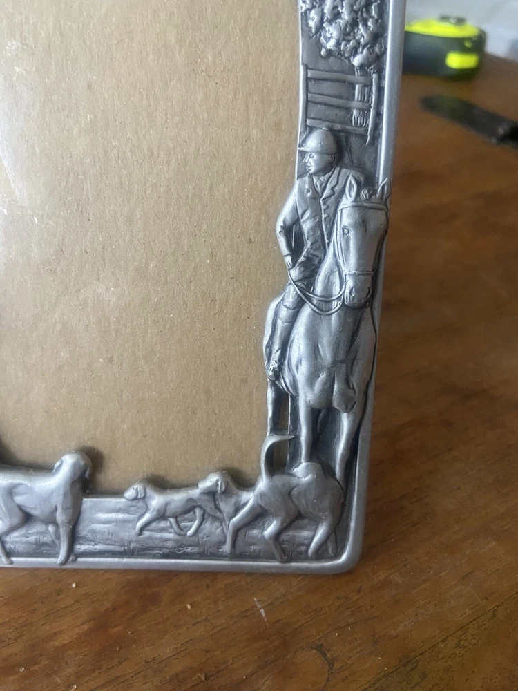 Vintage Seagull brand Pewter 3.5x5 Picture Frame- horse themed. Pink velvet reverse side. Can stand or hang with clip on back