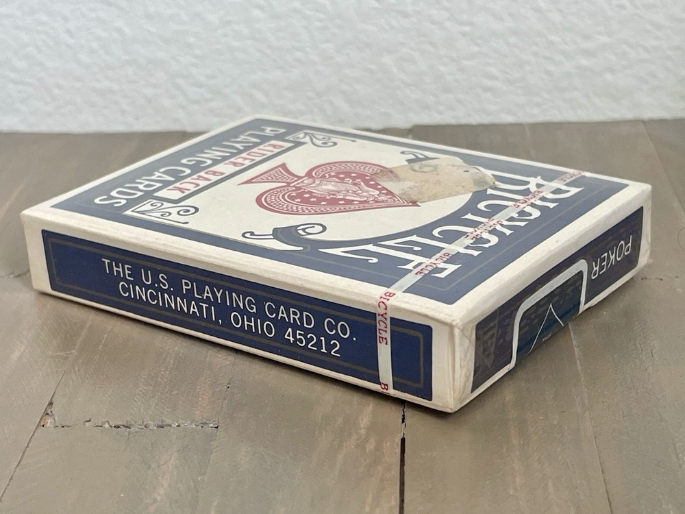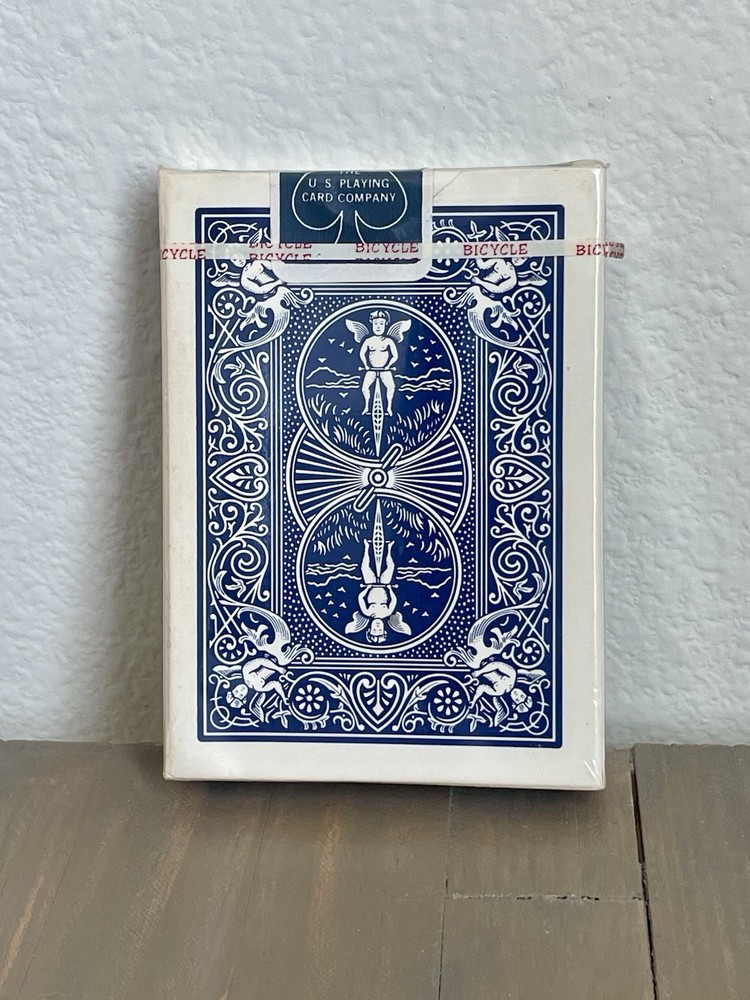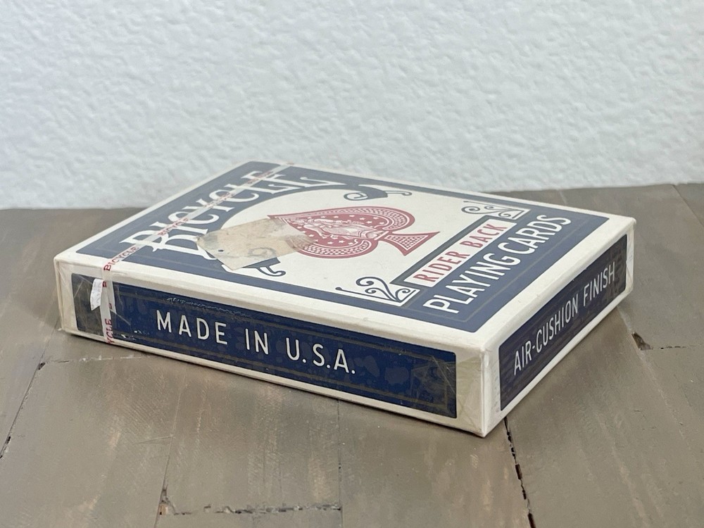 This product is a set of vintage sealed Bicycle Rider Back playing cards in blue, made in the United States. As a collectible item, these cards hold a nostalgic value and are sought after by collectors of playing cards. The brand Bicycle is known for its high-quality playing cards, making this set a desirable addition to any collection. With its classic design and American craftsmanship, this product appeals to those with a love for vintage items and traditional games.