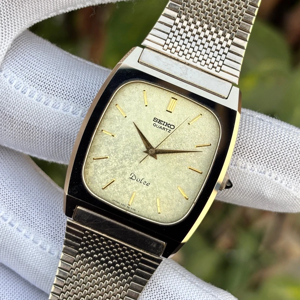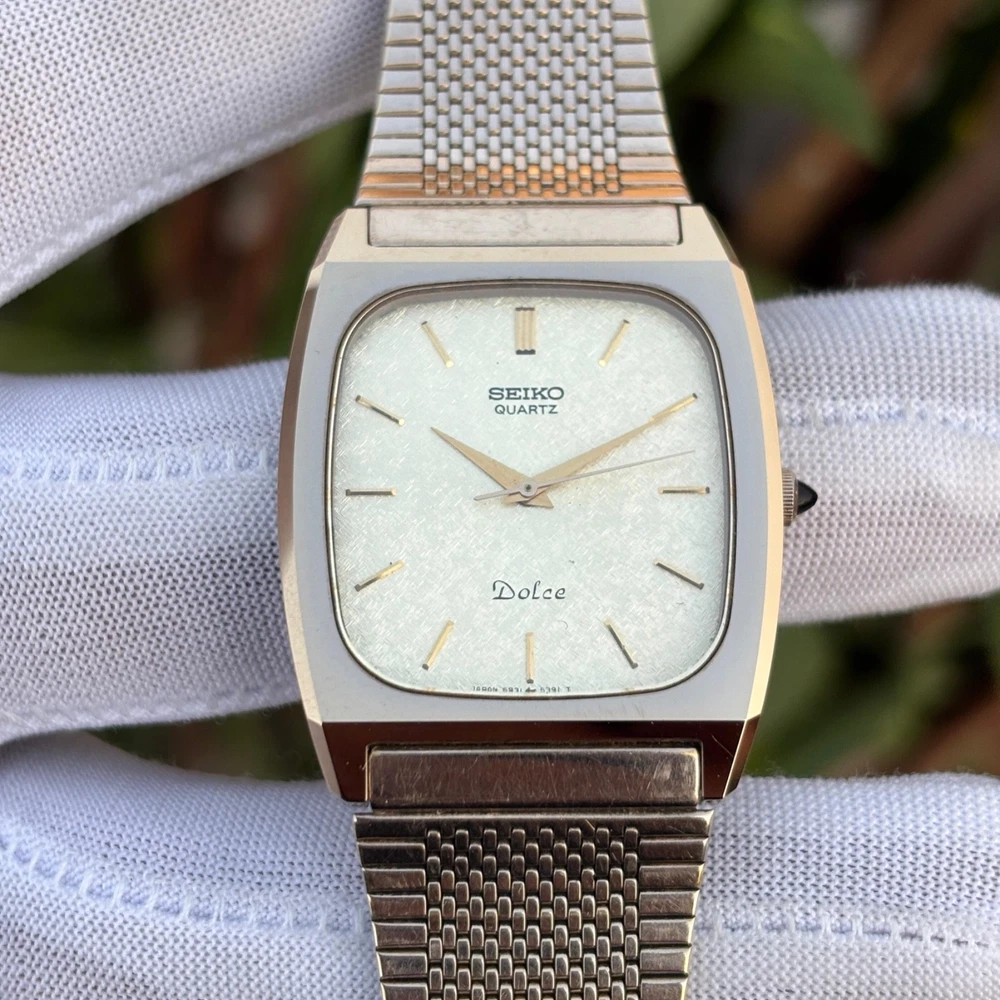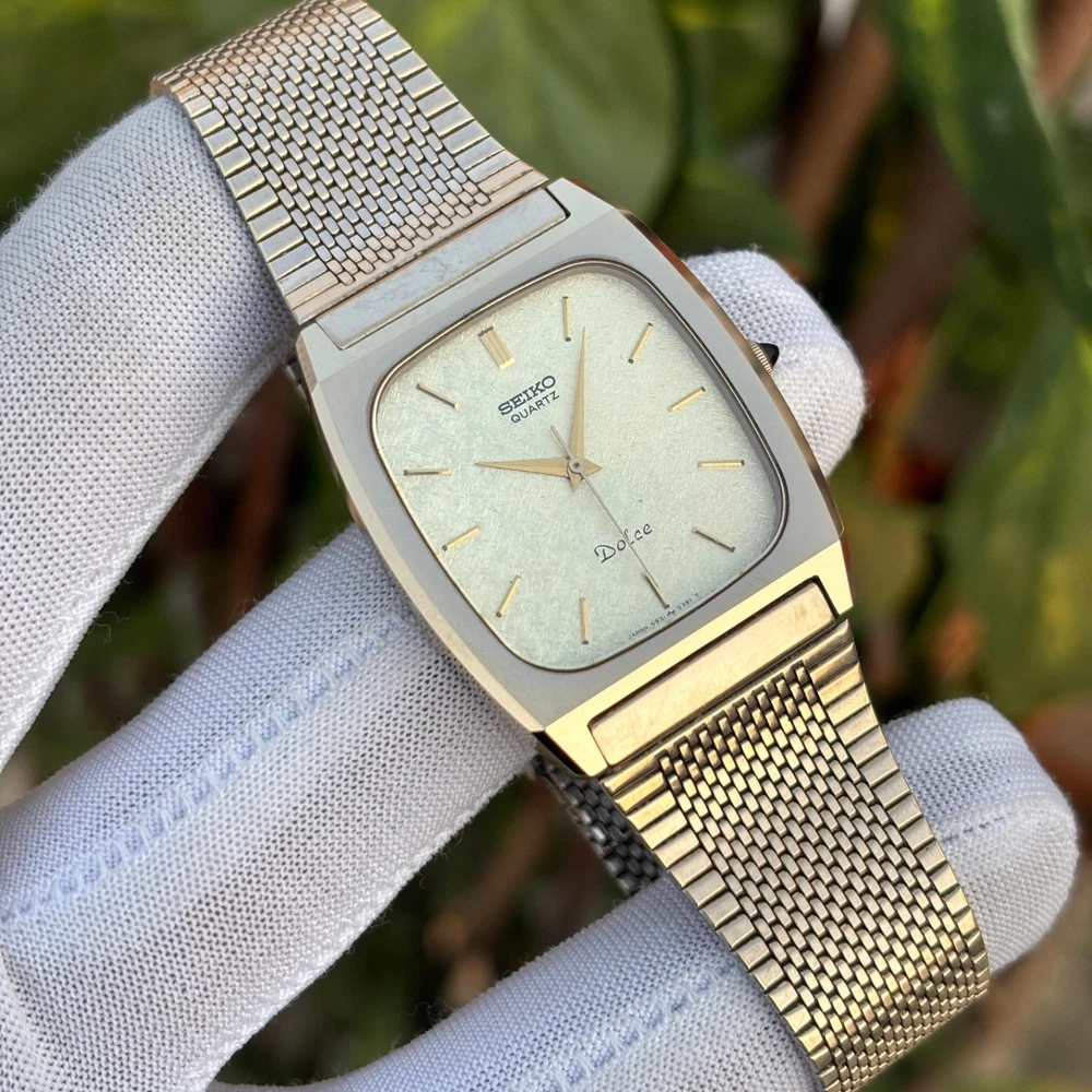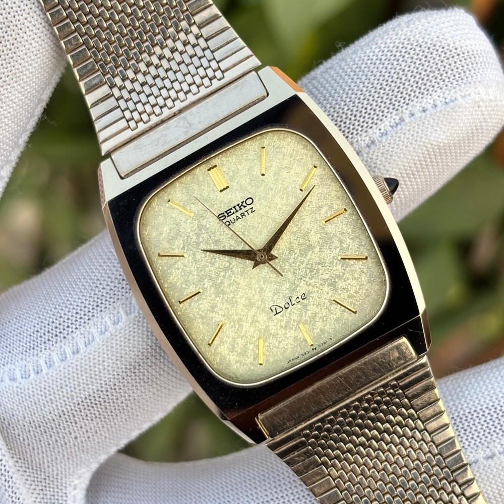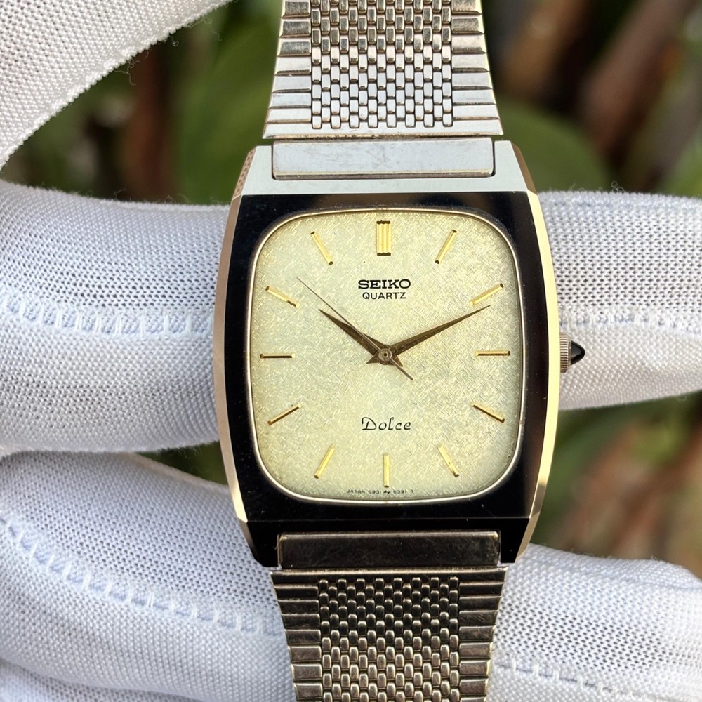 Vintage Seiko Dolce NSAG Snowflake Sapphire Crystal Japan Quartz Watch 5931-5340 Up for sale Seiko Dolce watch from my collection. The watch is working nicely and fully inspected before listing up for sale. It has some cosmetic signs of usage that can be seen in photos. Watch came with an original Seiko SGP stainless steel bracelet. Plz study photos for more details. Other Details: ๐ธ The Seiko Dolce range is renowned for its high-precision quartz movements and understated yet refined design. ๐ธ The Seiko Dolce 5931-5340 NSAG is a sophisticated men's watch, distinguished by its elegant design and durable stainless steel back. ๐ธ The Seiko Dolce captures the essence of a classic dress watch, with a design that radiates understated elegance. ๐ธ It features a captivating snowflake textured dial, exuding understated refinement. ๐ธ The watch boasts a sleek and elegant shaped case, offering a distinctive and rare design. ๐ธ The watch showcases an elegant golden dial with a snowflake textured, complemented by Dauphine-style golden hands and matching hour markers that enhance its visual appeal. ๐ธ The watch case is crafted from NSAG, an exceptionally durable alloy known for its high surface hardness and resistance to minor scratches. ๐ธ The NSAG material gives the case a sharp-edged appearance, and adds to its striking vintage dress watch aesthetic. ๐ธ The watch has a top-quality sapphire crystal, known for its scratch resistance and durability, making it a rare and excellent choice for luxury watches. ๐ธ The watch features a crown with an intact black onyx stone and is in excellent condition. Watch Measurements:- Case Size: 30 MM Case with crown: 32 MM Lug To Lug Size: 36 MM Bracelet Wrist Size: Adjustable Bracelet End link Width: 19 MM Thanks! Please visit my eBay account and follow me, I am selling Classic and rare vintage gem watches at reasonable prices. We don't test watches for waterproofing. Postage Details: I offer worldwide shipment, watches will be delivered through UPS/FedEx Which may take 10 to 18 Days. Please be informed that any import duties will be paid by the buyer. SKU: BK-โ176-ND