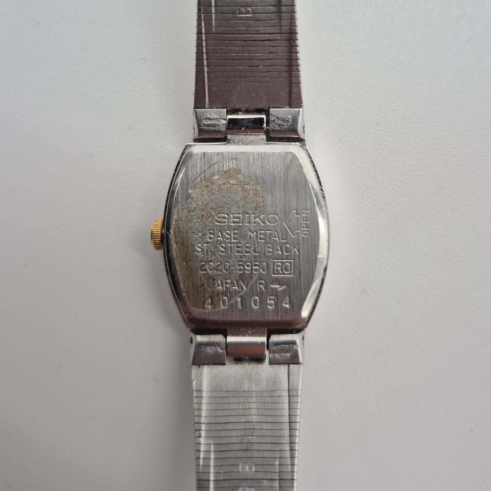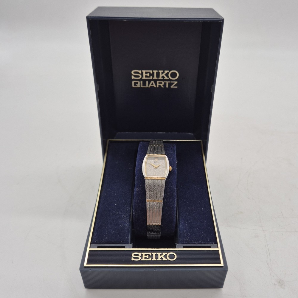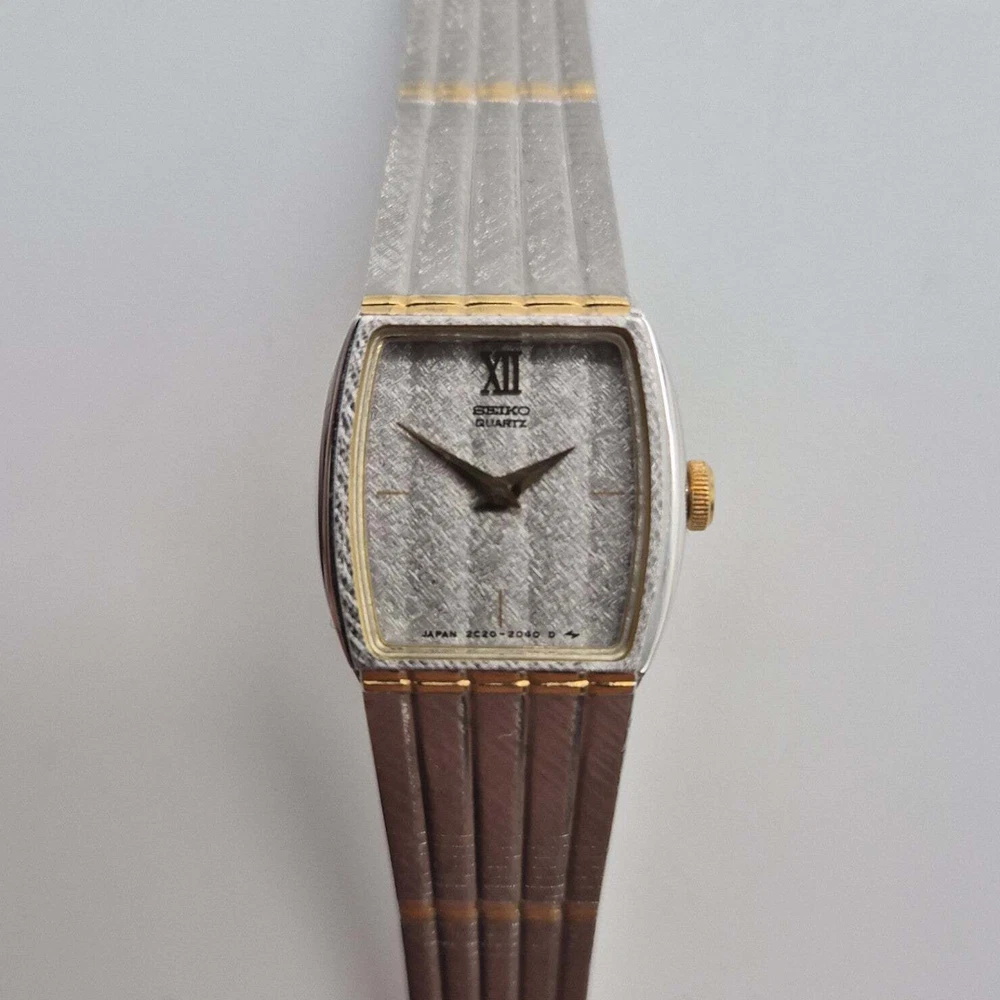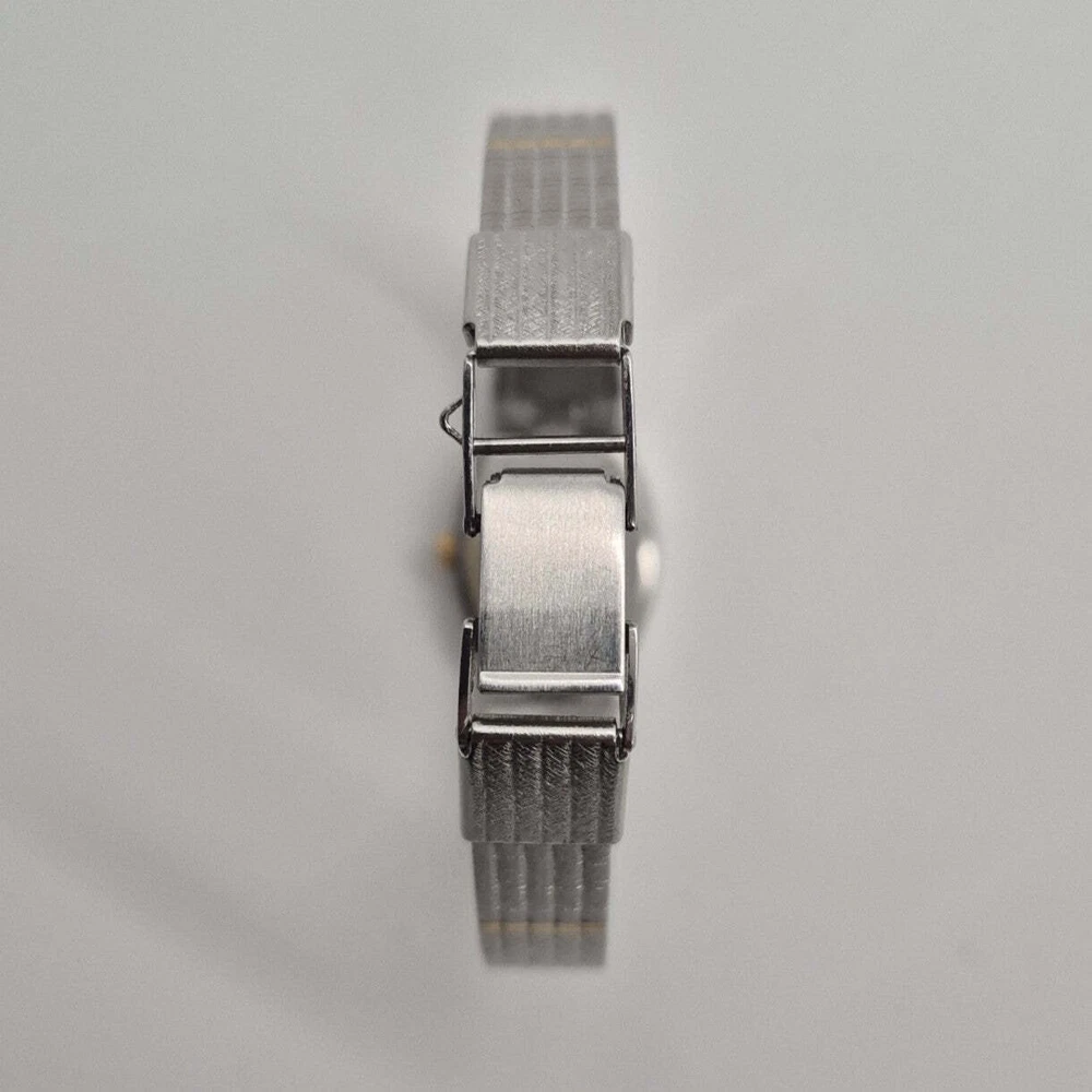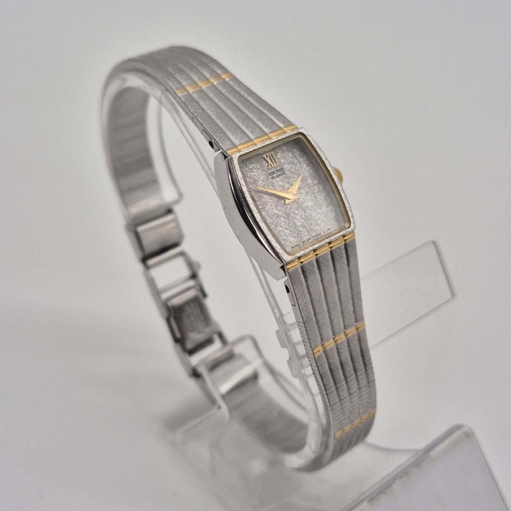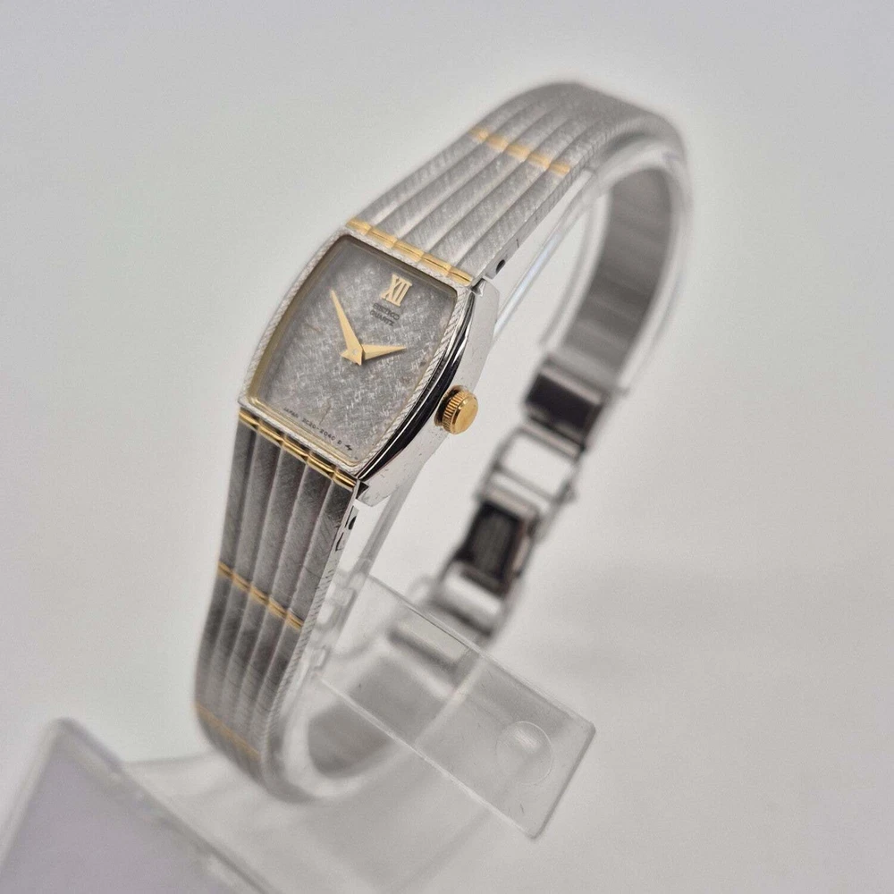 Diese wunderschöne Seiko Damenarmbanduhr besticht durch ihr rechteckiges Gehäuse und ein präzises Quarzwerk. Das silberne Zifferblatt mit goldenen Akzenten verleiht ihr eine klassische und zugleich edle Optik. Der Metallarmband mit feinem, geprägtem Muster verbindet Silber- und Goldtöne harmonisch und unterstreicht das feminine Design. Perfekt für besondere Anlässe oder als elegantes Accessoire im Alltag. Details: Marke: Seiko Artikelnummer: FES0325 Zustand: Gebraucht Material: Edelstahl mit goldfarbenen Akzenten Herkunft: Japan Funktionen: Quarzwerk, Datumsanzeige Gewicht: Ca. 50 g Besondere Merkmale: Klassisches Design mit rechteckigem Gehäuse Hochwertiges, zweifarbiges Metallarmband Präzises Quarzwerk für exakte Zeitmessung