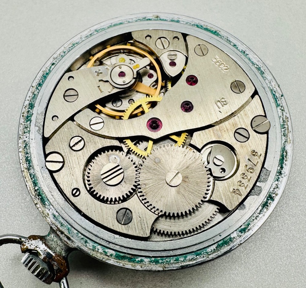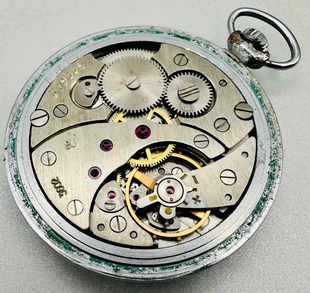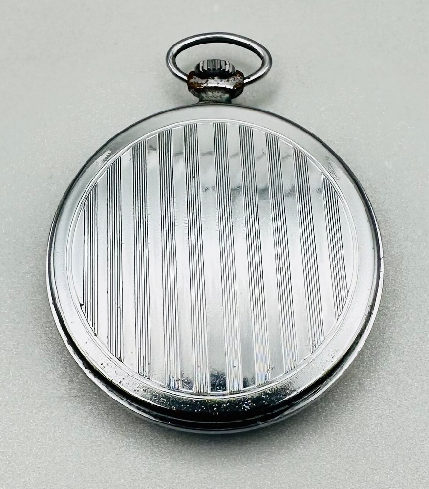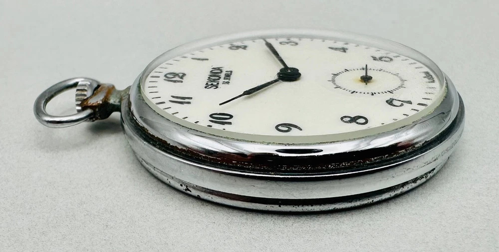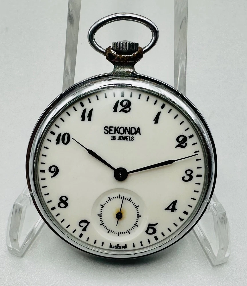 Vintage Sekonda 18 Jewels Pocket Watch – USSR Made – Working – 3602 Movement Description: A classic vintage Sekonda 18 Jewels pocket watch, made in the USSR and powered by the 3602 movement . This timepiece has been tested and winds, ticks, and keeps good time over 24 hours . A fantastic addition to any collection, or perfect for daily use by a vintage watch enthusiast. Key Details: Brand: Sekonda Movement: 3602 (with serial number 379334) Jewel Count: 18 Jewels Country of Origin: USSR Dial: White with black numerals Case Material: Plated metal Condition: Good condition overall with some tarnishing to the plating on the case Performance: Winds and ticks along, kept good time over 24 hours Dimensions: Case Diameter: 44.8mm Condition: Fully working – winds and ticks along Good timekeeping over 24 hours Some tarnishing to the plating on the case Case and crown show wear from age and use Summary: This vintage Sekonda pocket watch is a great piece for collectors of Soviet-era timepieces or anyone looking for a stylish, functional pocket watch. It offers classic Soviet-era craftsmanship and is an interesting piece of horological history. As usual, this item will be packaged carefully and dispatched with tracking. International shipping is available upon request.