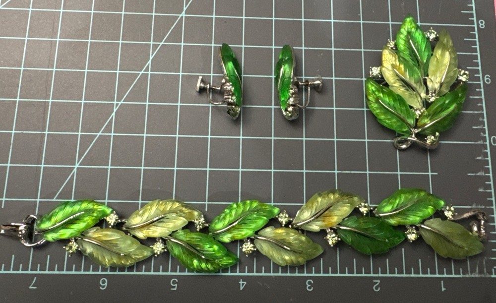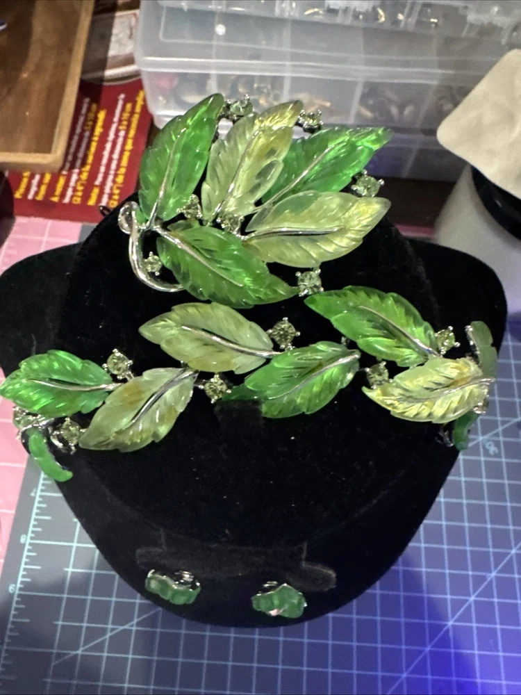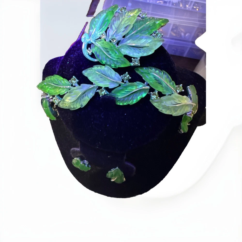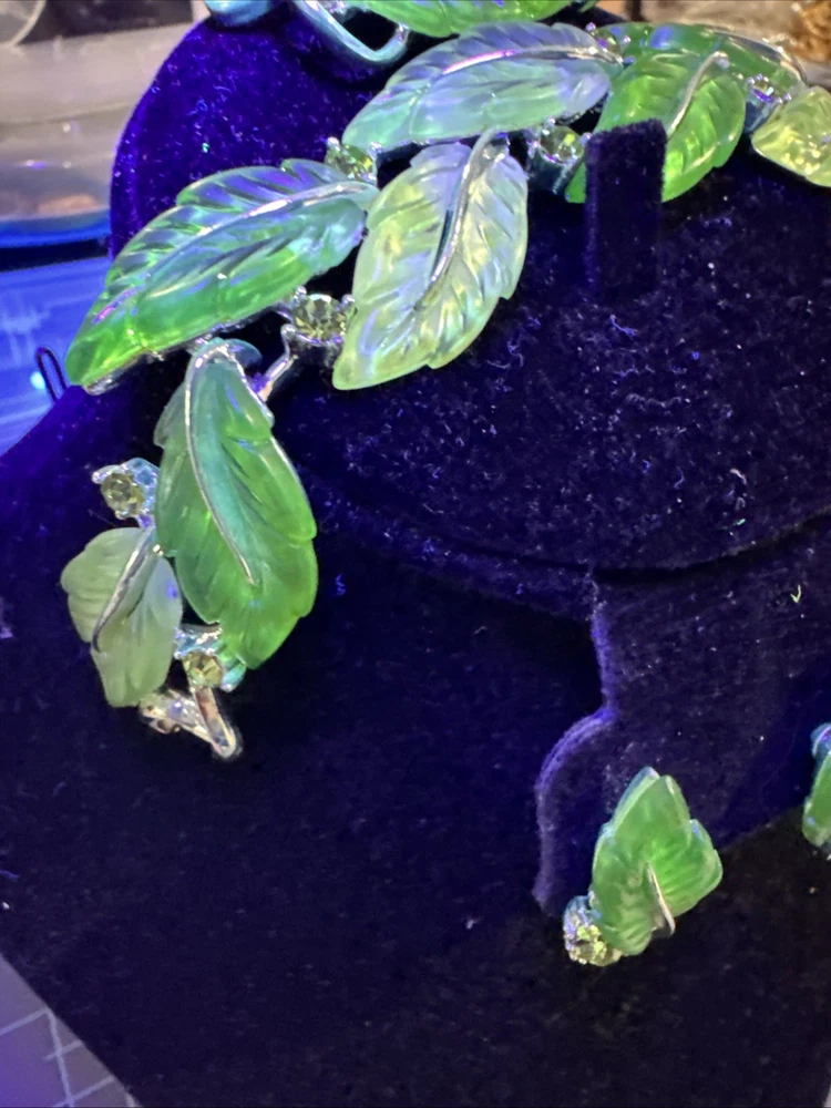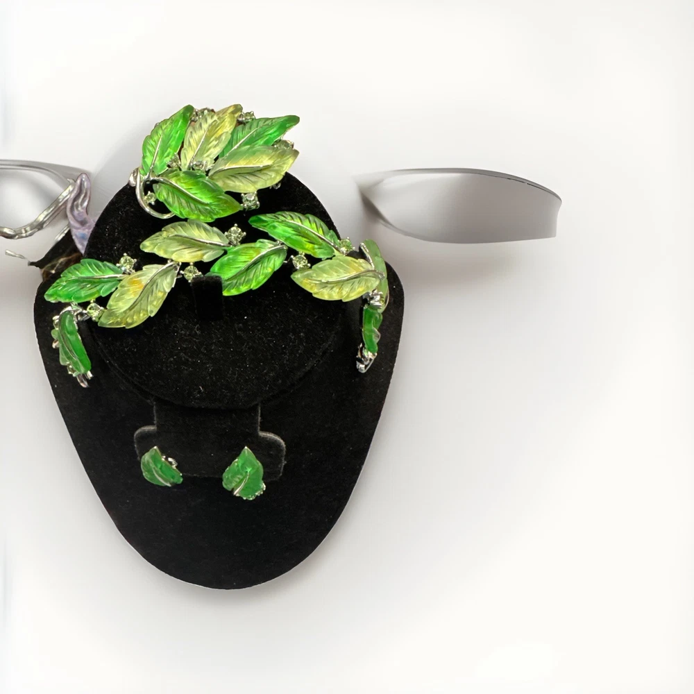 The Vintage Lisner Green Leaf Brooch Bracelet & Earrings Set features a beautiful green rhinestone design, perfect for special occasions such as weddings, anniversaries, and birthdays. The set includes a brooch, bracelet, and earrings, all signed by the brand Lisner. The green crystals and glass stones add a touch of beauty and elegance, making it a timeless piece of jewelry that can be worn on various occasions. The adjustable features ensure a comfortable fit, and the set is a perfect gift for Mother's Day, Father's Day, or Christmas.