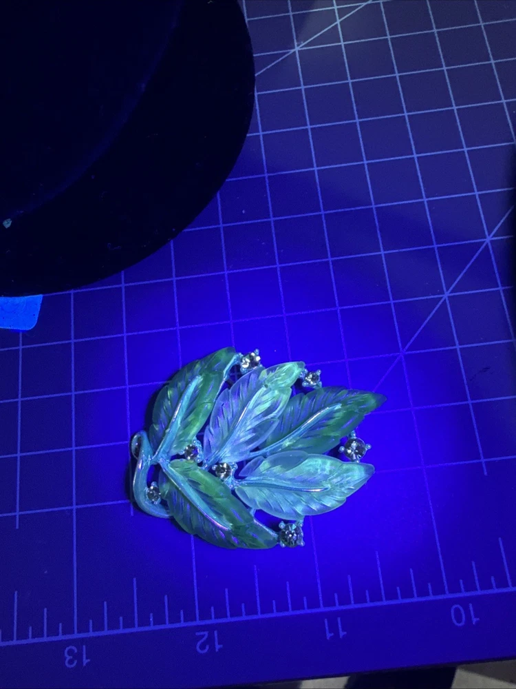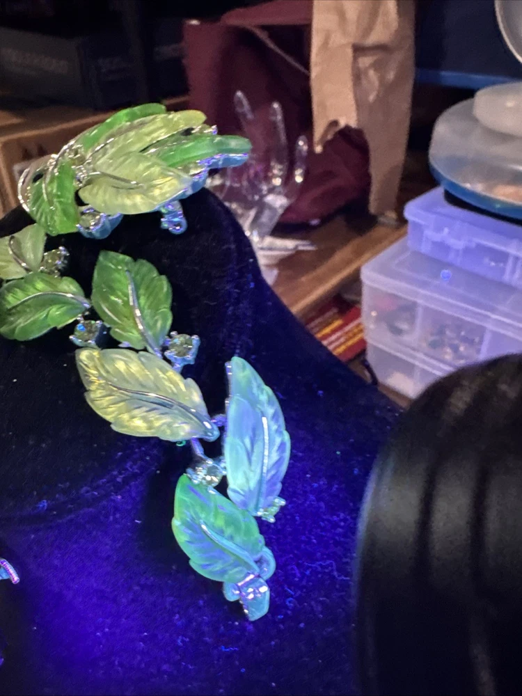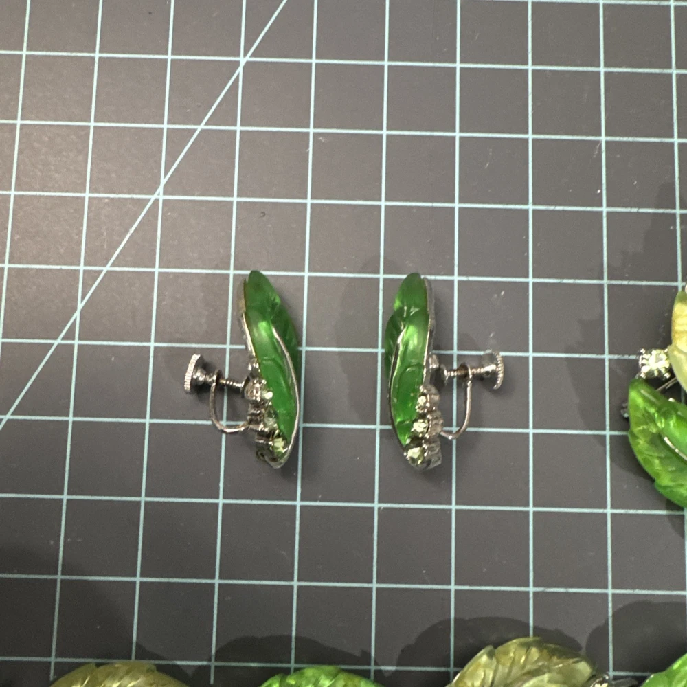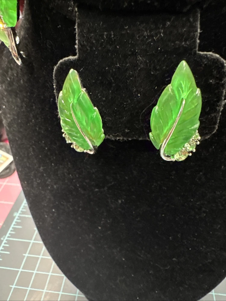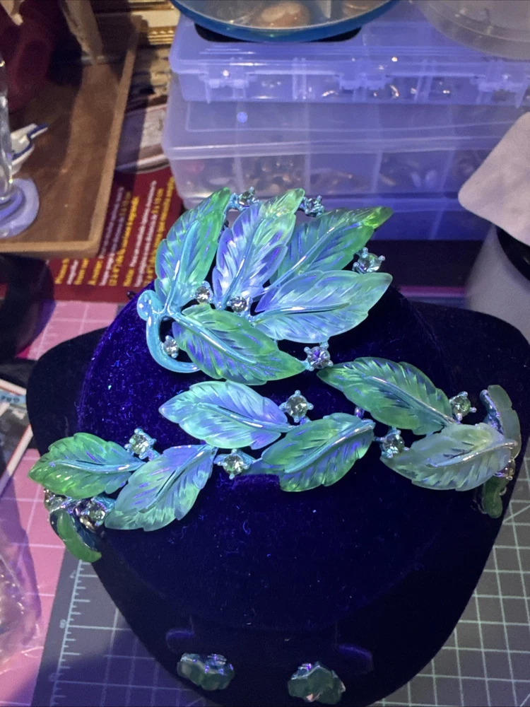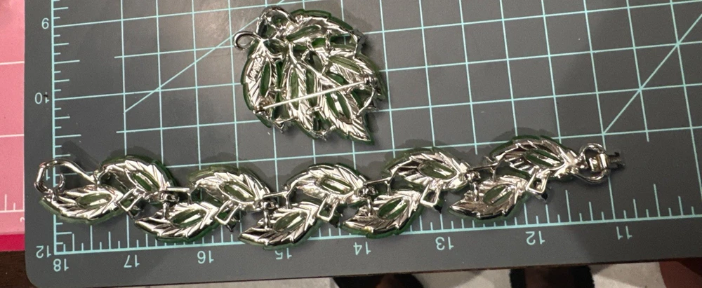 The Vintage Lisner Green Leaf Brooch Bracelet & Earrings Set features a beautiful green rhinestone design, perfect for special occasions such as weddings, anniversaries, and birthdays. The set includes a brooch, bracelet, and earrings, all signed by the brand Lisner. The green crystals and glass stones add a touch of beauty and elegance, making it a timeless piece of jewelry that can be worn on various occasions. The adjustable features ensure a comfortable fit, and the set is a perfect gift for Mother's Day, Father's Day, or Christmas.