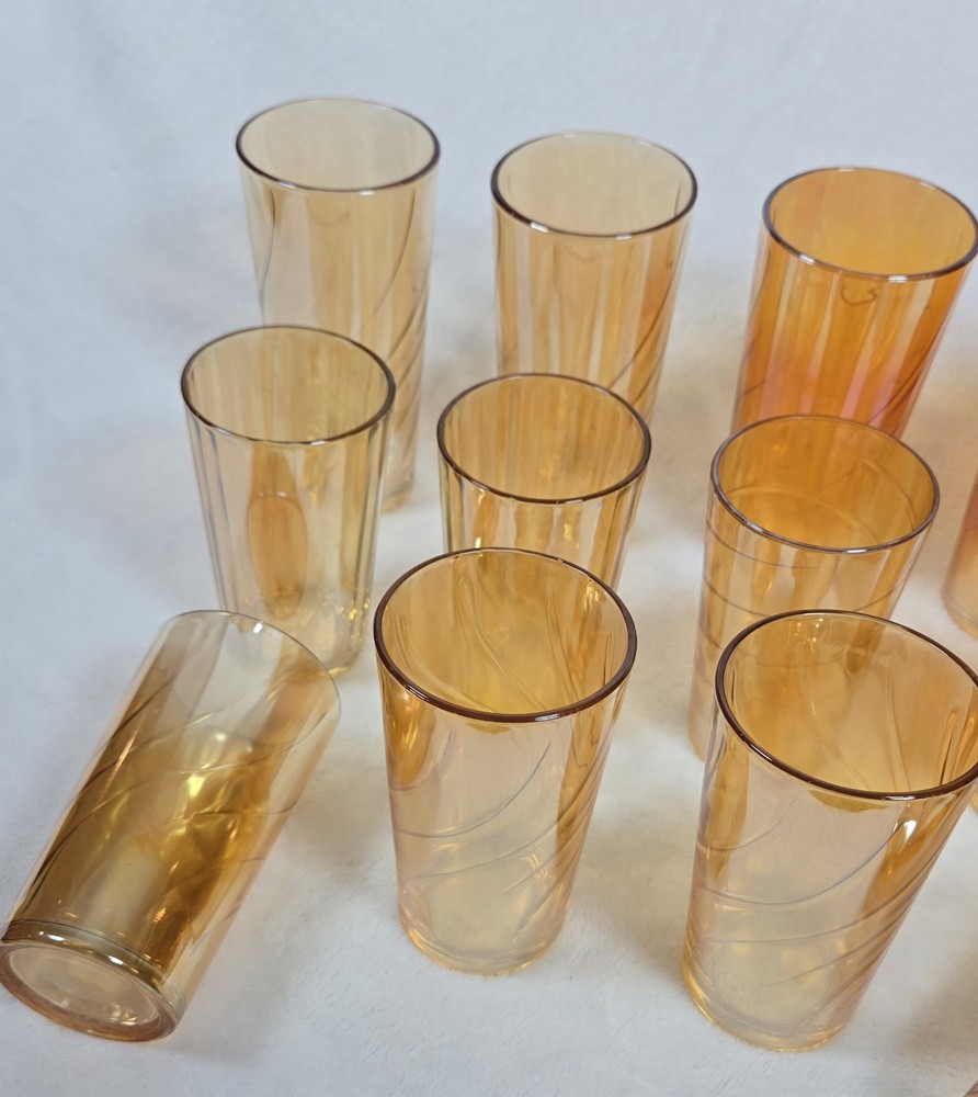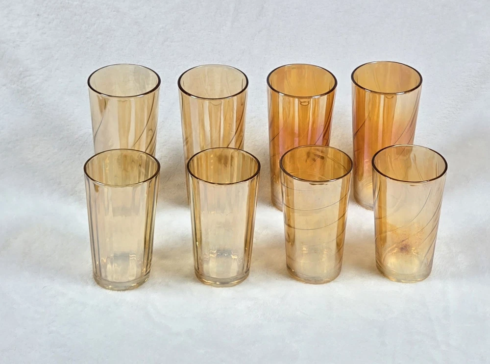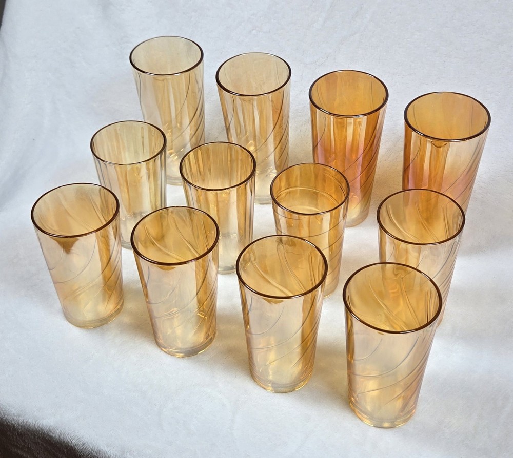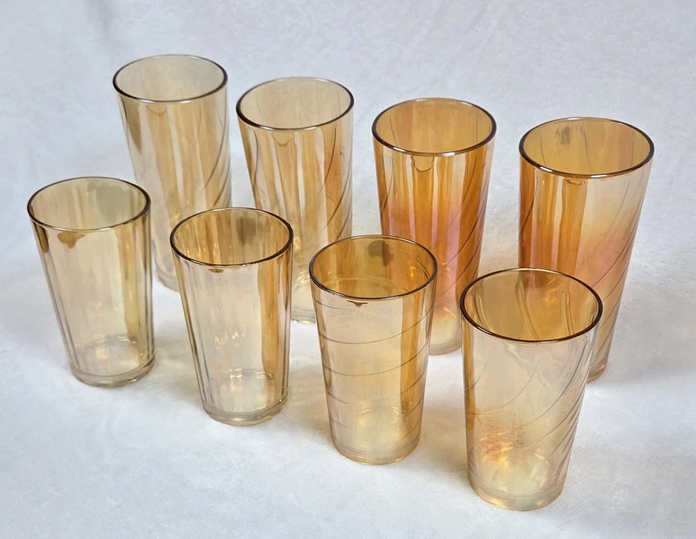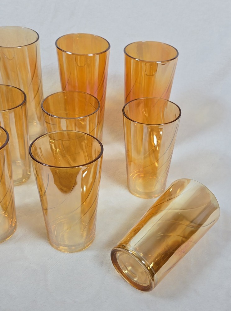 Vintage Set Of 12 Jeanette Iridescent Carnival Glasses-Marigold Spiral Swirl Please feel free to ask any questions you may have. Thank you for looking. *** 3 of the glasses have a slightly different pattern on them. *** 4 of the glasses are the same size, and 8 are the same size.