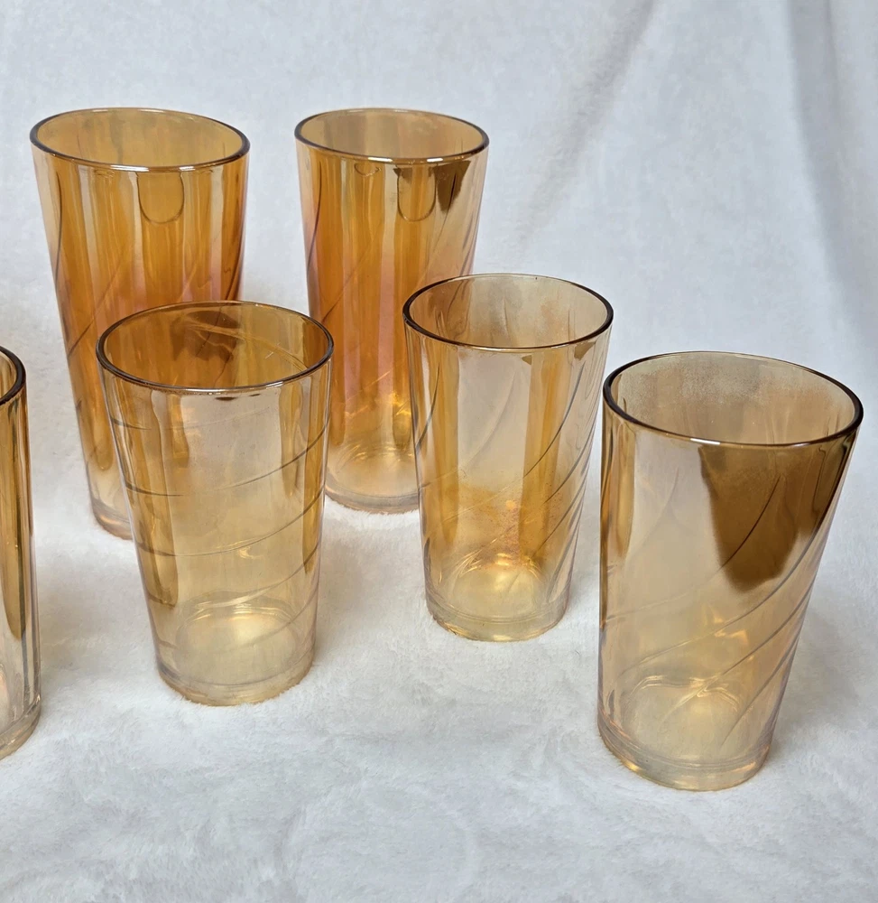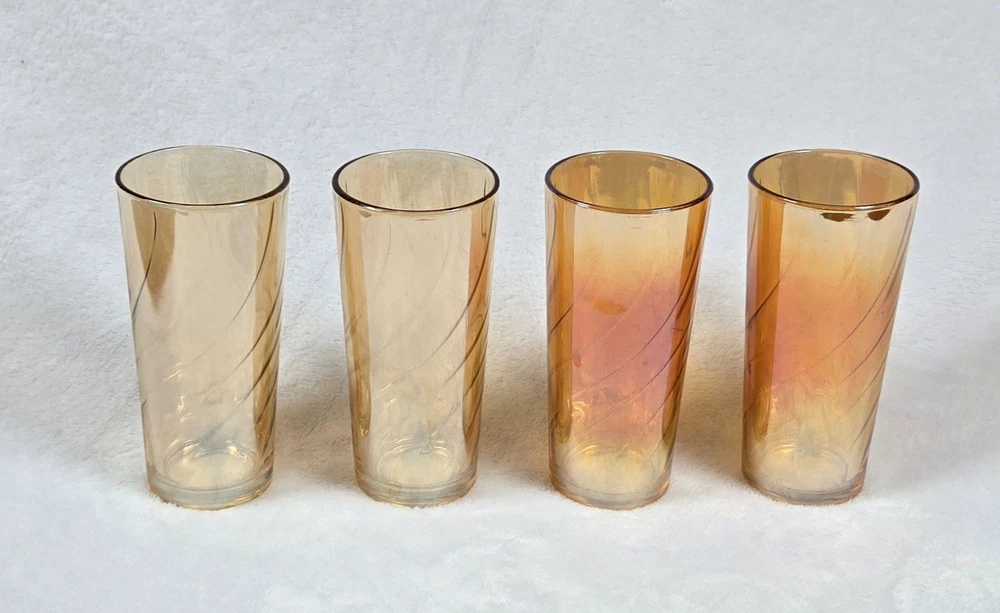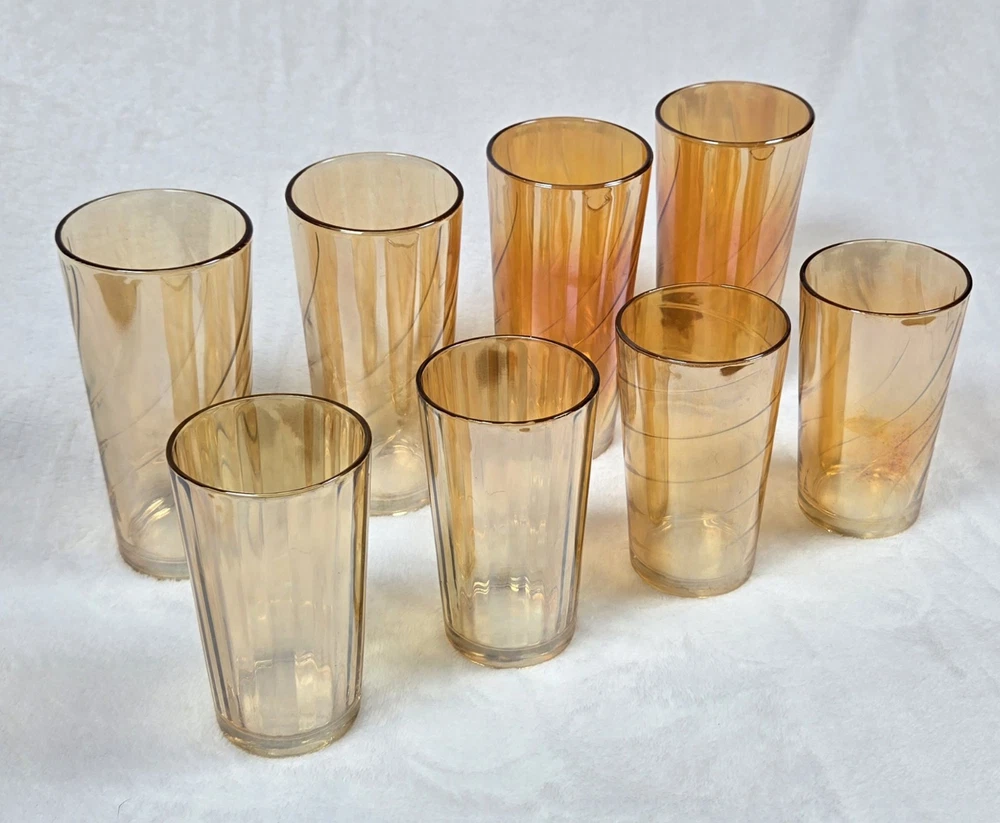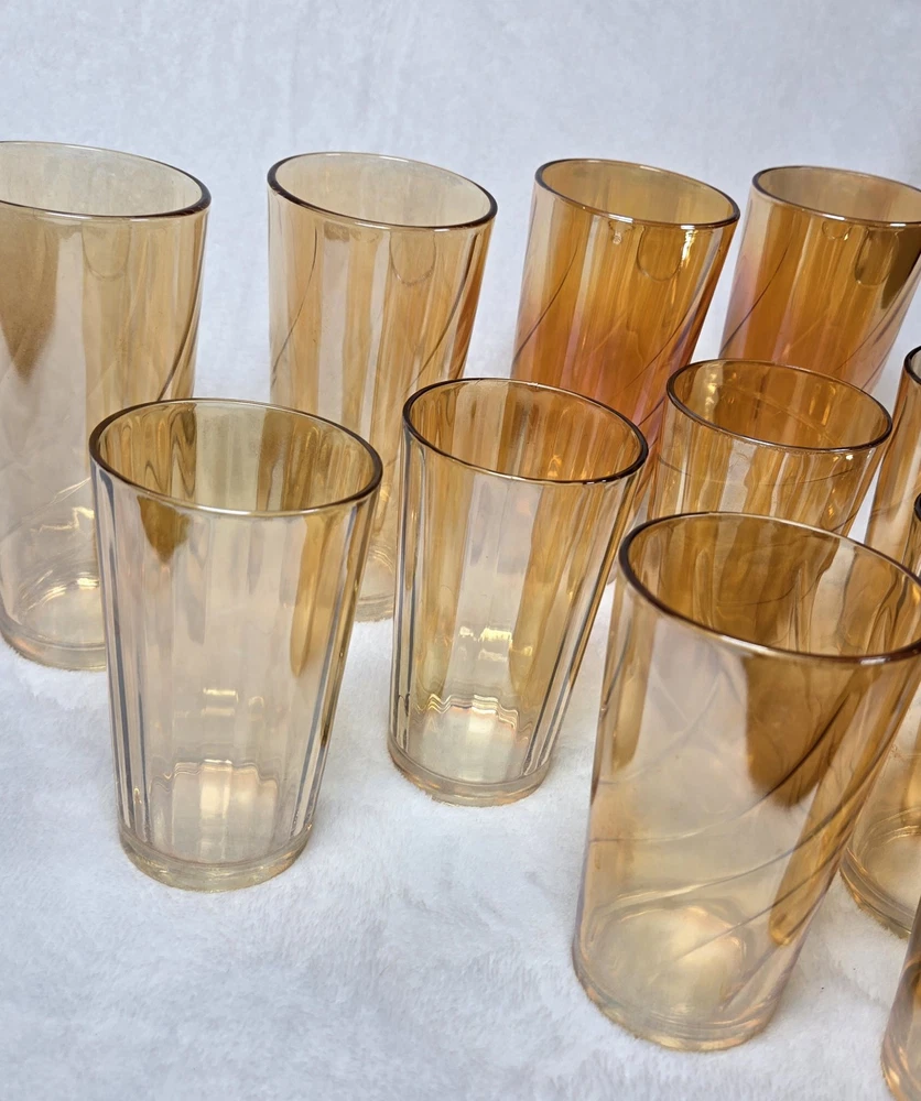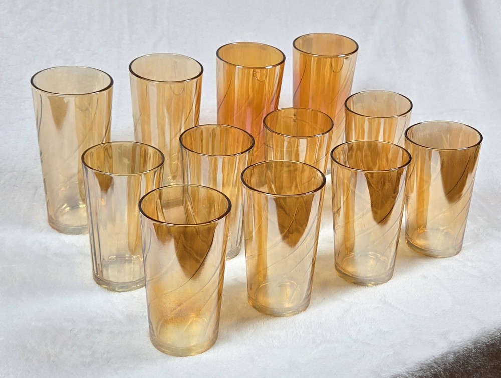 Vintage Set Of 12 Jeanette Iridescent Carnival Glasses-Marigold Spiral Swirl Please feel free to ask any questions you may have. Thank you for looking. *** 3 of the glasses have a slightly different pattern on them. *** 4 of the glasses are the same size, and 8 are the same size.