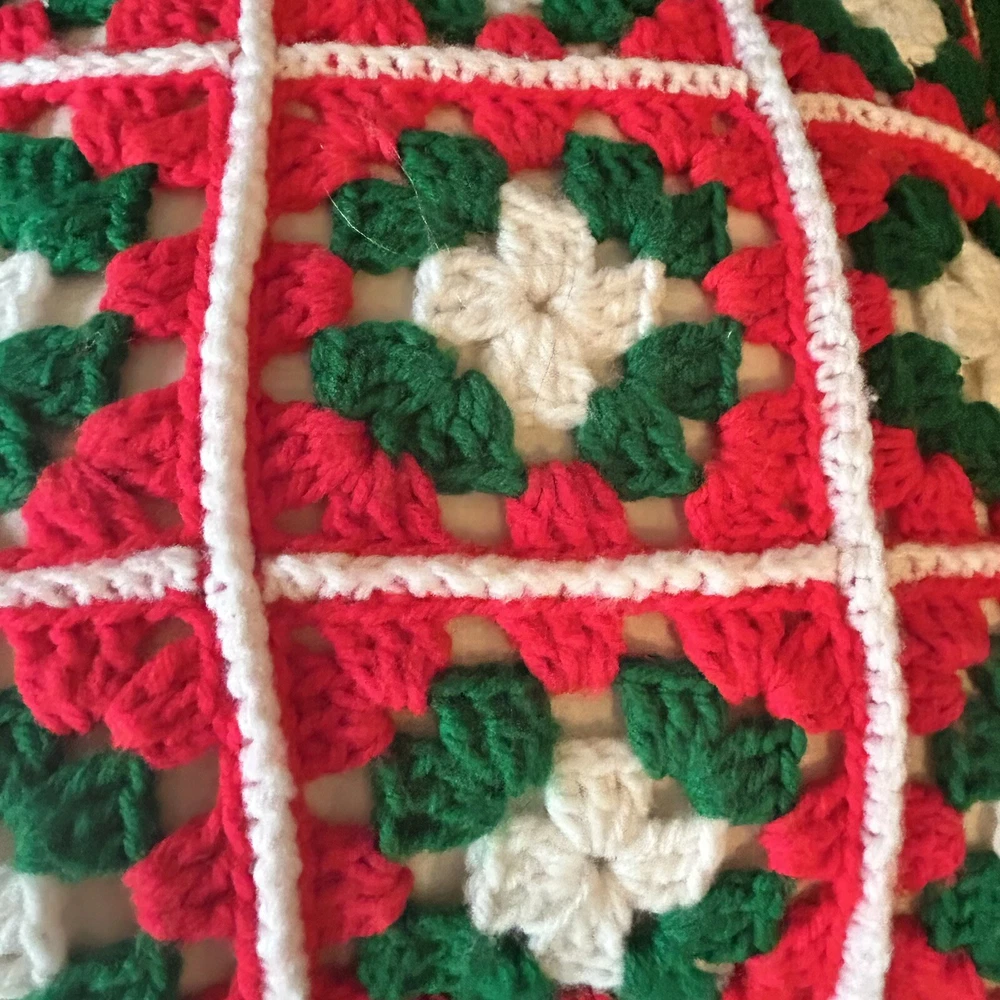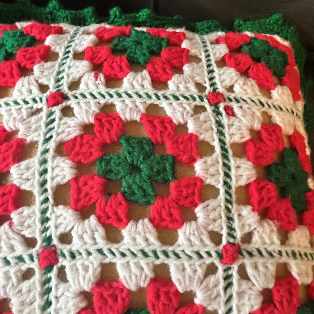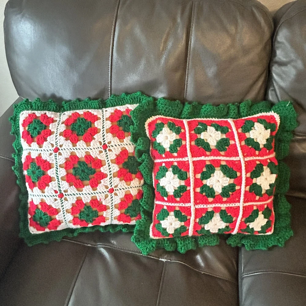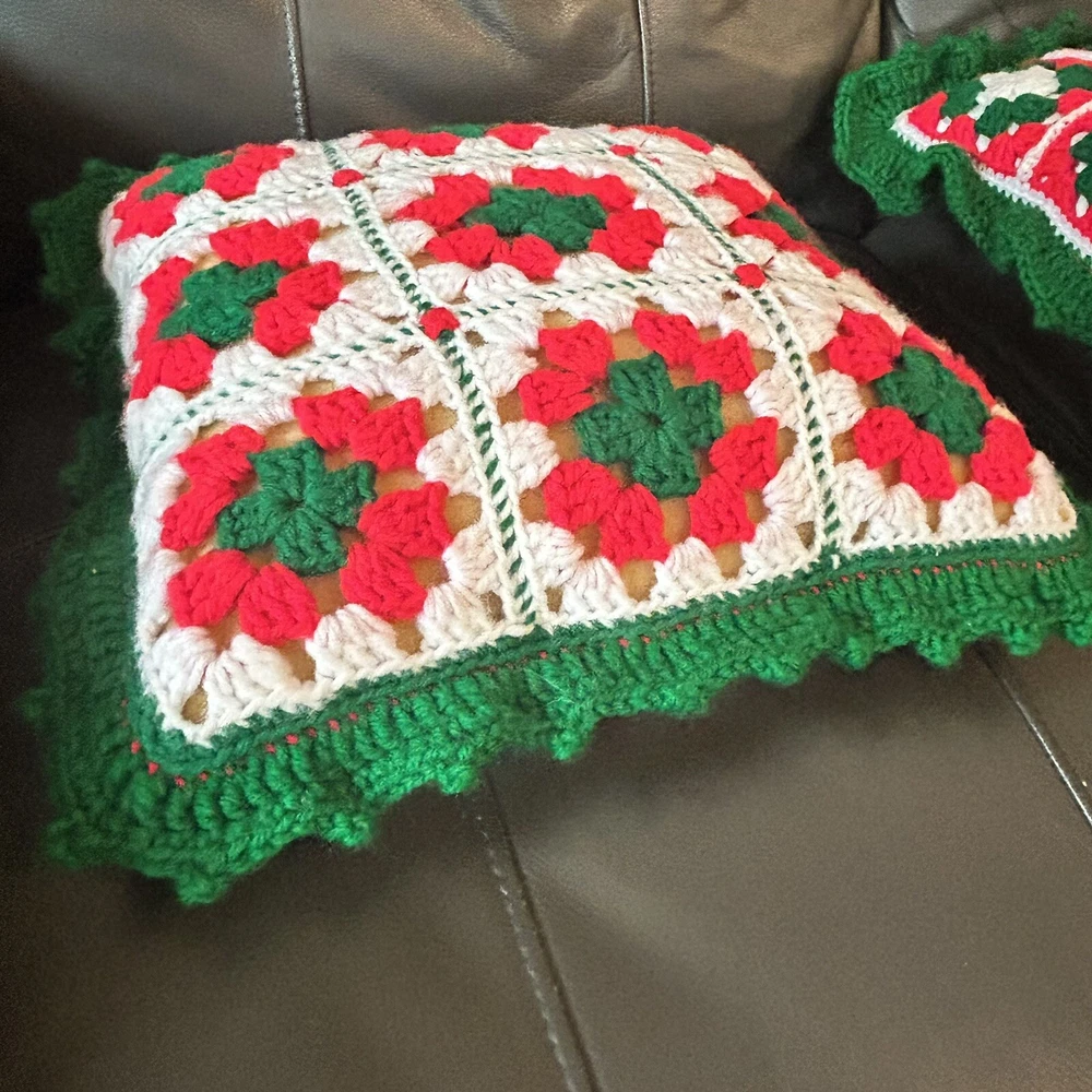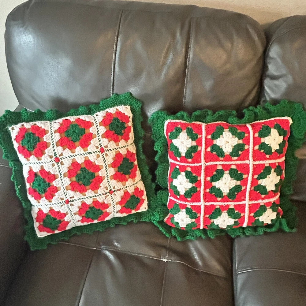 Vintage set of 2 granny square crochet throw pillows. Christmas colors of red, green and white. Includes foam pillows inside. Red background measures 17” x 17” and white background is 15” x 15”.