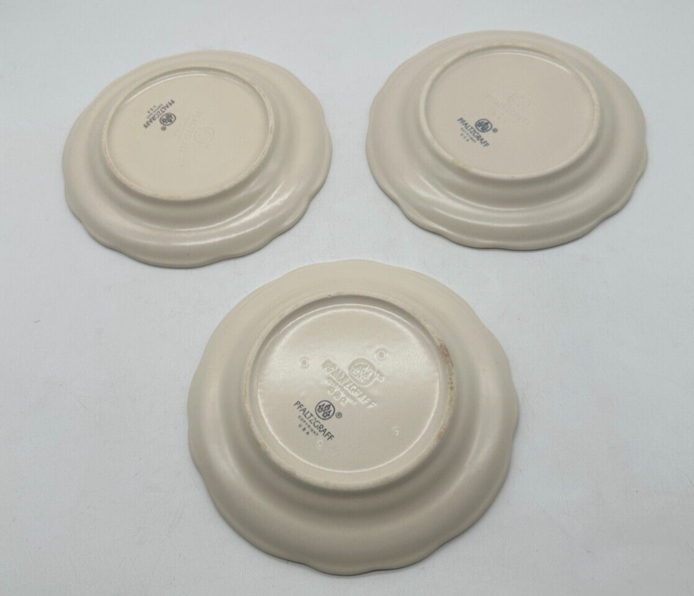 This is a vintage set of 3 Pfaltzgraff Tea Rose salad bread plates featuring a floral pink pattern. The plates are made of stoneware and the set includes a salad plate, bread plate, and plate. Ideal for serving bread and salad with a charming floral design.